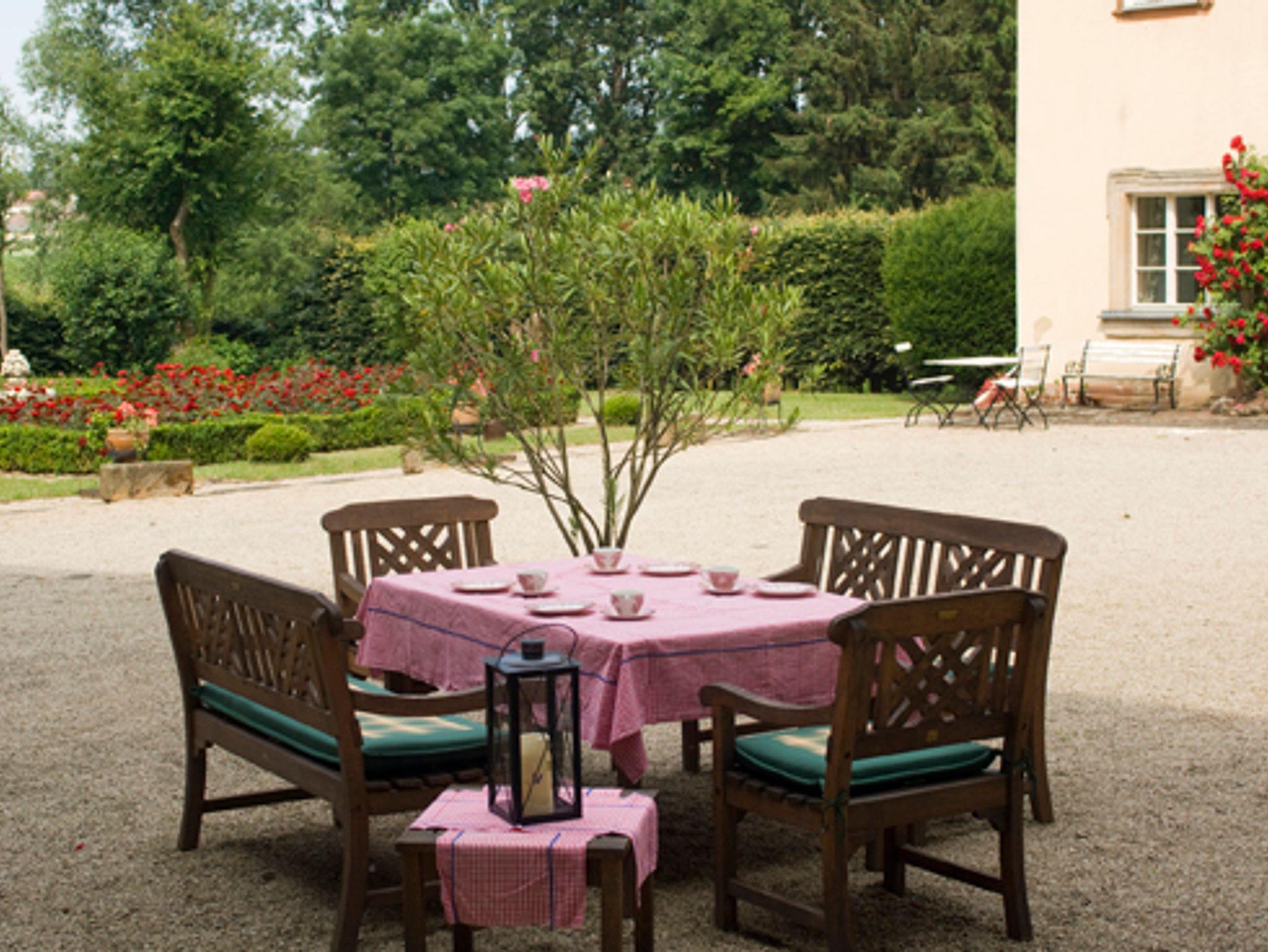 Hier genießen Sie den zauberhaften Blick in den Rosengarten im Innenhof, nach Nord-Osten zur idyllischen Flussbegrünung. Wer Glück und Muse hat, kann die Rehe über den Fluss springen sehen und sie beim Äsen beobachten.
