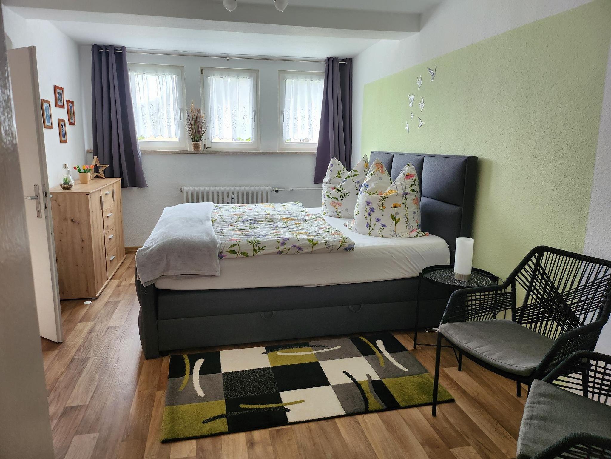 • Doppelzimmer „Gartenblick“ mit 1 Boxspringbett 180x200, großer Kleiderschrank,1 Kommode,