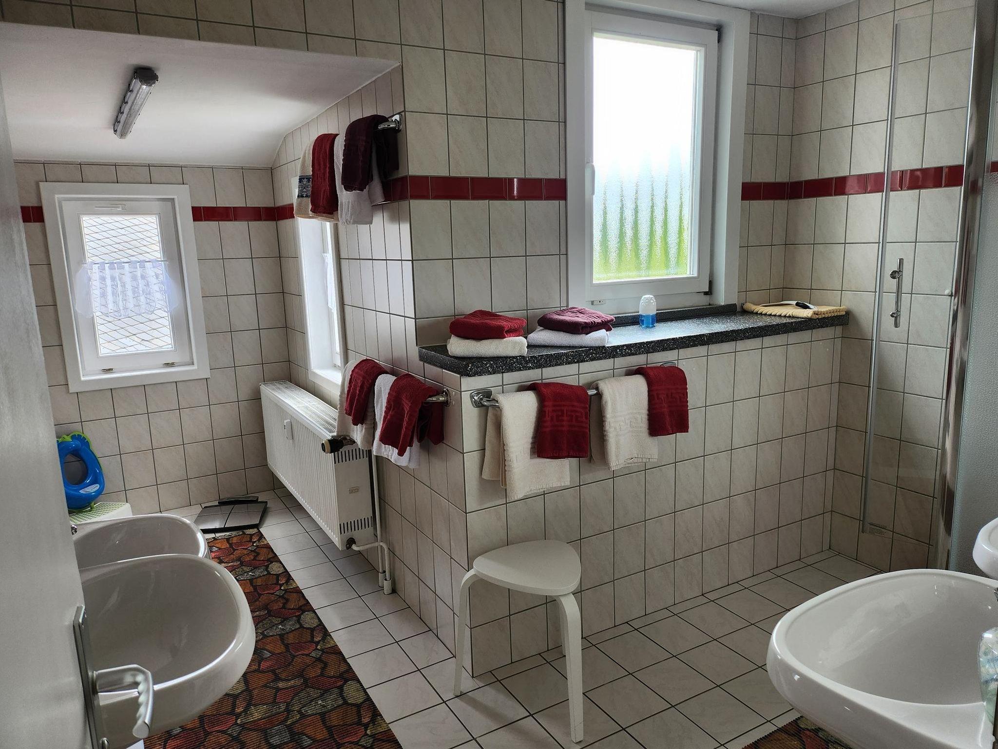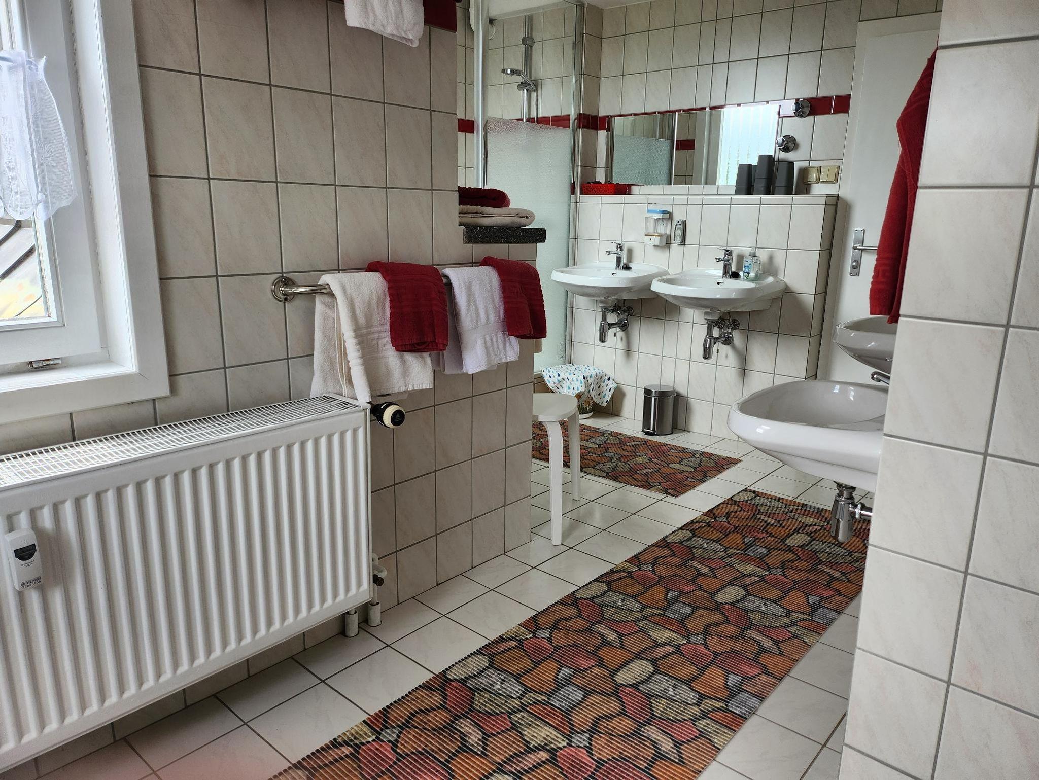 • Badezimmer mit 1 Dusche und 2 Toiletten im selben Raum getrennt durch eine Wand, 3 Wasch-/1 Kinderwaschbecken.