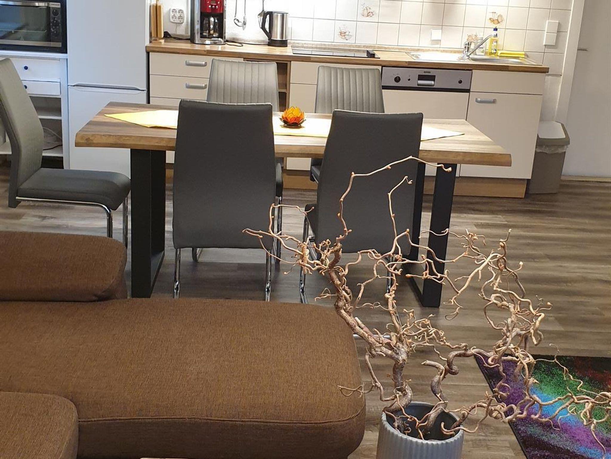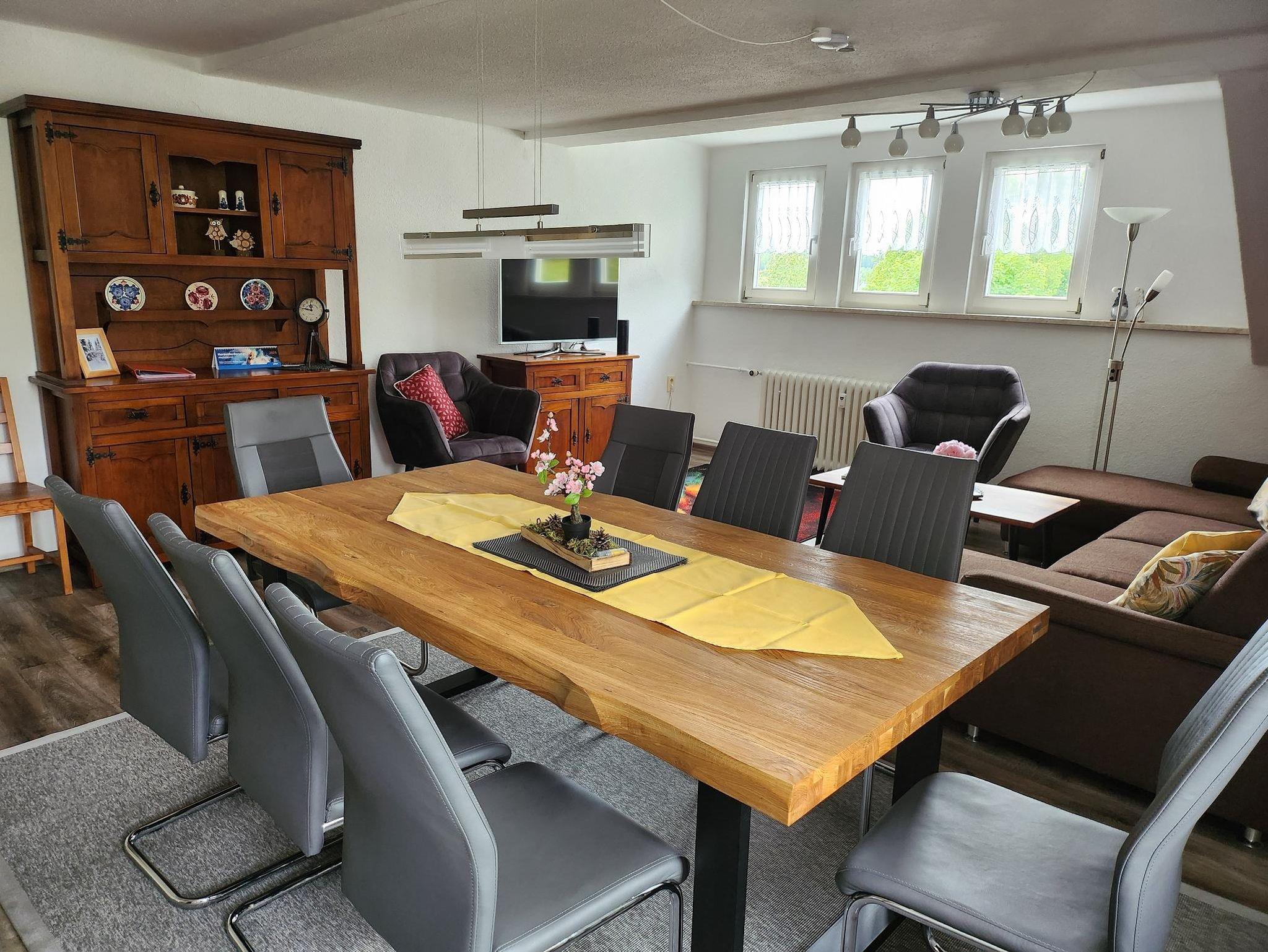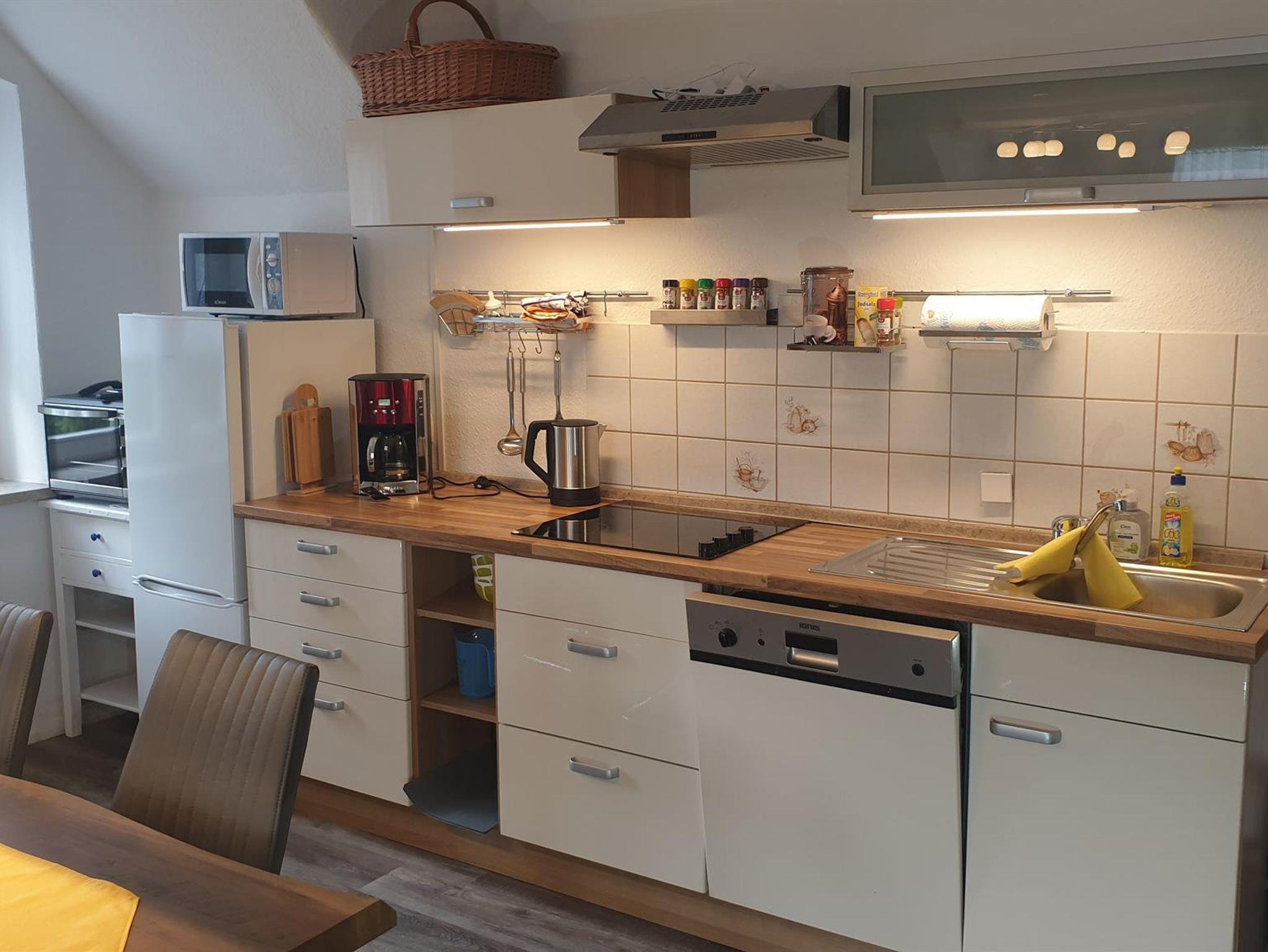 • Wohnstube mit integrierter Küchenzeile ca. 36 m² groß mit Geschirrspüler,Mini-Backofen,Kühlschrank,Gefrierschrank,Ceranfeld, Kaffeemaschine,Wasserkocher,Mikrowelle,Toaster,Esstisch für 8 Personen, LED-TV und einem gemütlichen Ecksofa.