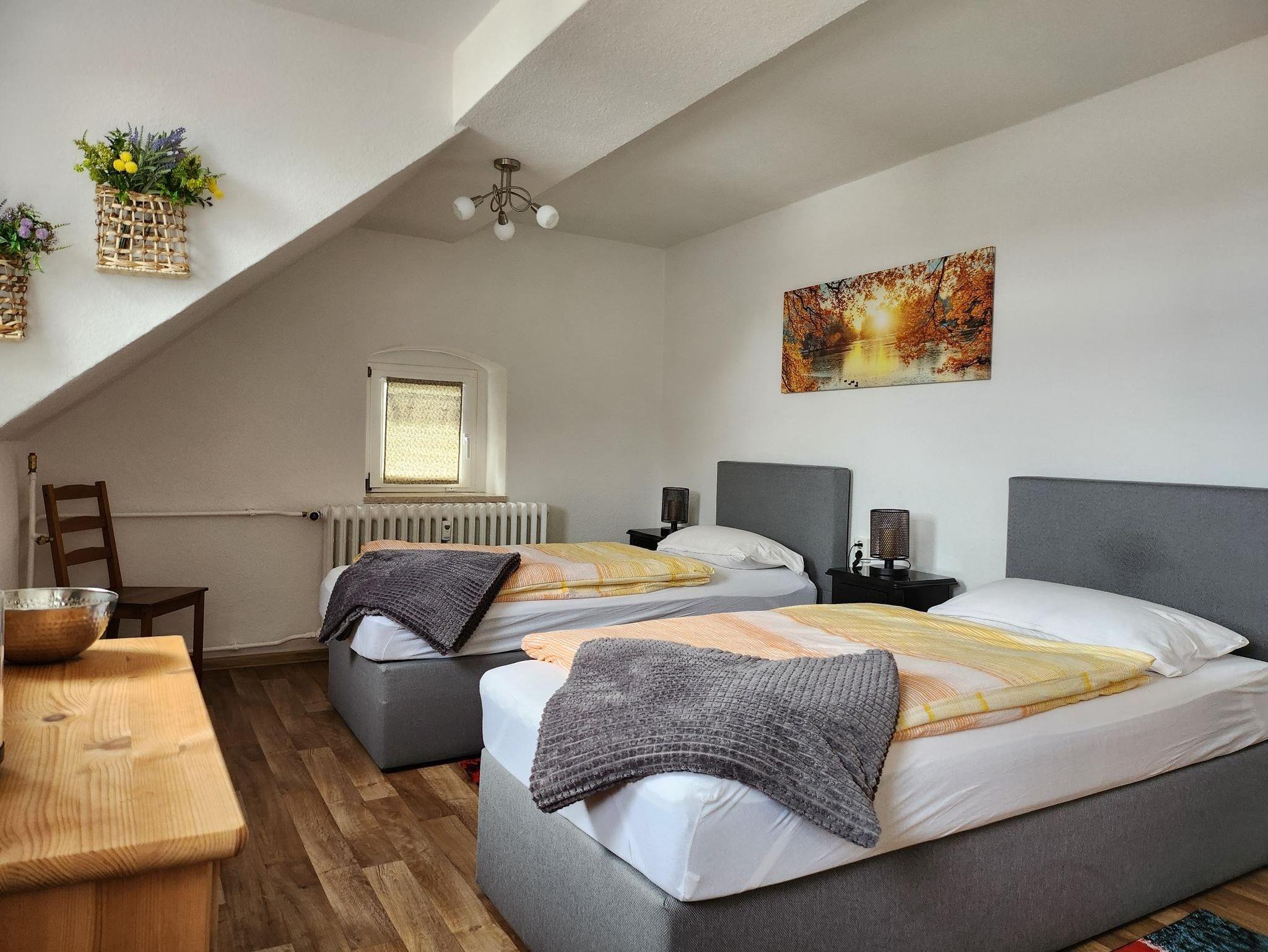 Doppelzimmer “ Talblick“ mit 2 Boxspringbetten 90×200 , Kleiderschrank, Kommode , 1 kleines Zimmerwaschbecken.