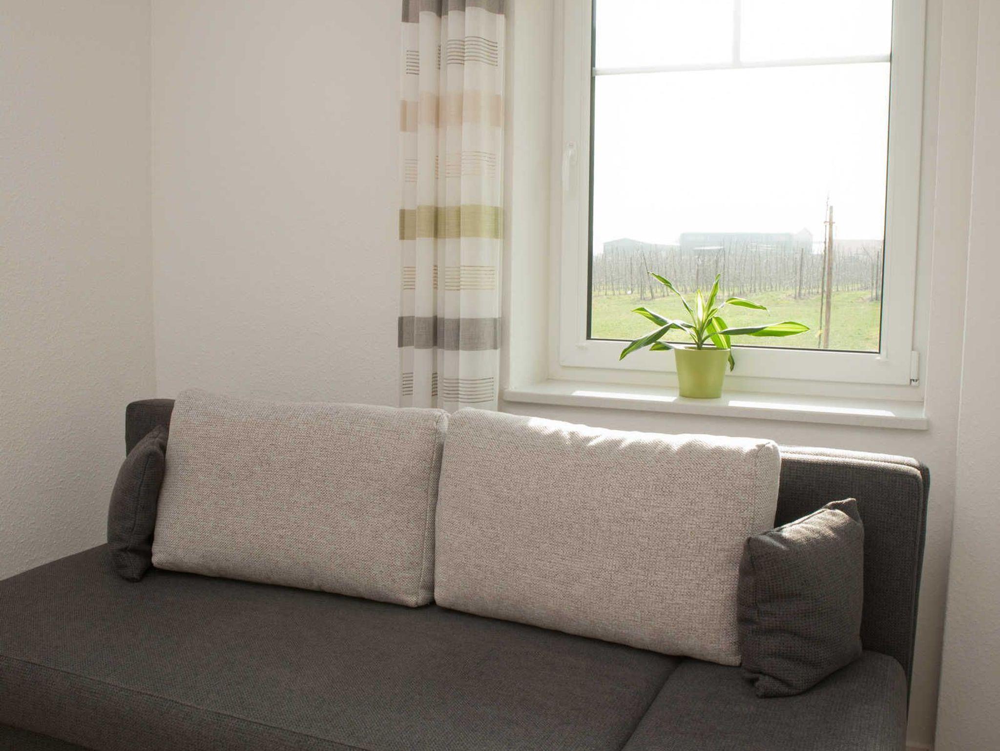 Ferienwohnung mit zwei Schlafräumen. Wohnzimmer mit Küchenzeile, Badezimmer sowie Terrasse zum Obsthof.