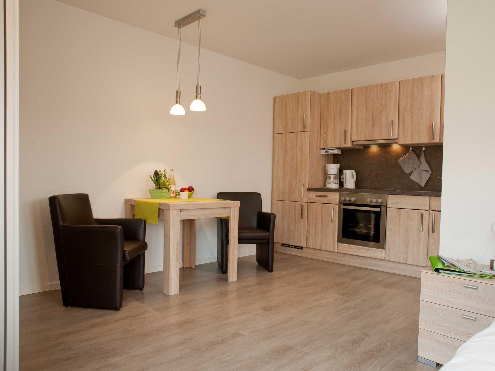 Modern ausgestattetes Ein-Raum-Appartement mit Doppelbett und Küchenzeile, Badezimmer mit Dusche sowie Terrasse.