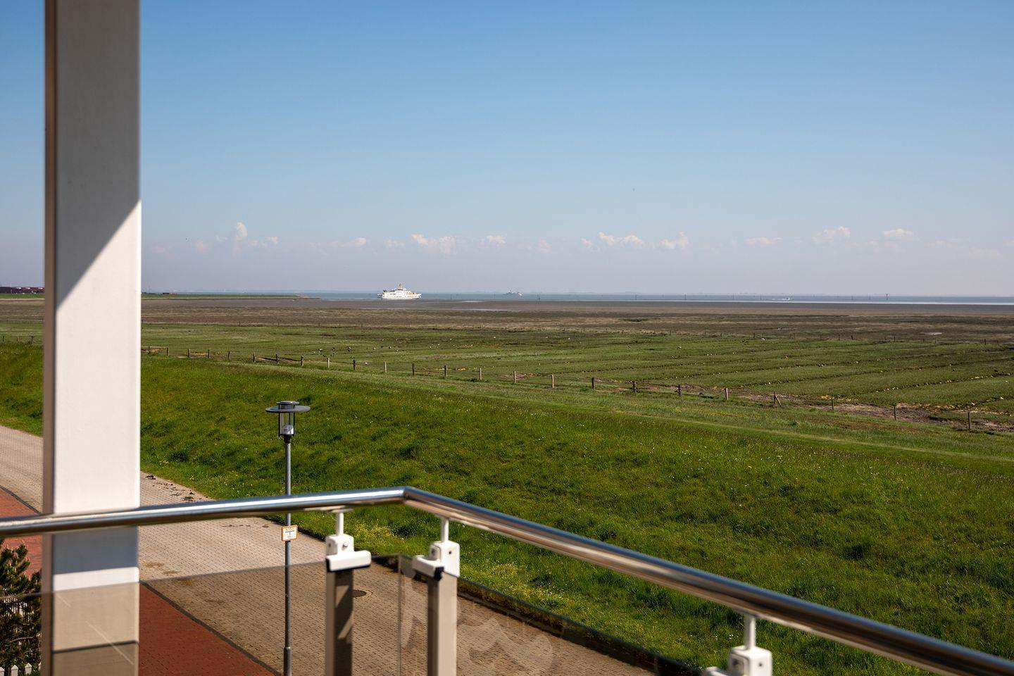 Der Balkon zur Südseite hat eine Fläche von etwa 5m² mit Blick über die Hellerwiesen und das Watt.