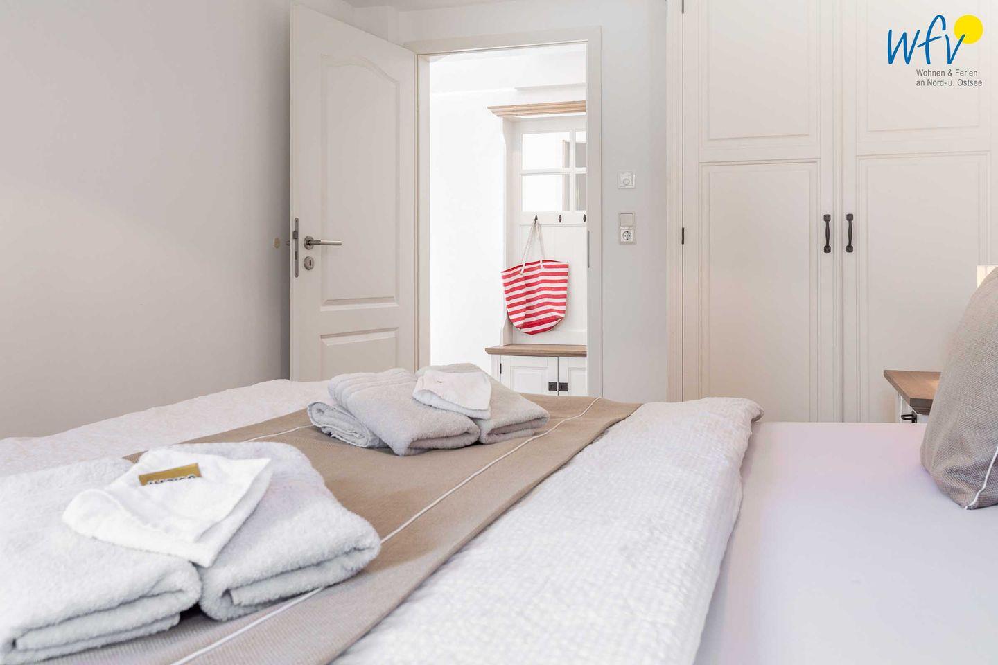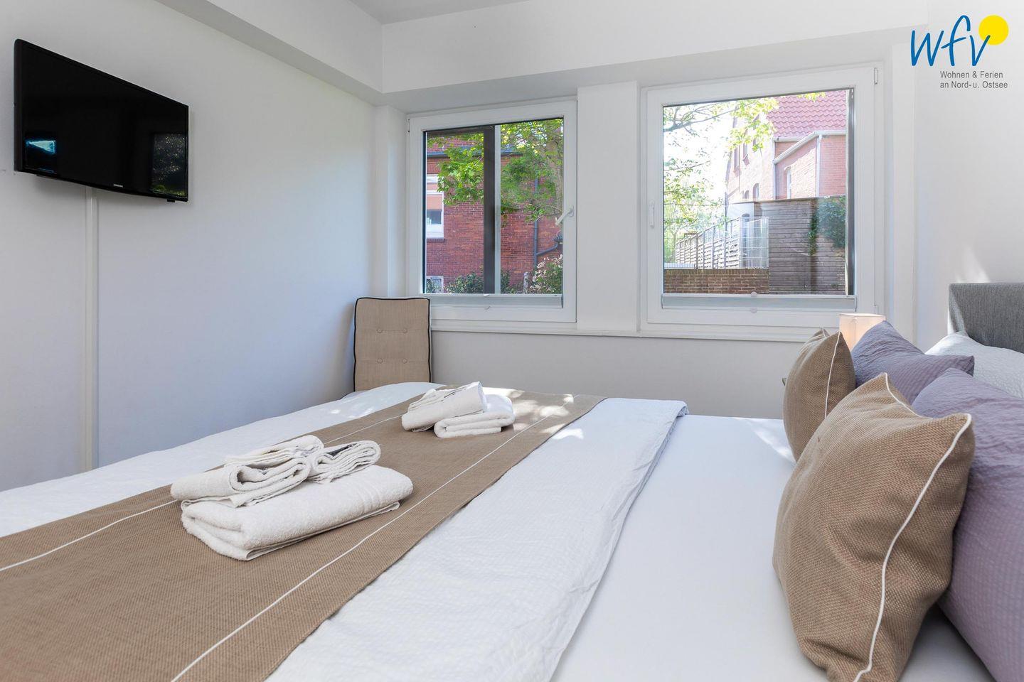 Zwei separate und freundlich eingerichtete Schlafzimmer bieten Ihnen angenehme Rückzugsmöglichkeiten. Beide Zimmer verfügen über ein komfortables Doppelbett (180 x 200 cm) und ein modernes TV.