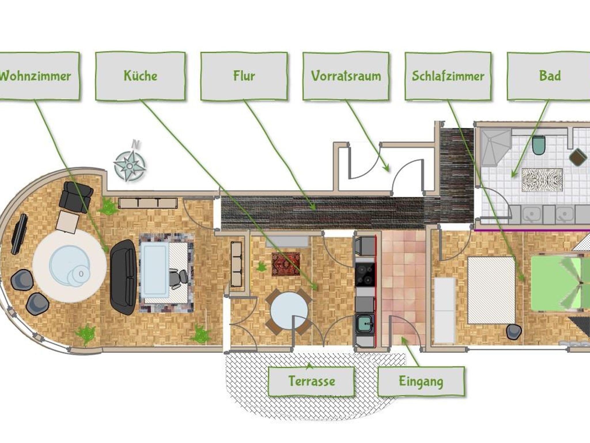 Mit Küche, Bad, Wohn- und Schlafzimmer auf 90 m² Fläche ist die Wohnung ideal für zwei Personen geeignet.