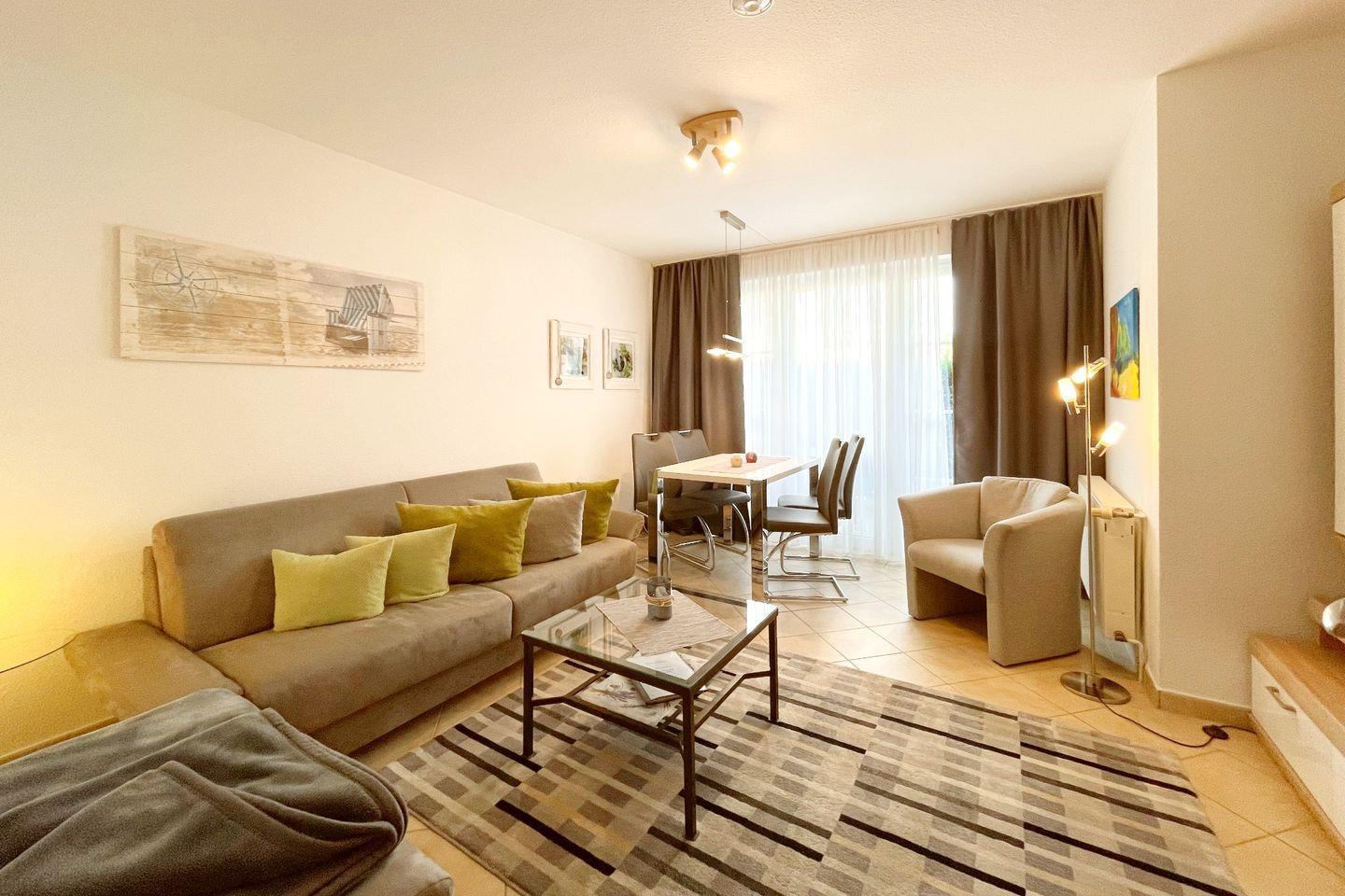 Die Ferienwohnung besteht aus einem großzügigen Schlafzimmer und einem einladenden Wohnzimmer, das mit einer Sofaecke, einem Esstisch und Fernseher ausgestattet ist. Hier können Sie entspannte Abende verbringen und die Zeit gemeinsam genießen. Die voll ausgestattete, geschlossene Küche lässt keine Wünsche offen: Von einem Cerankochfeld über einen Backofen und eine Spülmaschine bis hin zu Geschirr und Besteck – alles ist vorhanden, um sich selbst zu versorgen. Wenn Sie nach einem langen Tag am Strand zurückkehren, können Sie sich in der hellen, freundlich gestalteten Dusche mit Badewanne erfrischen oder entspannen.