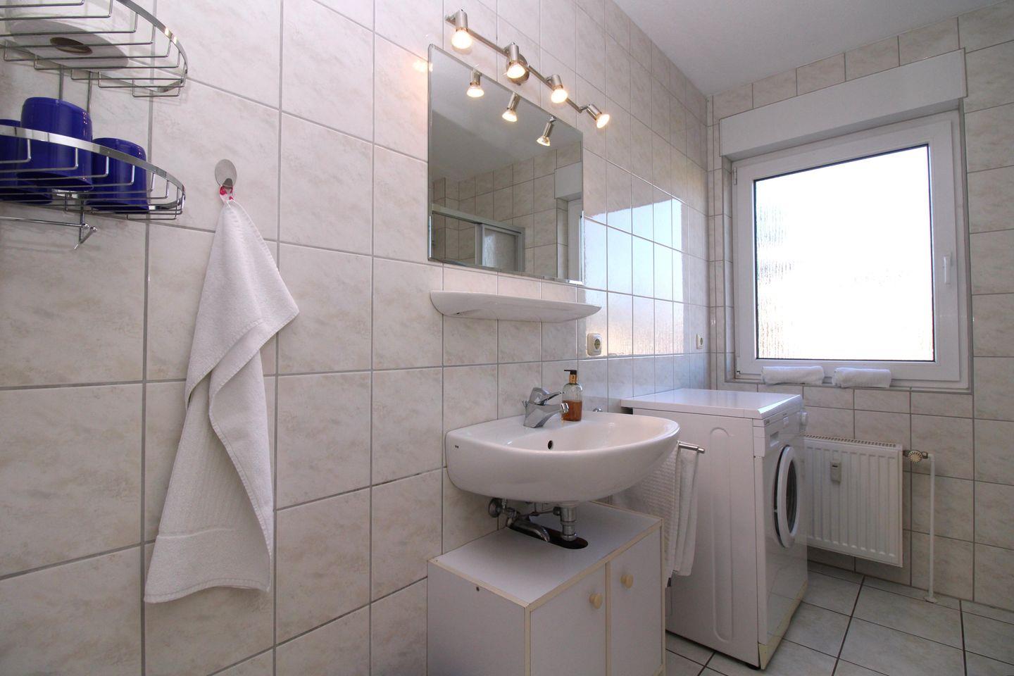 Das helle Badezimmer (mit Tageslicht / Fenster) verfügt über eine Dusche, Waschbecken mit Unterschrank, WC, einen Föhn sowie einen Kosmetikspiegel. Die sich hier befindliche Waschmaschine kann von den Gästen kostenfrei mitbenutzt werden.