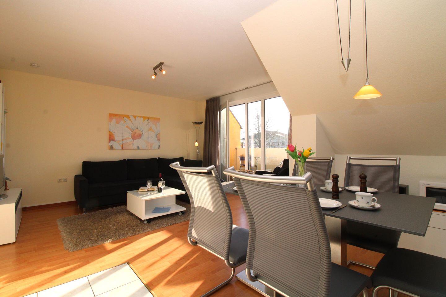 Das moderne und großzügige Wohn-/Esszimmer verfügt über eine separate Sitzgruppe mit bequemer (Schlaf-)Couch und Couchtisch, einen separaten Esstisch mit 5 Stühlen sowie eine kleine Schrankwand. Vom Wohnbereich aus haben Sie direkten Zugang zu dem sonnigen Balkon (nach Süd-Westen ausgerichtet) mit Balkontisch und 2 Stühlen. Hier sitzen Sie entspannt und gemütlich im Grünen und können abends bei einem guten Glas Wein in Ruhe die lauen Sommernächte genießen!