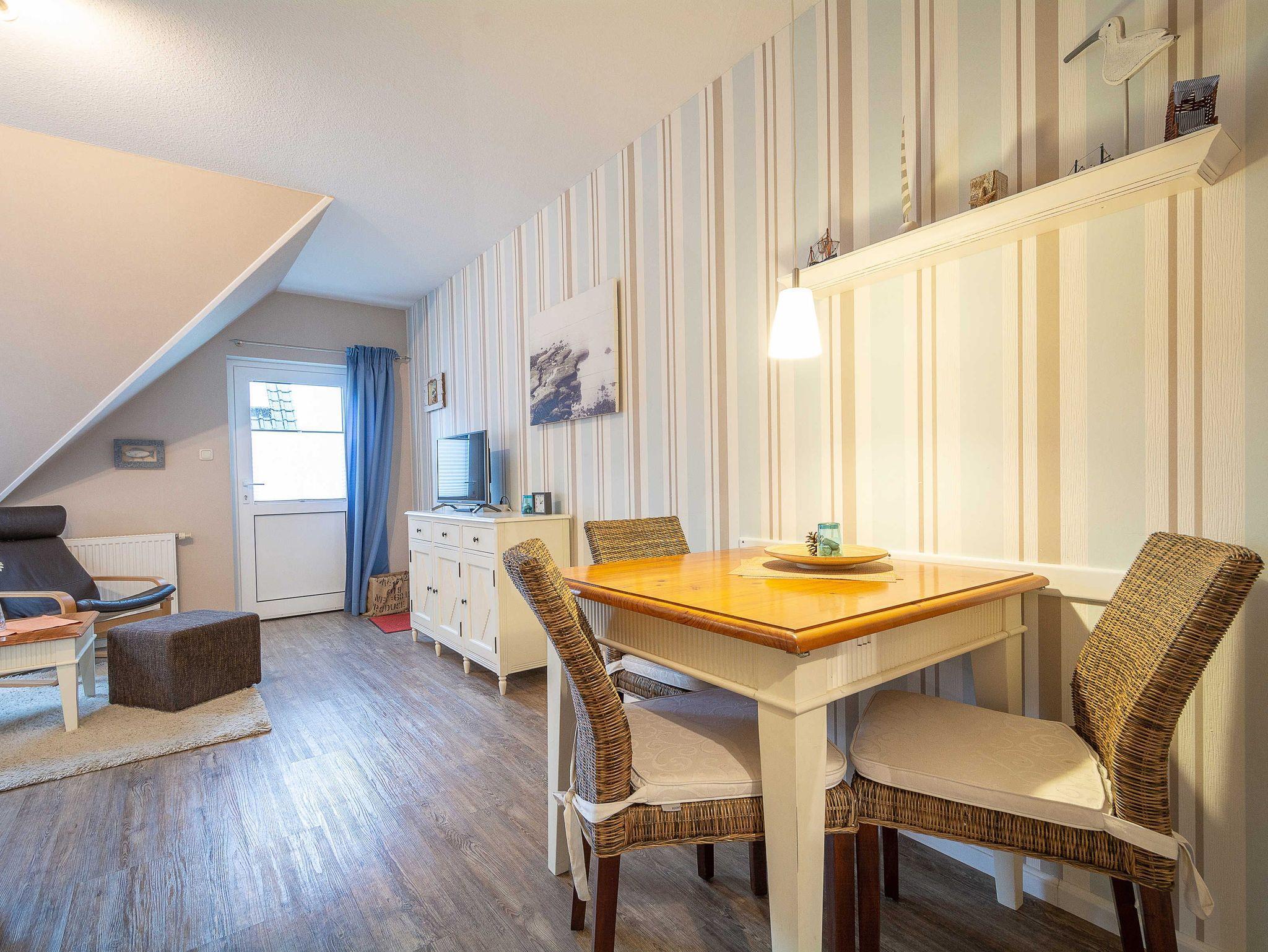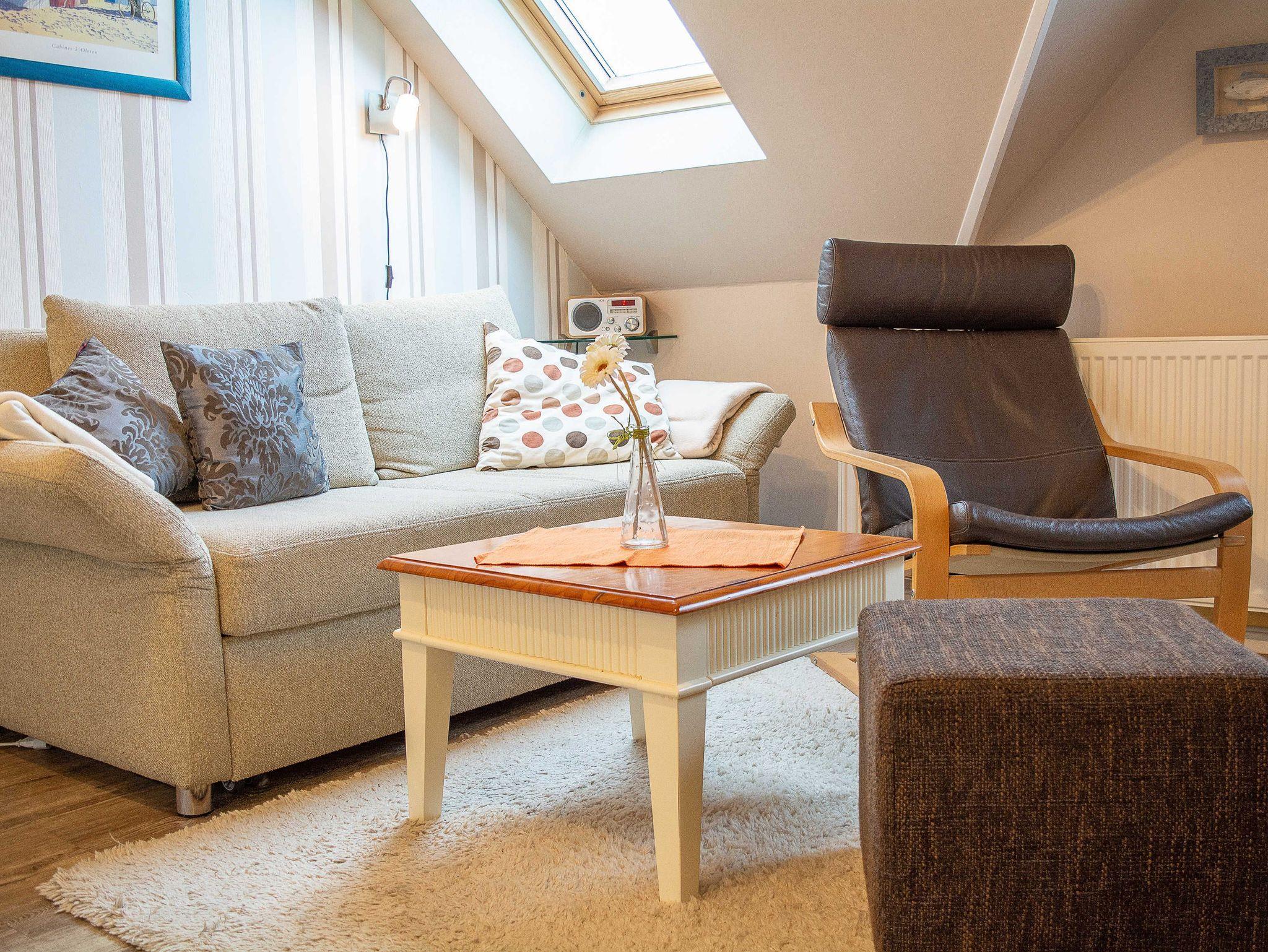 Über eine Außentreppe gelangen Sie zu Ihrer Ferienwohnung und betreten diese über den liebevoll eingerichteten Wohnraum. Der Wohnbereich ist mit einer Schlafcouch (ausgezogen 140cm x 150cm) und einem 31-Zoll Flatscreen-TV eingerichtet. Der angrenzende Essbereich bietet Ihnen reichlich Platz für gemeinsame Mahlzeiten. Die kleine integrierte Küchenzeile hält für Sie ein 2-Zonen-Cerankochfeld mit Dunstabzug, einen Kühlschrank mit Gefrierfach sowie eine Kaffeemaschine, ein Wasserkocher und ein Toaster bereit. Genügend Koch- und Essgeschirr vervollständigen die Kücheneinrichtung.