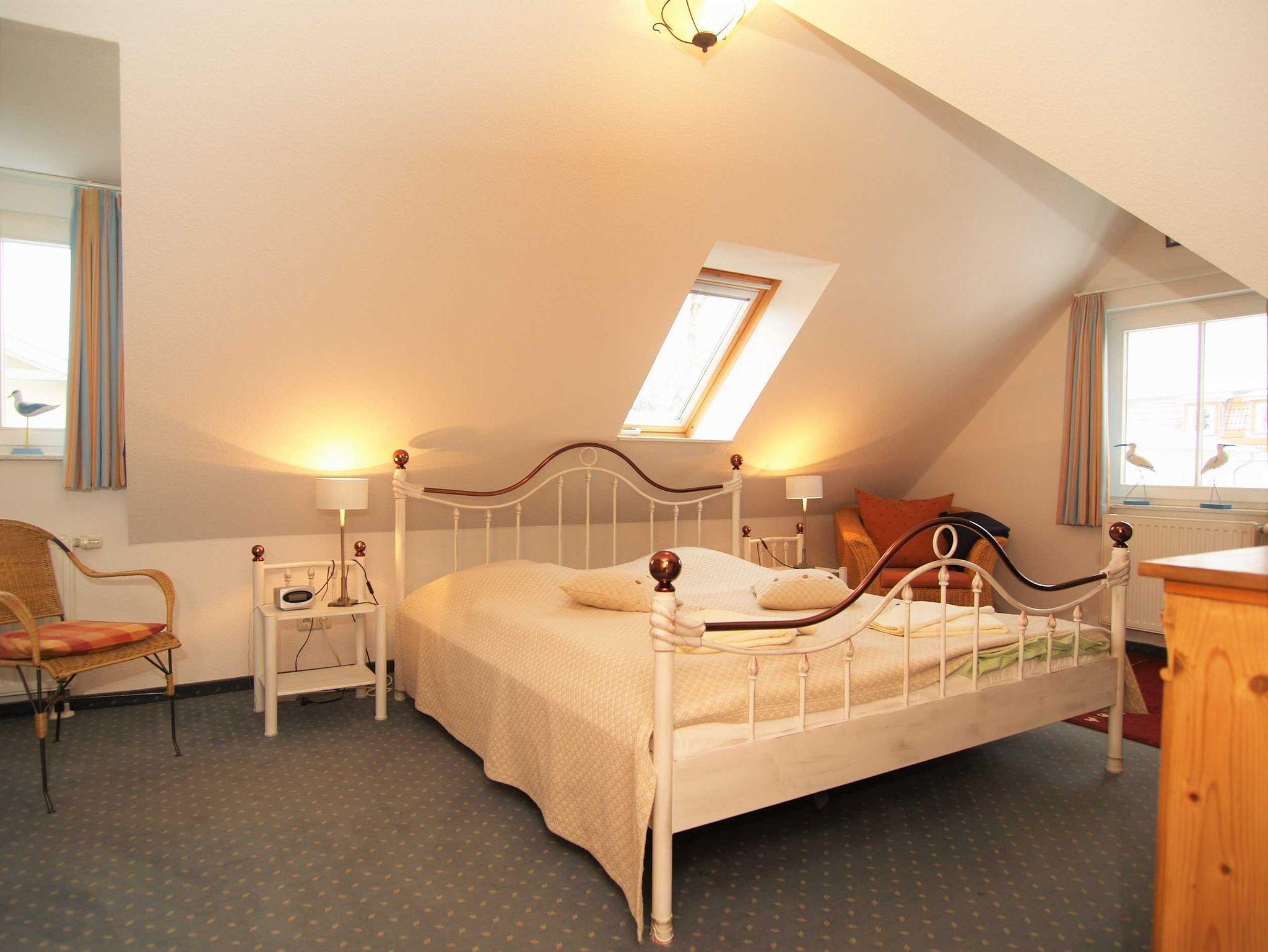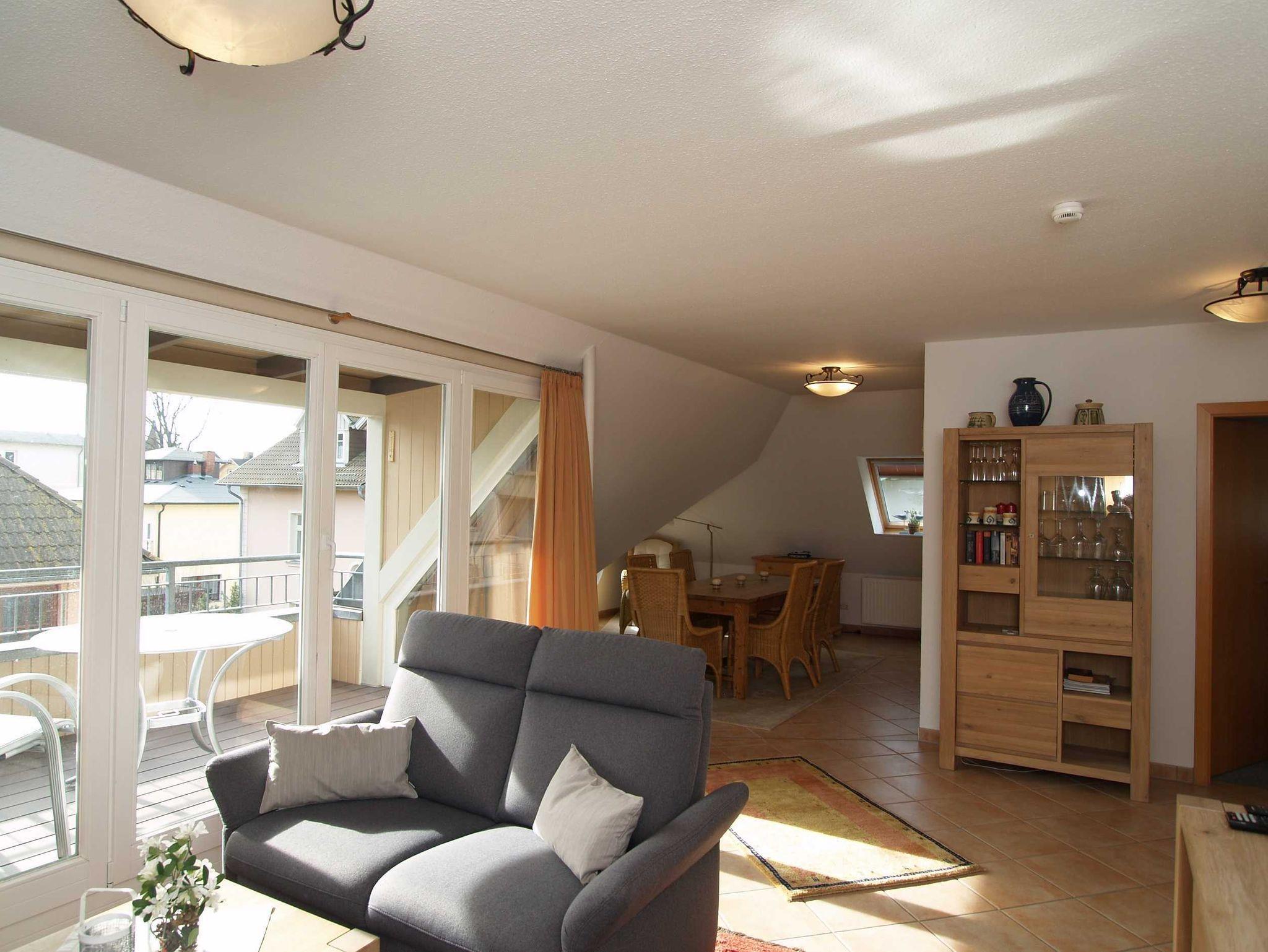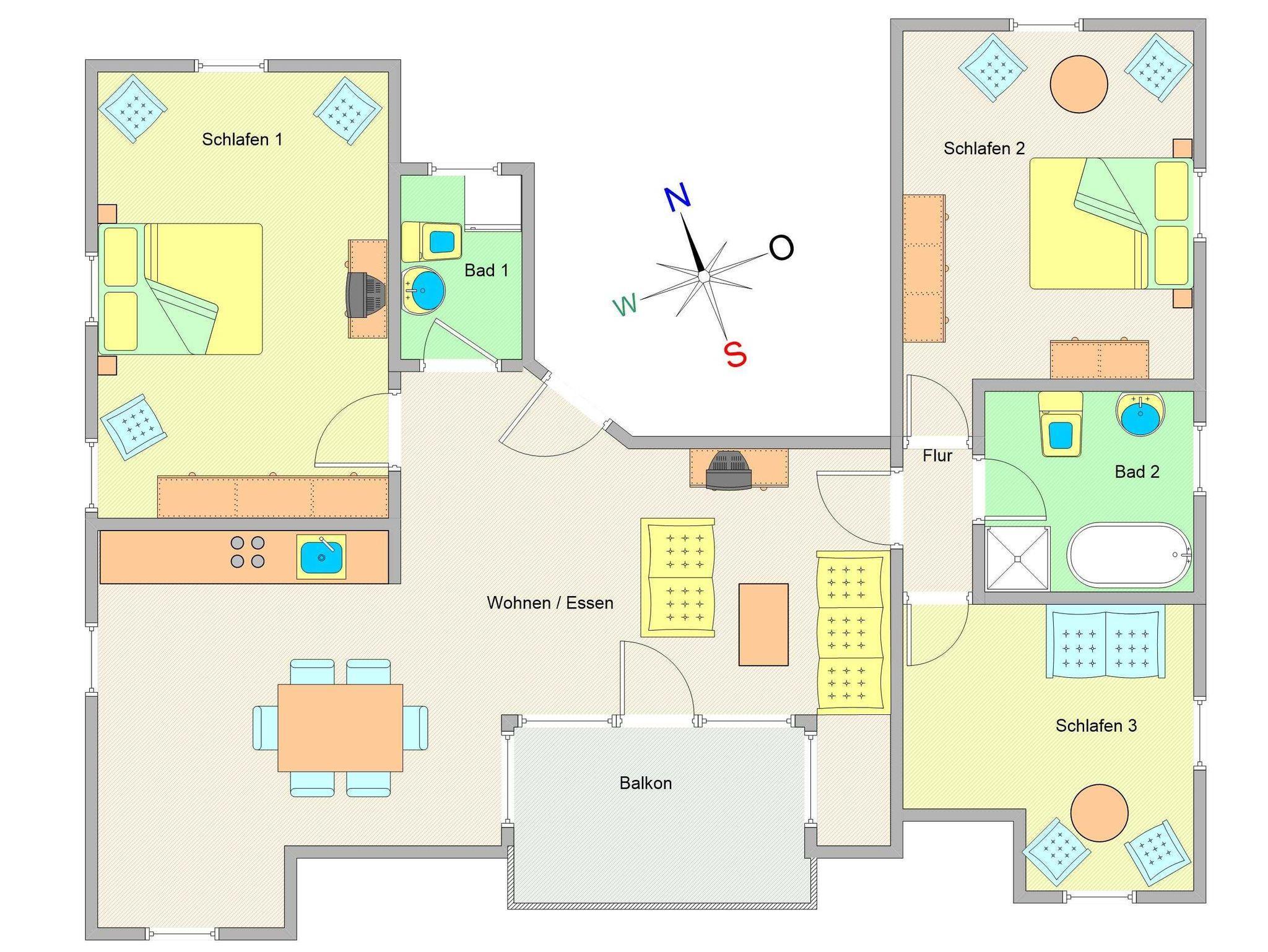 Sie entspannen sich in einer wunderschönen 4-Raum-Ferienwohnung von ca. 86 qm Größe, die sich im zweiten Obergeschoss des Appartementhauses „Rahlfs Hus“ befindet. Die Wohnung ist für 4 bis 6 Personen optimal geeignet und besticht durch ihre helle und freundliche Gestaltung. Es begrüßt Sie ein offener Wohnraum mit komfortabler Couchgarnitur, einem Sideboard mit Flachbild-TV und Radio. Dem Wohnbereich angrenzend befindet sich der Essbereich mit einem Esstisch für 6 Personen sowie die offene Küchenzeile. Die komfortabel eingerichtete Küche hält alle wichtigen Küchengeräte und -utensilien für Sie bereit, die Sie für Ihren Urlaub an der Ostsee benötigen (4-Platten-Cerankochfeld mit Backofen, Geschirrspüler, Mikrowelle, Kaffeemaschine, Wasserkocher und Toaster). Vom Wohnraum aus betreten Sie die Loggia in Richtung Süden, auf der Sie bei einem Glas Wein den Tag ausklingen lassen können. Zwei Schlafzimmer sind jeweils mit einem Doppelbett ausgestattet, ein Schlafzimmer verfügt über eine ausziehbare Schlafcouch für 2 Personen. Das geflieste Tageslichtbad mit Badewanne und separater Dusche sowie das Gäste-WC vervollständigen das Gesamtbild dieser Wohnung.