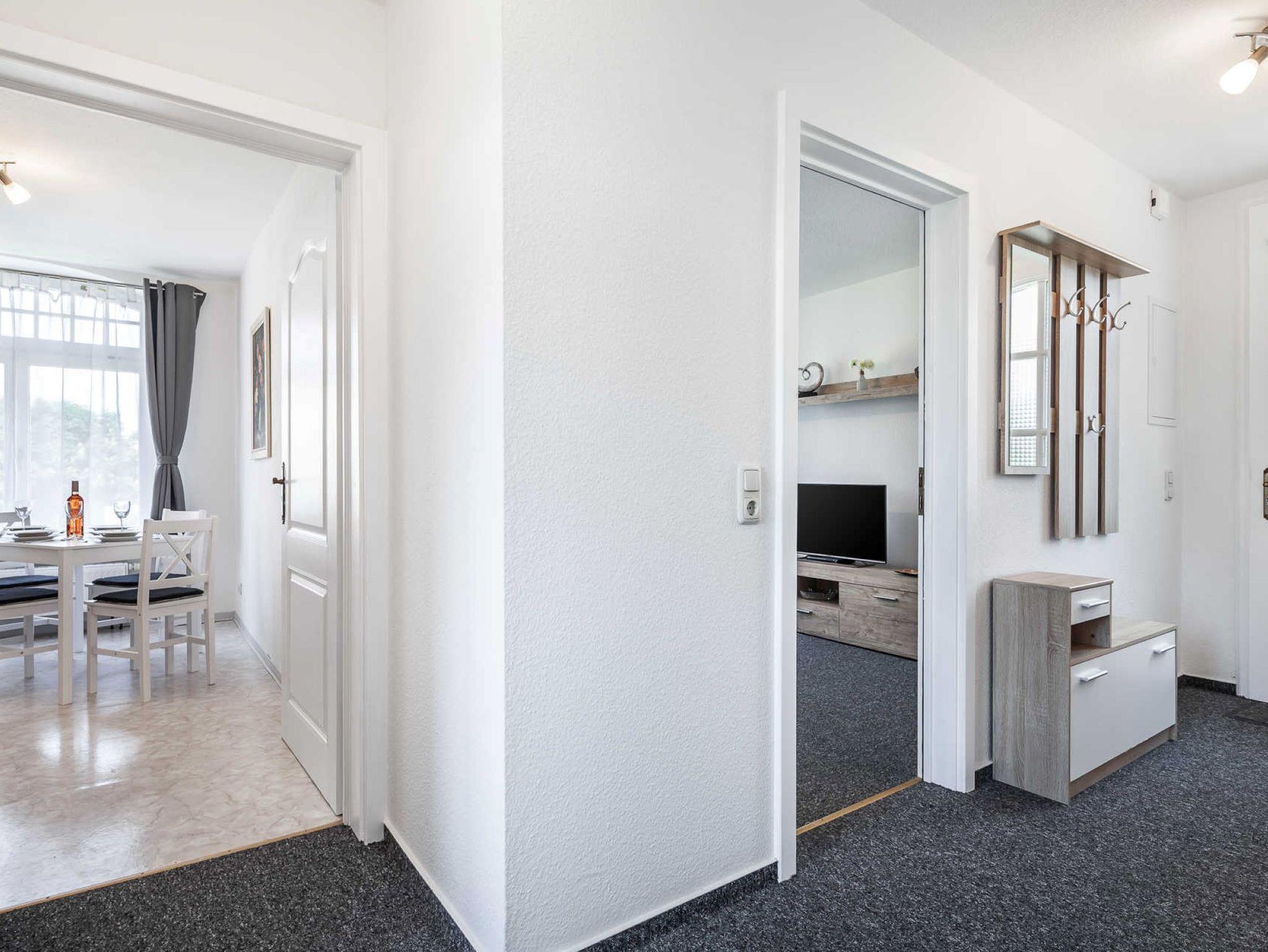 Die funktional gestaltete Ferienwohnung in der 1. Etage hat ein Wohnzimmer mit bequemer Sitzecke, eine Küche mit Esstisch und Stühle, ein Schlafzimmer mit Doppelbett, Nachttische, Kabel-Tv und einen Kleiderschrank, ein Gästezimmer mit Einzelbett und ein Balkon. Die funktionale Küche ist mit 4-Platten-Ceranfeld, Backofen, Kühlschrank, kleinen Gefrierschrank, Mikrowelle, Geschirrspüler, Kaffeemaschine, Wasserkocher, Toaster und div. Geschirr ausgestattet. Ein Bad mit Fenster, Dusche, Waschbecken und WC komplettieren den guten Gesamteindruck der Wohnung.