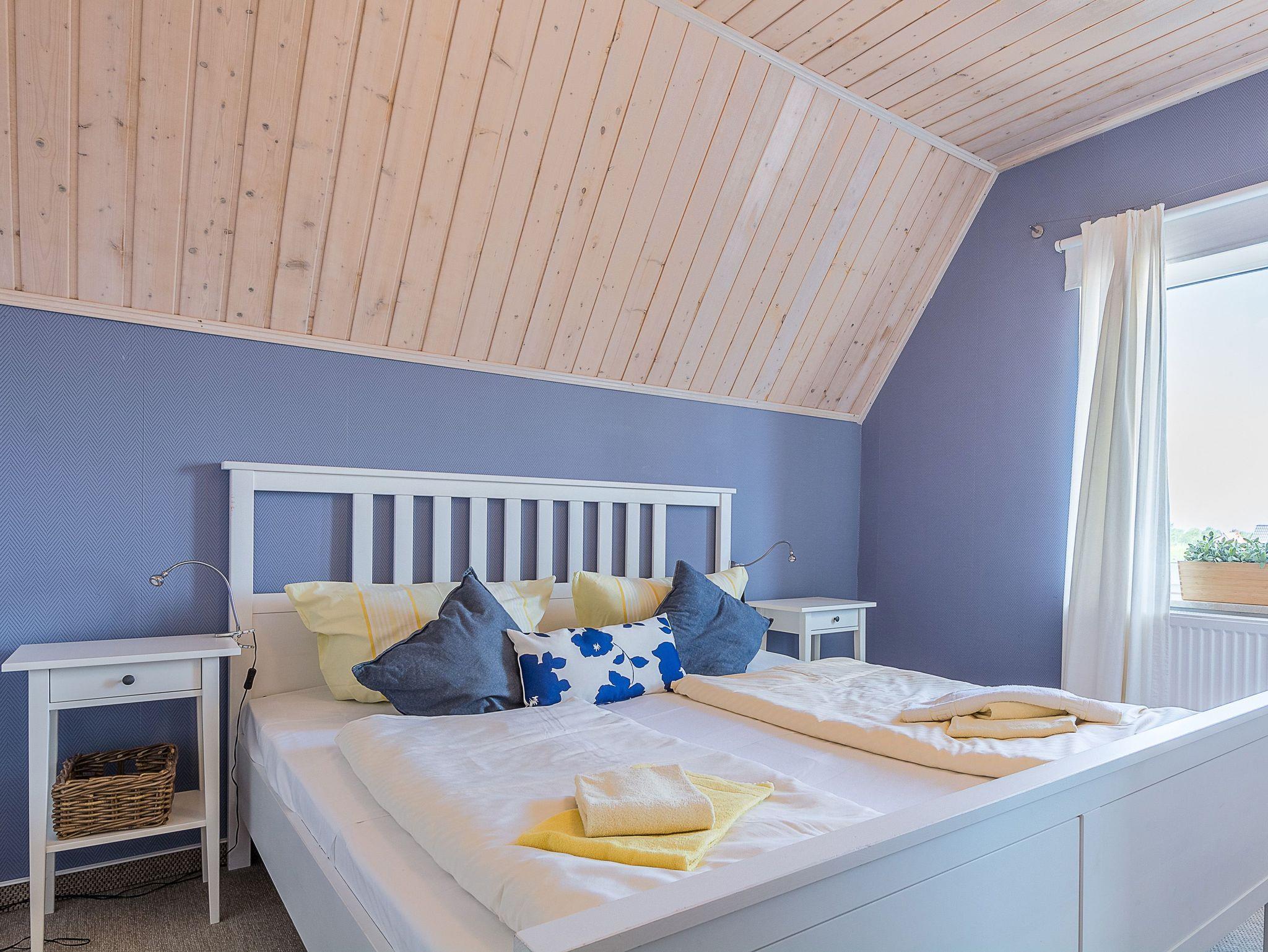 Sie wohnen in einem ca. 120 m² großen Ferienhaus, das über 2 Etagen verläuft. In der 1. Etage befindet sich der große Wohnraum mit einem geräumigen Essbereich und die separate moderne Küche mit 4-Platten Ceranfeld, Backofen, Geschirrspüler, Kühlschrank etc.. Von der Küche gelangen Sie auf den großzügigen Balkon und haben einen fantastischen Blick auf eine angrenzende Koppel. Auf dieser Etage befindet sich ebenfalls ein Gäste-WC. In der 2. Etage befinden sich die 3 Schlafräume (2x ein Doppelbett, 1x ein Kojenbett) und das Bad mit Badewanne, Dusche und WC, was das Gesamtbild dieses Hauses vervollständigen.
