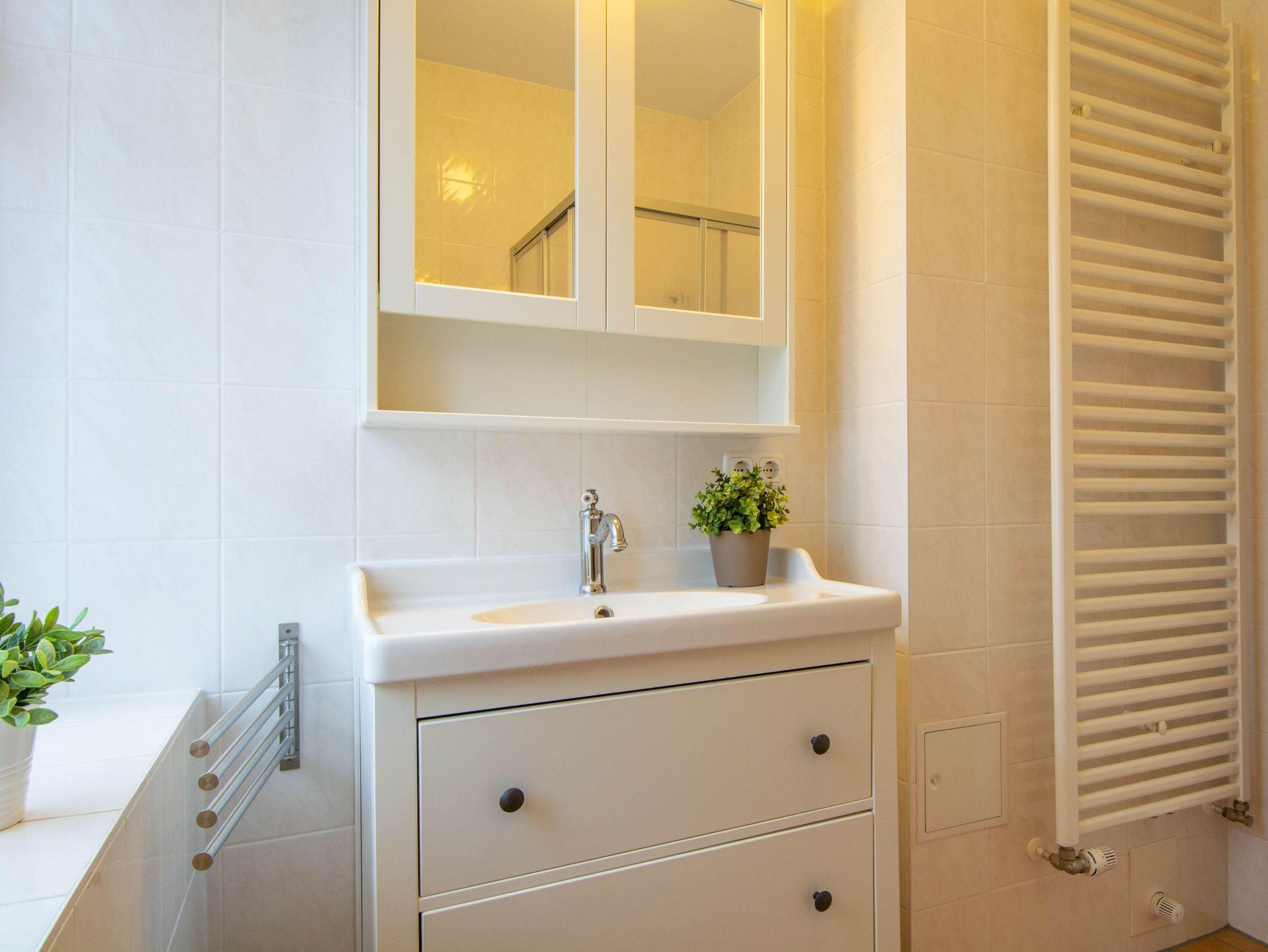 Das geflieste Tageslichtbad ist mit einer Duschkabine, Waschbecken und WC eingerichtet. Ein Handtuchheizkörper sorgt für kuschelig warme Handtücher und vervollständigt die Badeinrichtung.