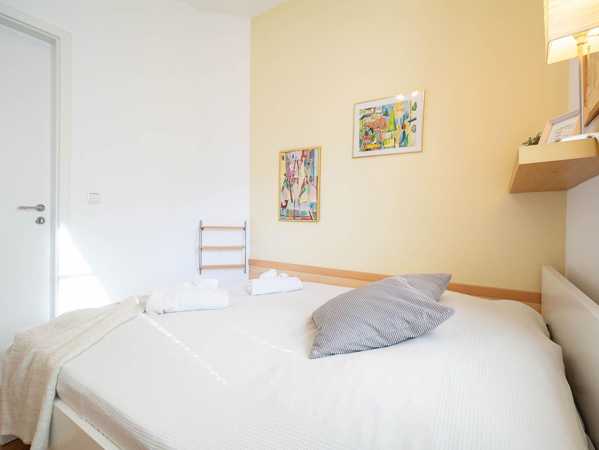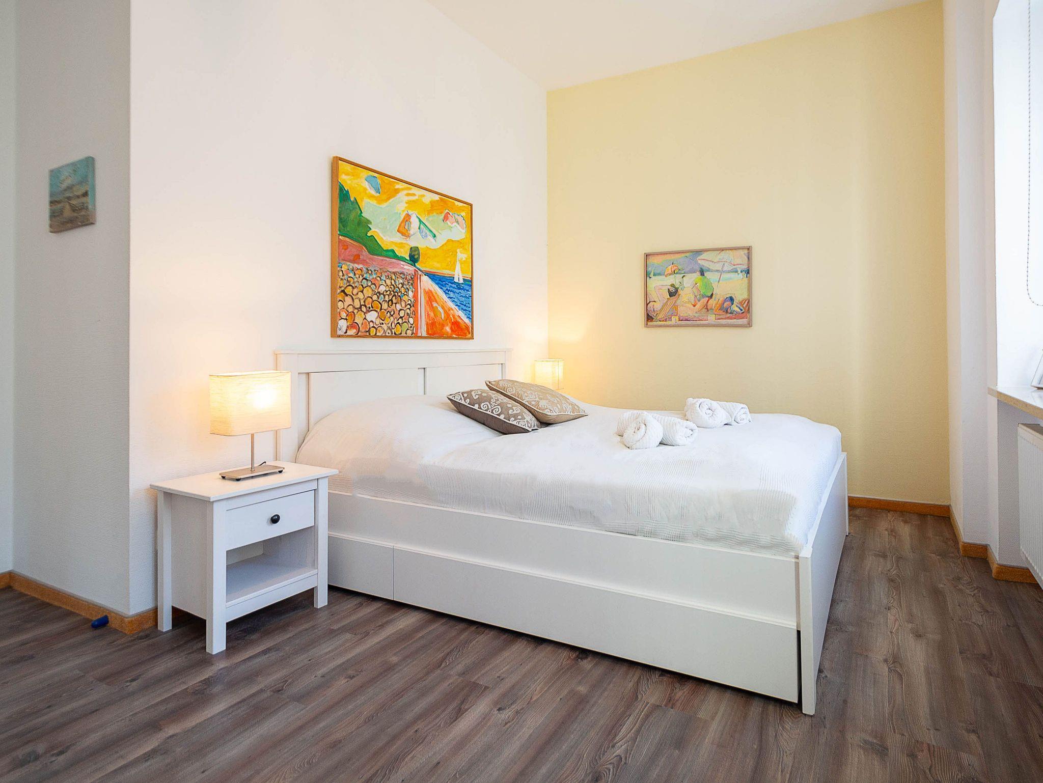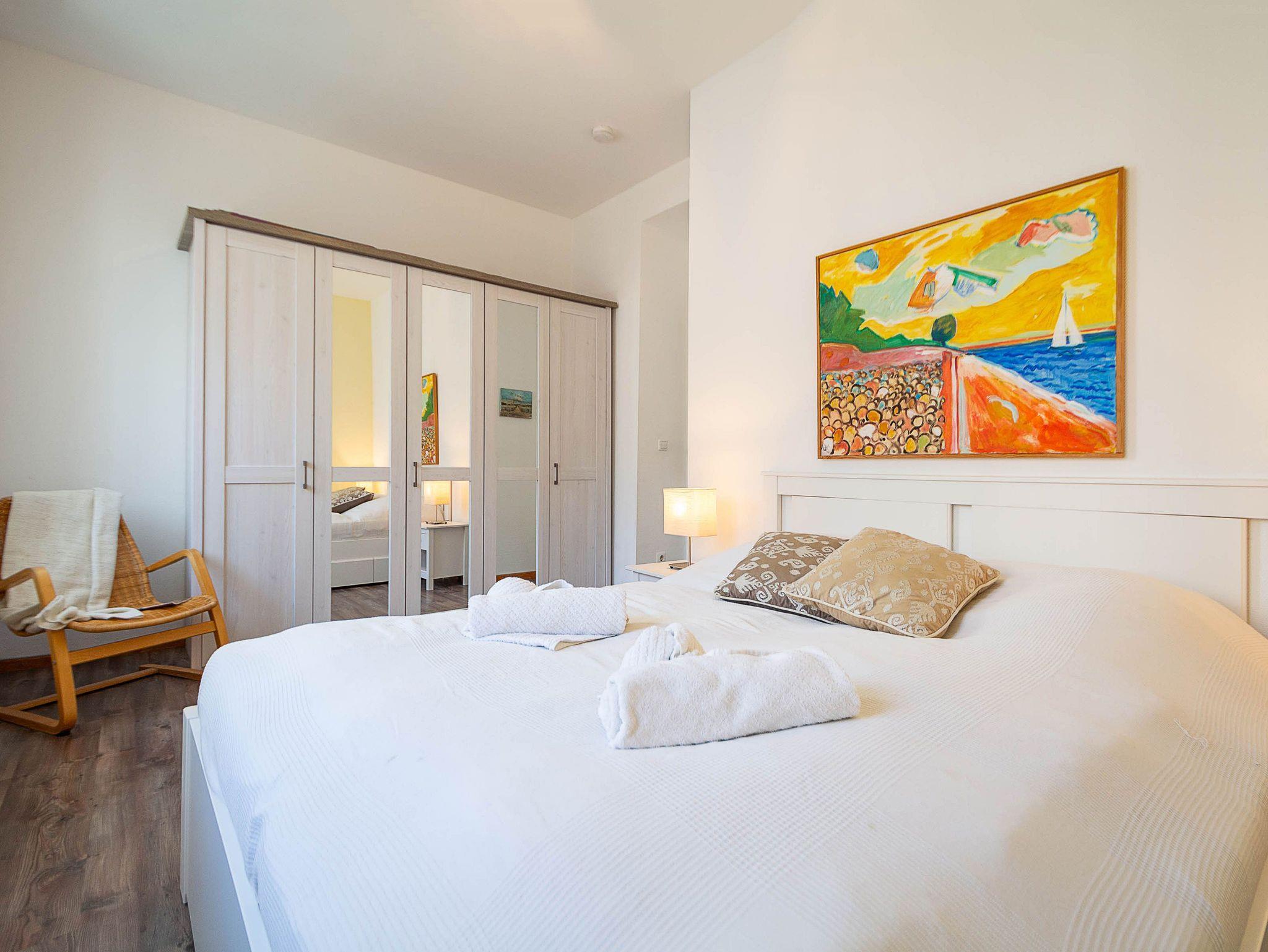 Die Unterkunft verfügt über zwei Schlafzimmer mit komfortablen Doppelbetten. Das größere, erste Schlafzimmer ist mit einem Bett in der Größe 160 × 200 cm ausgestattet. In beiden Schlafzimmern stehen großzügige Kleiderschränke für Ihre Urlaubsgarderobe zur Verfügung.