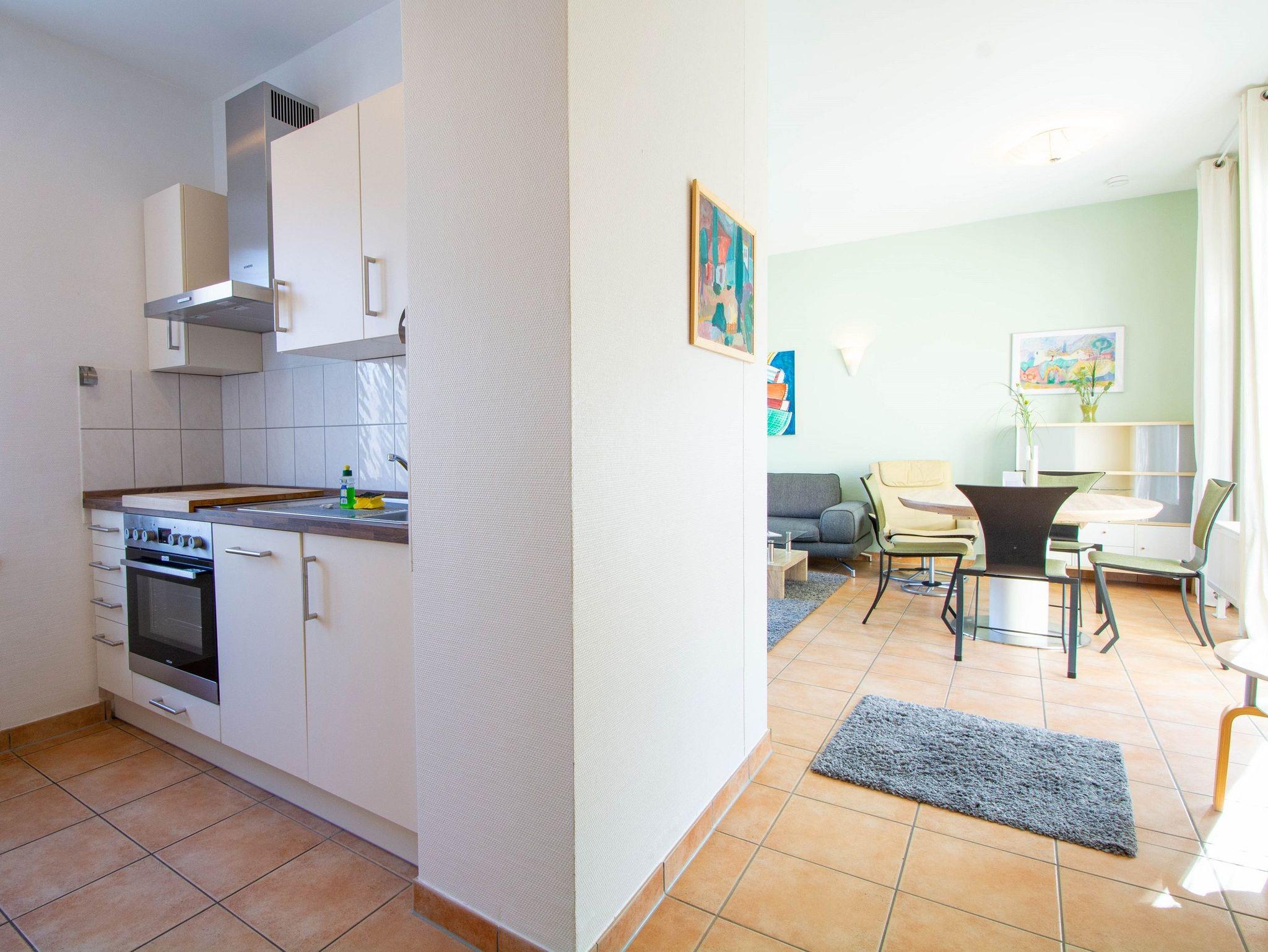 Das modern und geschmackvoll eingerichtete Wohnzimmer dieser Ferienwohnung ist ausgestattet mit bequemer Couchgarnitur, Stereoanlage und TV-Gerät sowie einem Esstisch für 4 Personen. Die angrenzende separate, offene Küche ist ausgestattet mit alle wichtigen Küchengeräten und -utensilien, die Sie im Urlaub an der Ostsee benötigen. Ein Herd mit Backofen, ein Geschirrspüler, eine Mikrowelle und ein Kühlschrank befinden sich in der Küche. Eine Kaffeemaschine, ein Wasserkocher und ein Toaster sowie genügend Koch- und Essgeschirr vervollständigen die Kücheneinrichtung.
