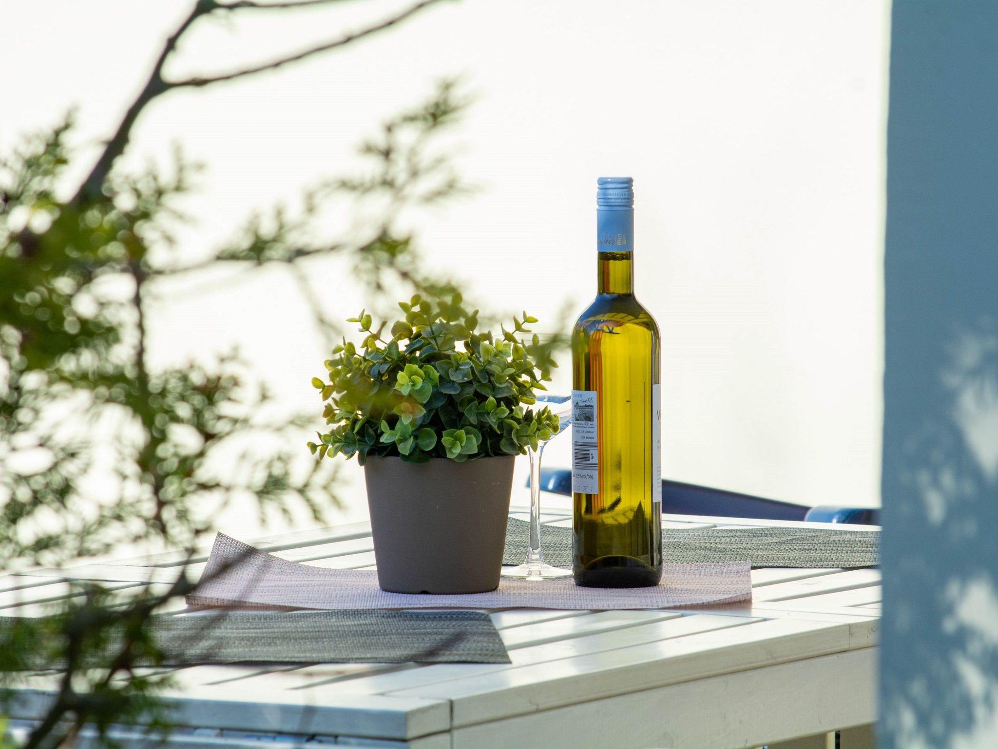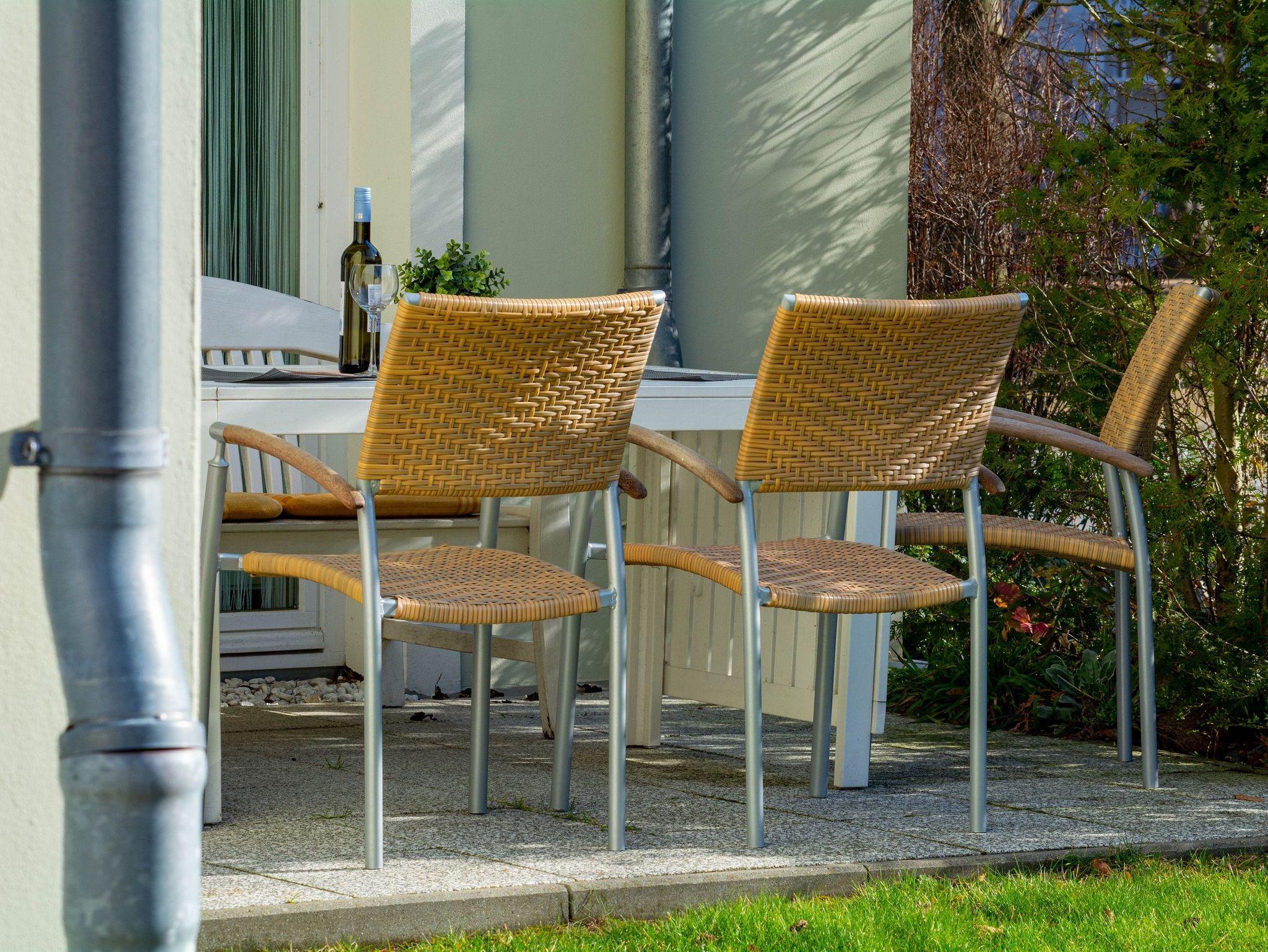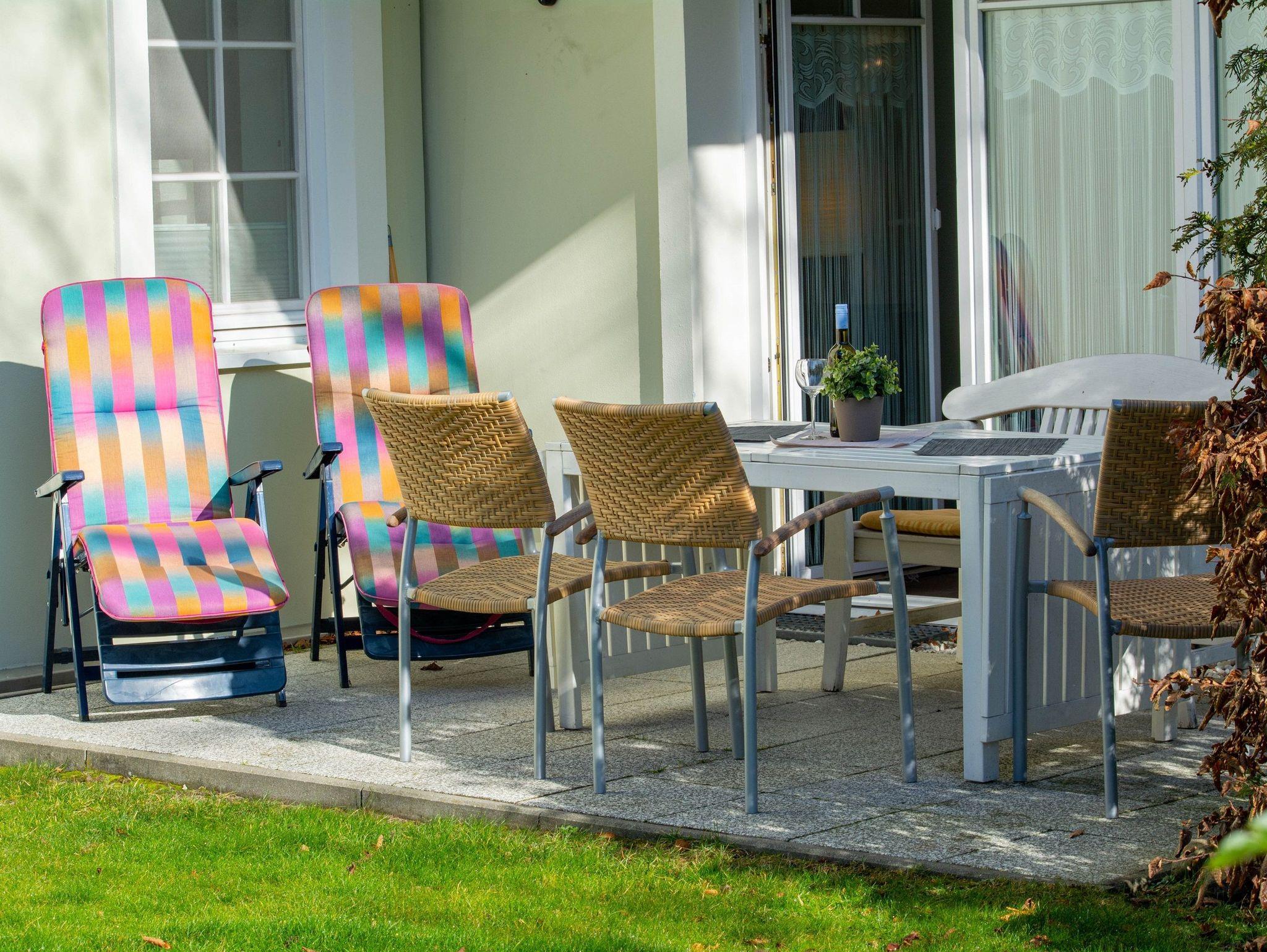 Vom Wohnraum aus betreten Sie die Terrasse mit kleinem Gartenanteil in Richtung Süd-Westen. Hier können Sie den Abend nach einem erlebnisreichen Tag am Meer bei einem Glas Wein ausklingen lassen.