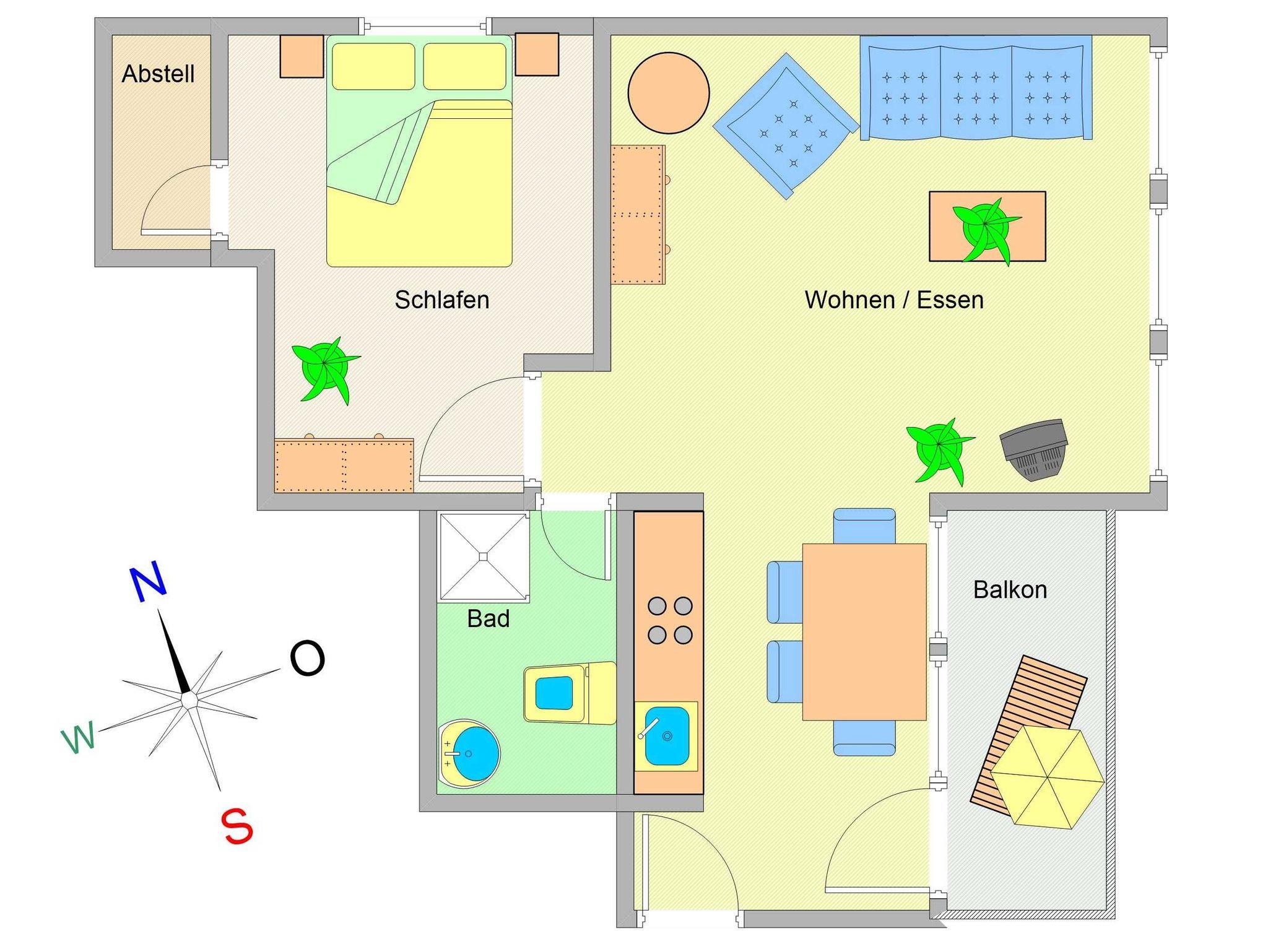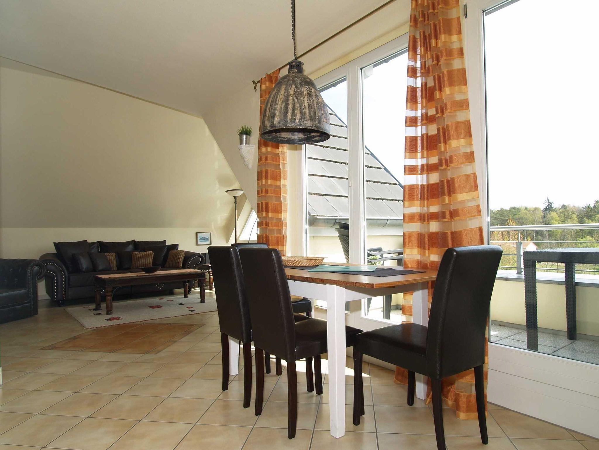 Der helle freundliche Wohnbereich ist im gemütlichen Kolonialstil eingerichtet und verfügt über eine bequeme Ledercouchgarnitur, Stereoanlage sowie einem 32-Zoll-Flat-TV-Gerät. Der angrenzende Essbereich bietet Ihnen reichlich Platz für gemeinsame Mahlzeiten. Von hier betreten Sie den nach Osten ausgerichteten Balkon, von wo aus Sie einen herrlichen Blick auf den Stadtwald haben. Dort können Sie Ihr Frühstück in der Morgensonne genießen, relaxen und Sonne tanken.
