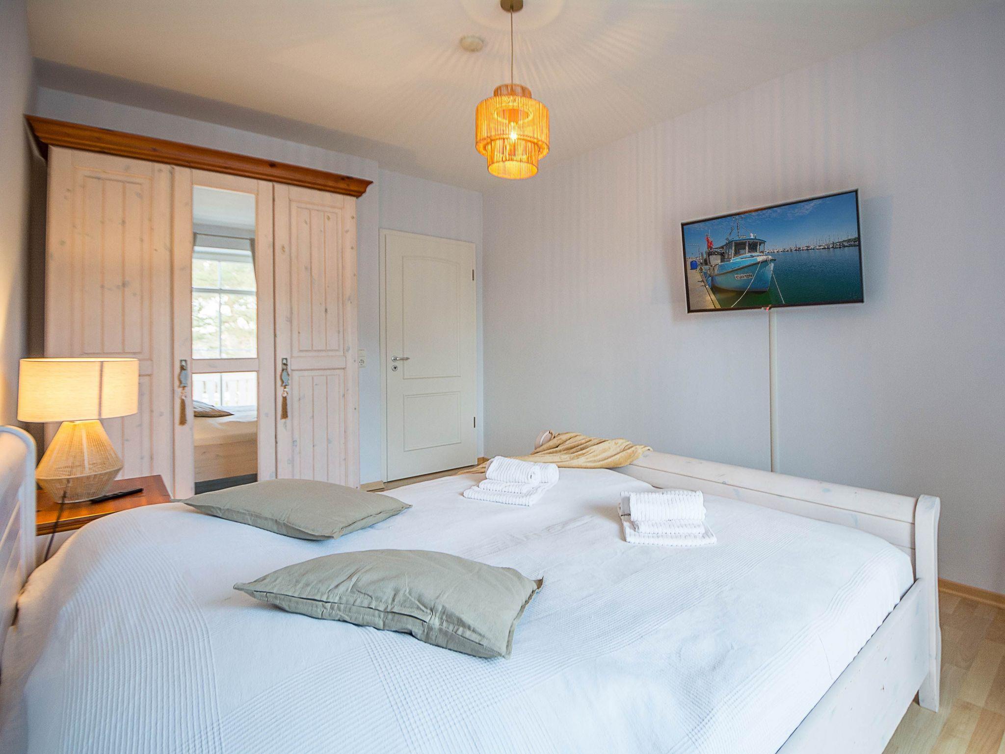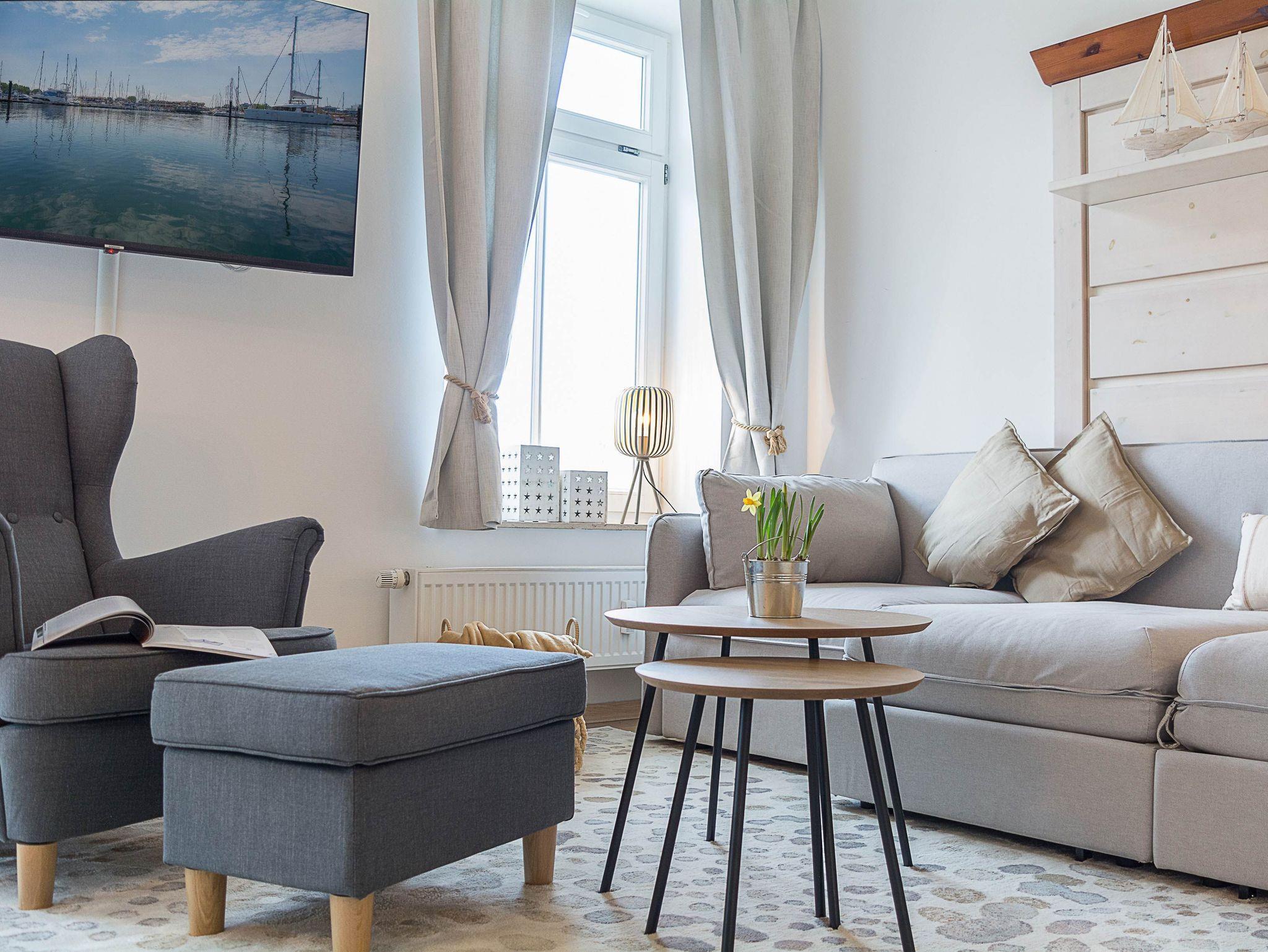 Sie wohnen in einer ca. 50 m² großen 2-Raum-Ferienwohnung, die sich im 3. Obergeschoss befindet. Der kombinierte Wohn- und Essraum besticht durch seine helle freundliche Ausstattung. Eine gemütliche Schlafcouch, ein Flachbild-Fernseher, ein Esstisch sowie die voll ausgestattete Küchenzeile (4-Platten-Kochfeld mit Backofen und Dunstabzug, Mikrowelle, Geschirrspüler, Kühlschrank, Kaffeemaschine, Wasserkocher und Toaster) befinden sich hier. Sowohl vom Wohnraum als auch vom Schlafzimmer betreten Sie den möblierten Nordbalkon, auf dem Sie den Tag ausklingen lassen können. Der Schlafraum ist mit Doppelbett und einem großzügigen Kleiderschrank ausgestattet sowie neinem weiteren TV-Gerät. Das geflieste Bad mit Duschwanne, Dusche und WC bietet genügend Stauraum für Ihre Pflegeprodukte.