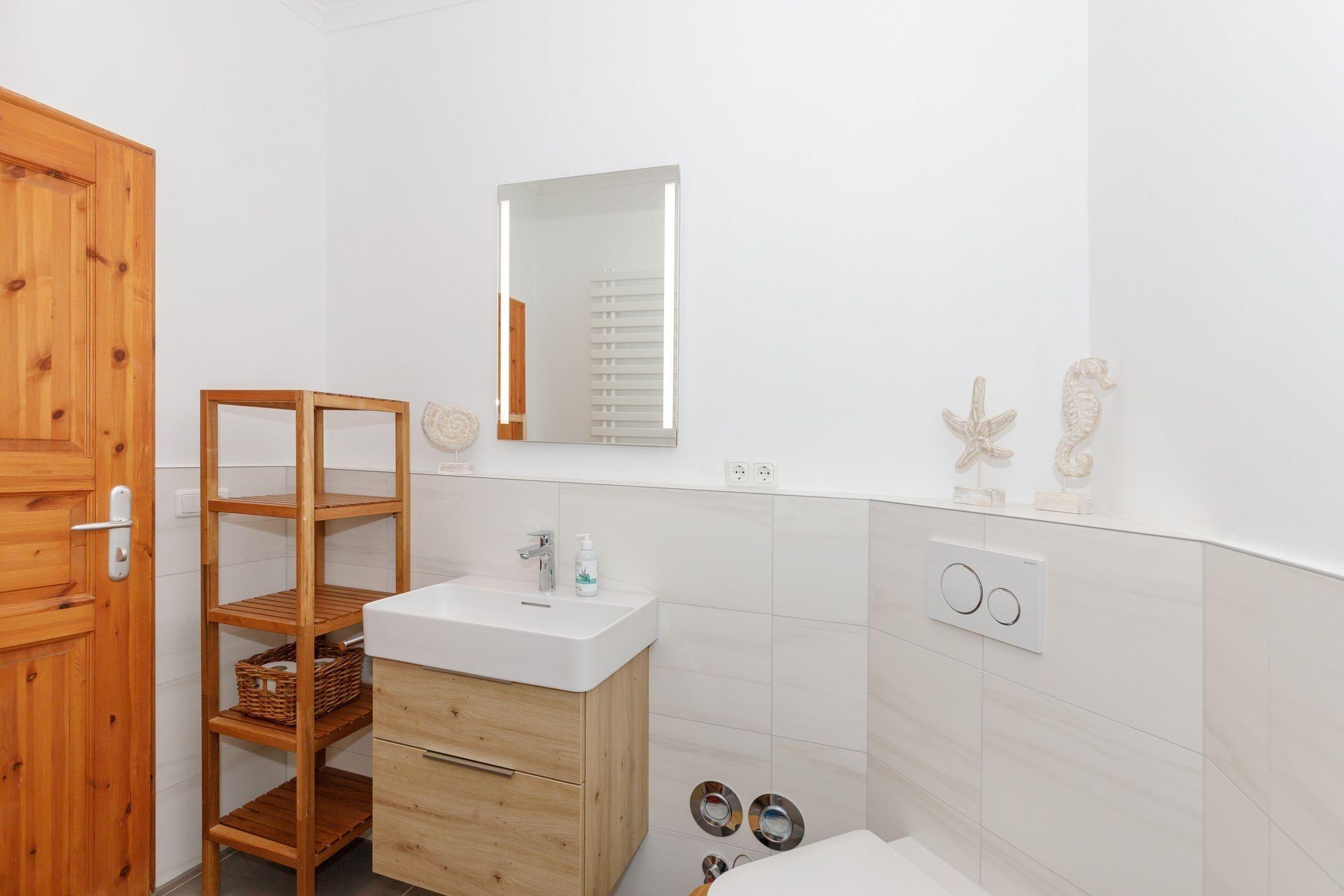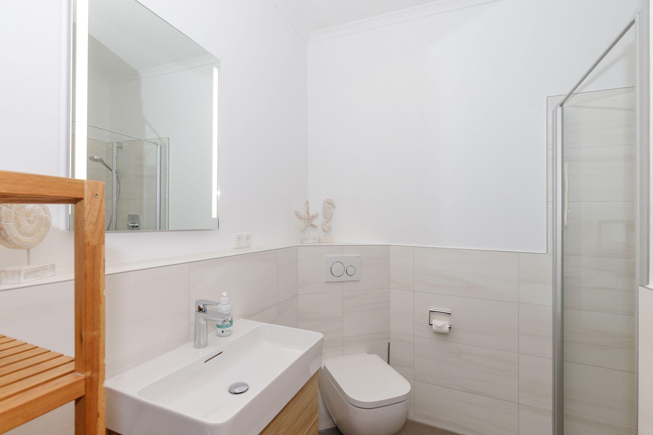 Das im mediterranen Stil geflieste, geräumige Duschbad ist mit einem WC, einer Fußbodenheizung, einem Föhn, einem Handtuchheizkörper, einem Waschbecken mit Unterschrank sowie einem Kosmetikspiegel ausgestattet.