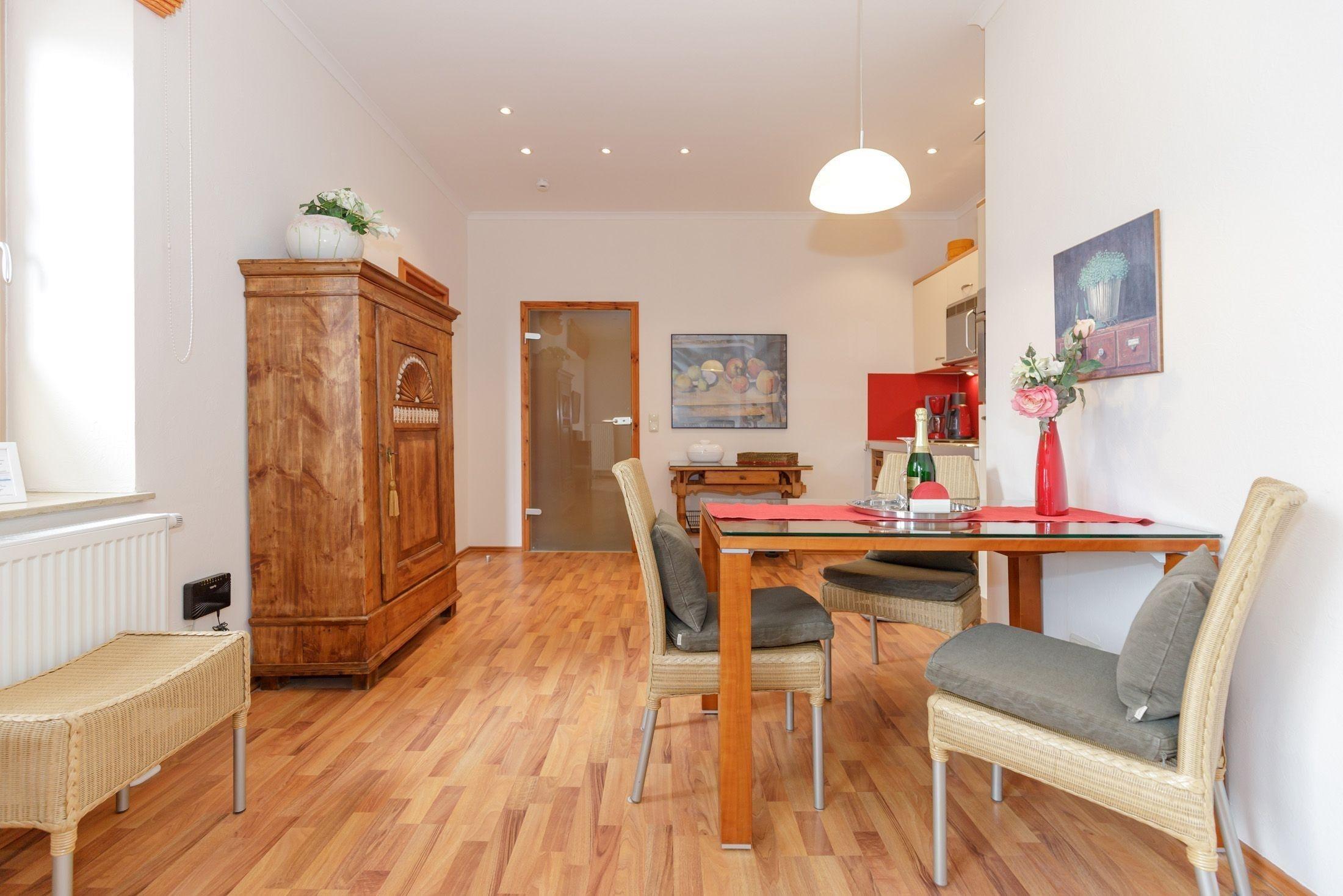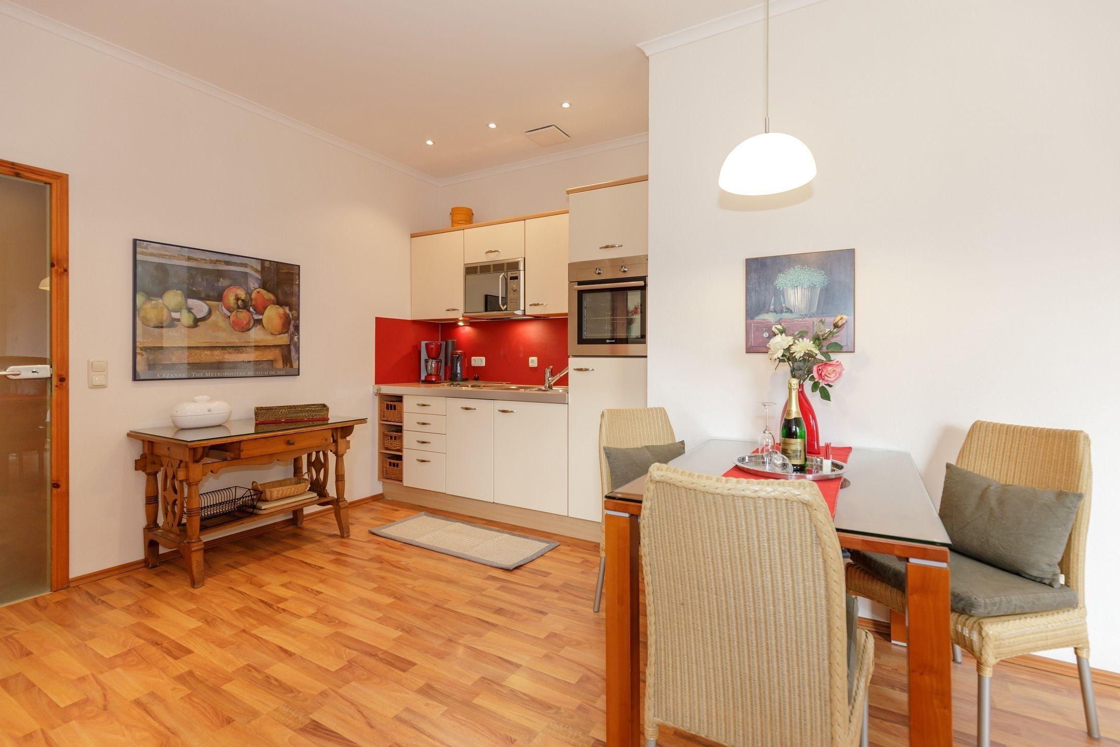 Der geschmackvoll gestaltete Essbereich grenzt an eine hochwertige und voll ausgestattete Küchenzeile, die Ihnen alle Bequemlichkeiten einer modernen Küche bietet.