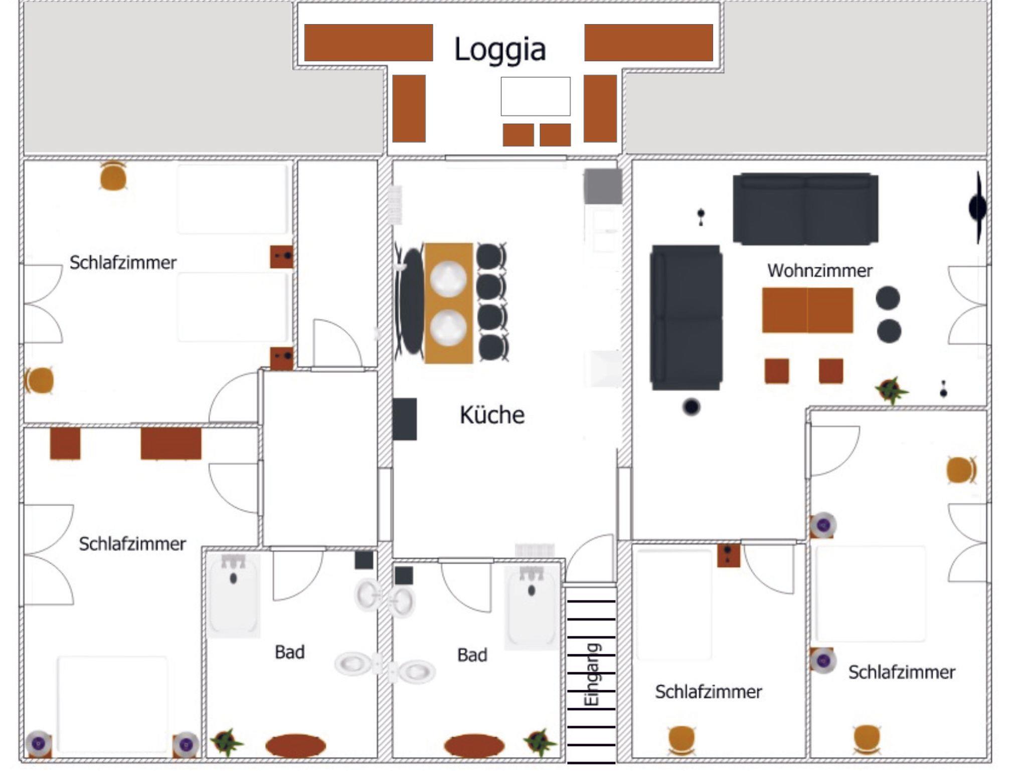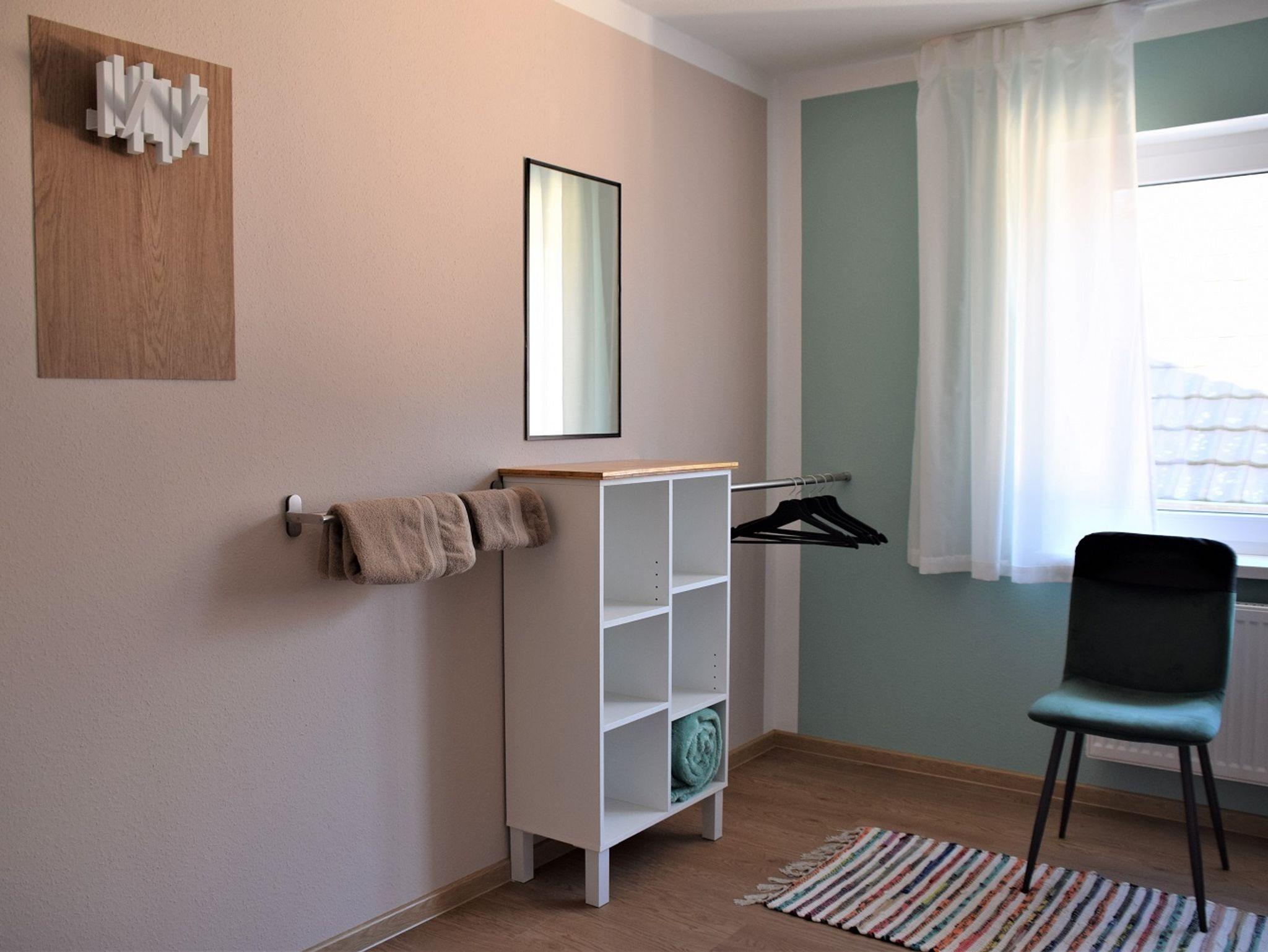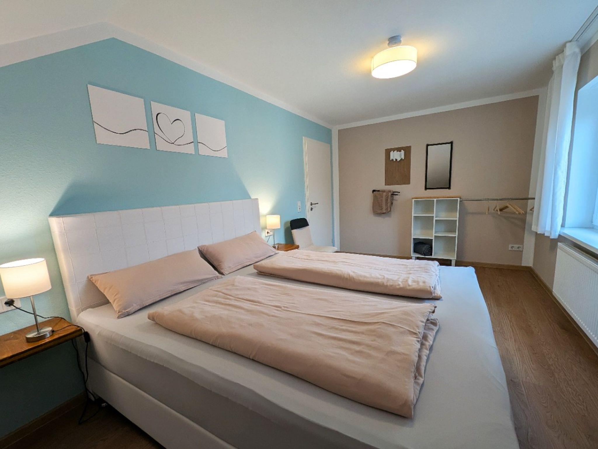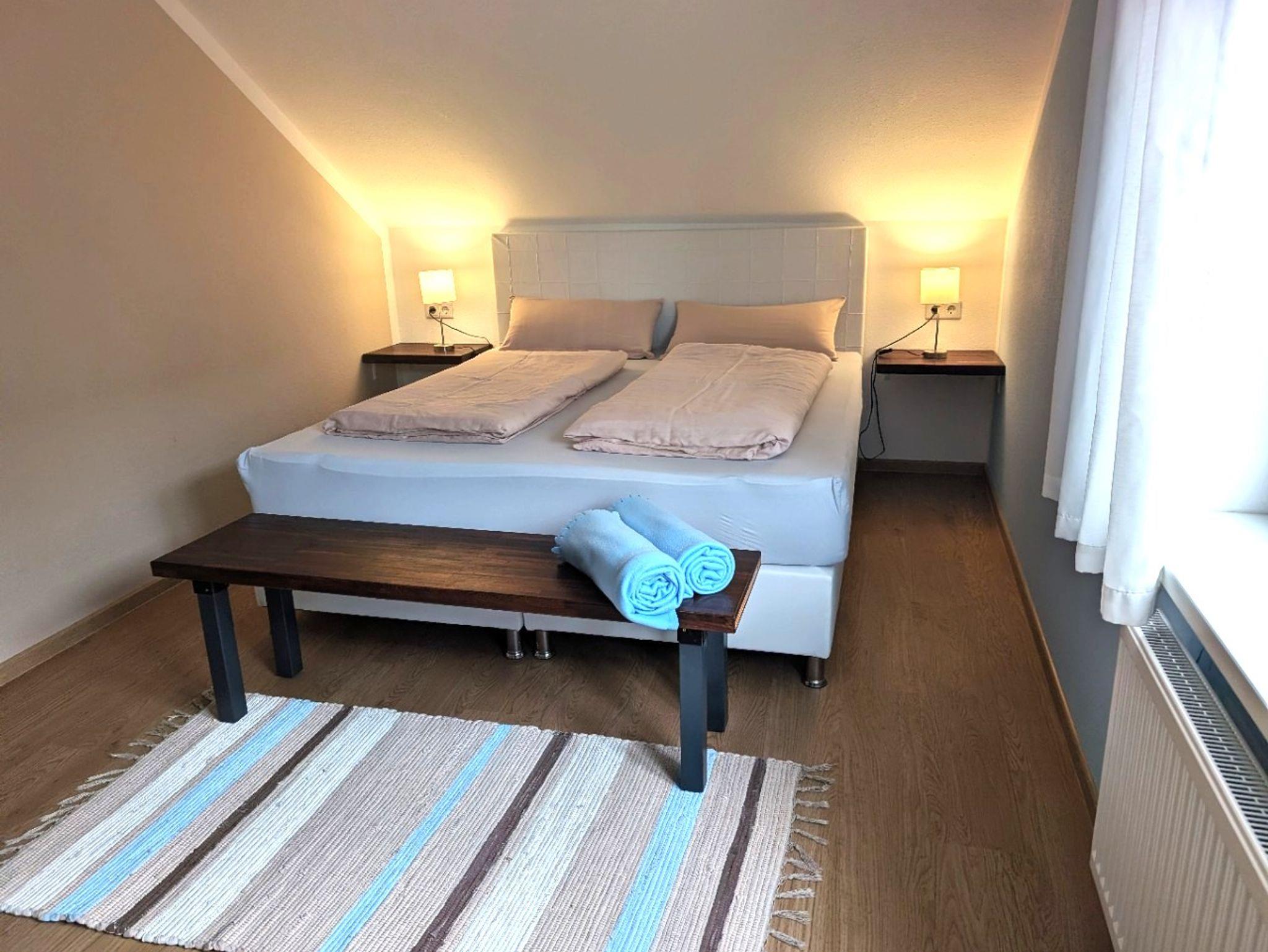 Im geräumigen Wohnzimmer erhellt die Abendsonne den Raum. Hier können Sie auf zwei Big Sofas relaxen oder verbringen gemeinsam einen gemütlichen Fernsehabend. Die Wohnung verfügt über 4 Schlafzimmer, in 2 der Schlafzimmer gibt es ein Boxspringbett (180x200cm), in einem weiteren Schlafzimmer steht ein französisches Bett (Boxspringbett, 140x200cm), das 4. Schlafzimmer verfügt über 2 einzelne französische Betten (Boxpringbett, 140x200cm). In allen Schlafzimmern sind offene Schränke. Zwei Kinderreisebetten können zugestellt werden. Es gibt zwei Bäder, diese verfügen über eine begehbare Dusche sowie ein Fenster. Eine kostenfreie Parkmöglichkeit gibt es direkt vor dem Haus. Auch ein abschließbarer Raum für Fahrräder steht zur Verfügung. Wlan ist kostenfrei vorhanden.