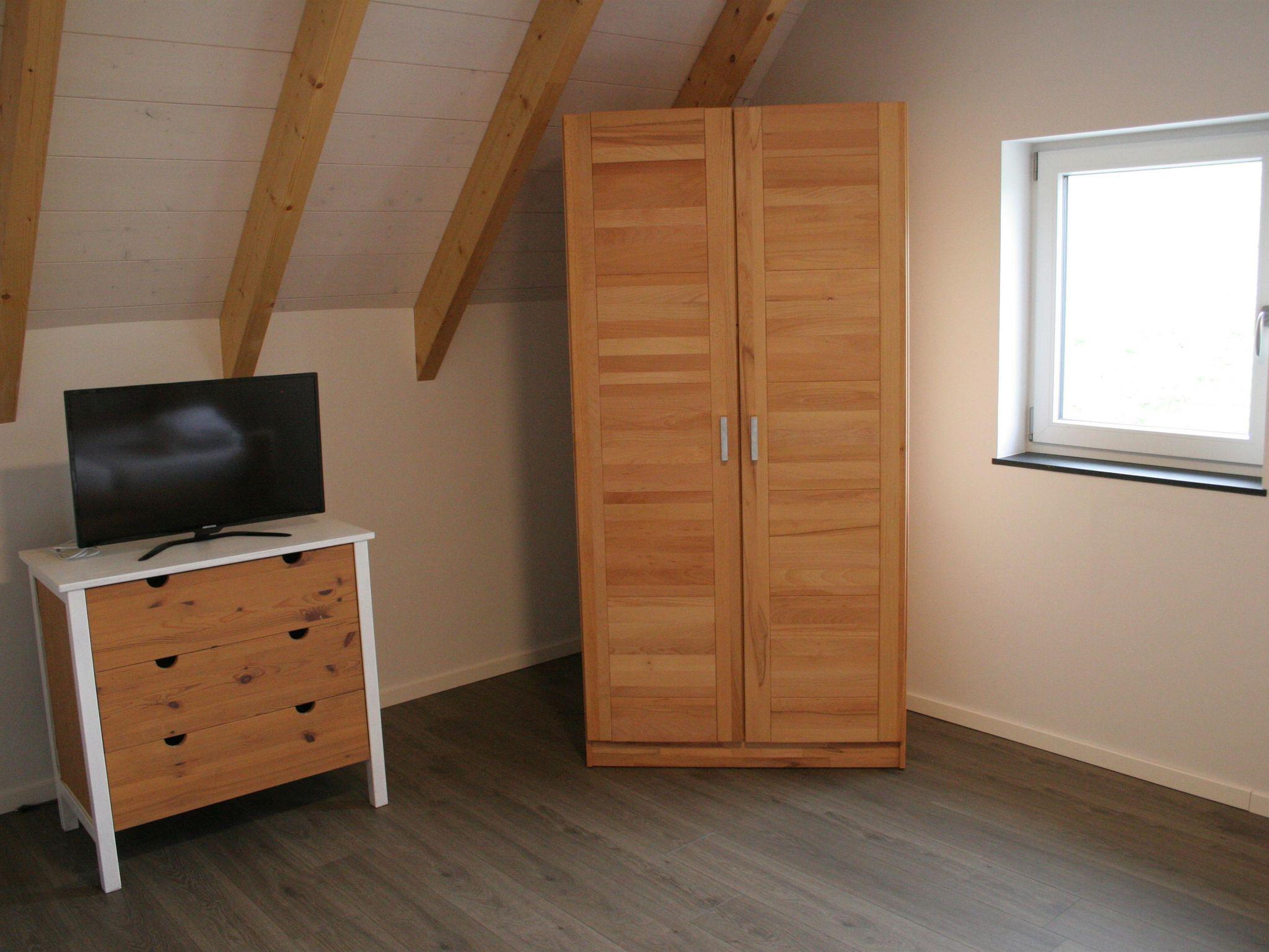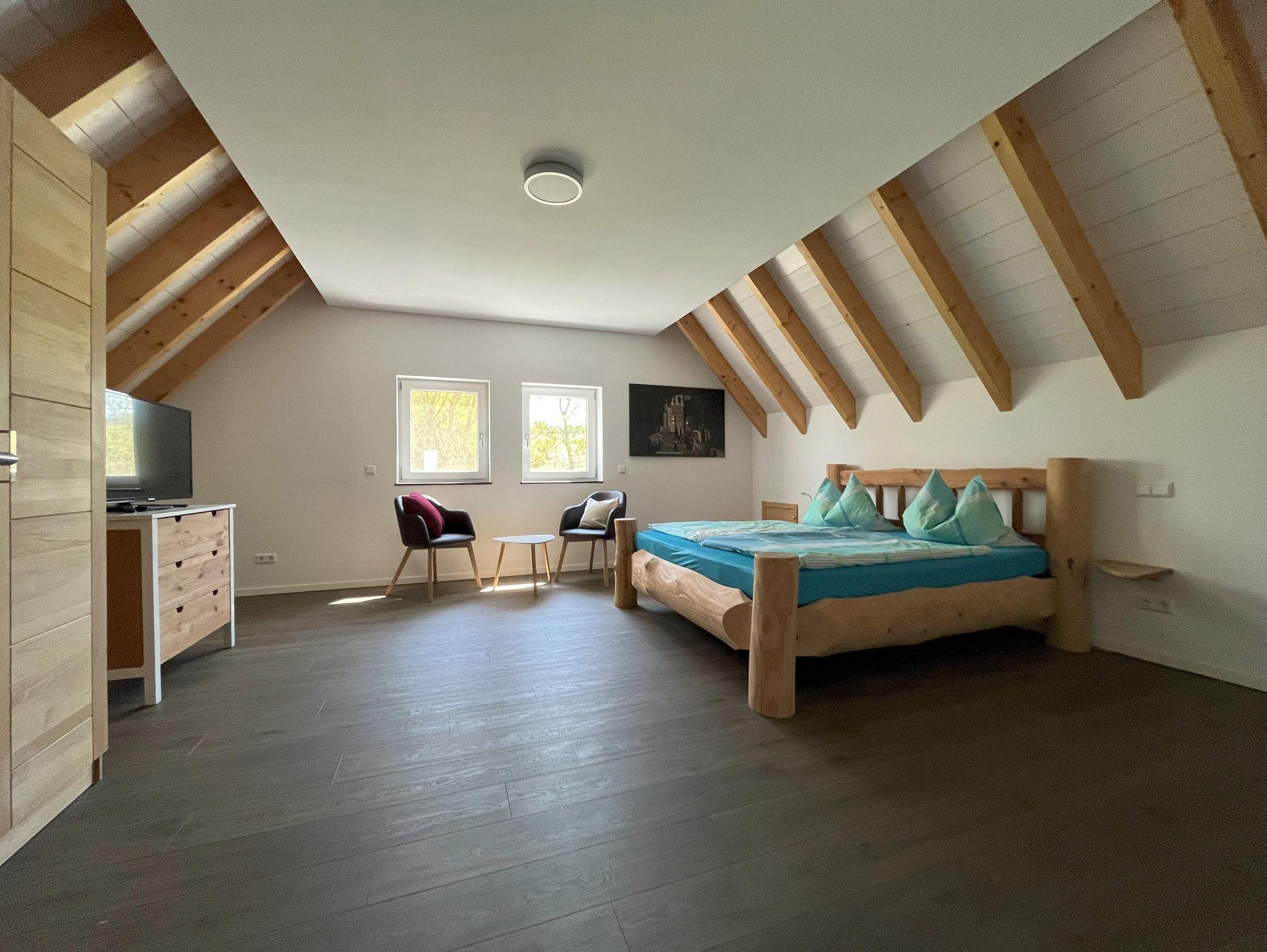 Im Obergeschoss befinden sich zwei Schlafzimmer eins ca. 25 m2 mit einem Doppelbett und einem Hochbett sowie TV und ein Schlafzimmer ca. 35 m2 mit einem Doppelbett und TV