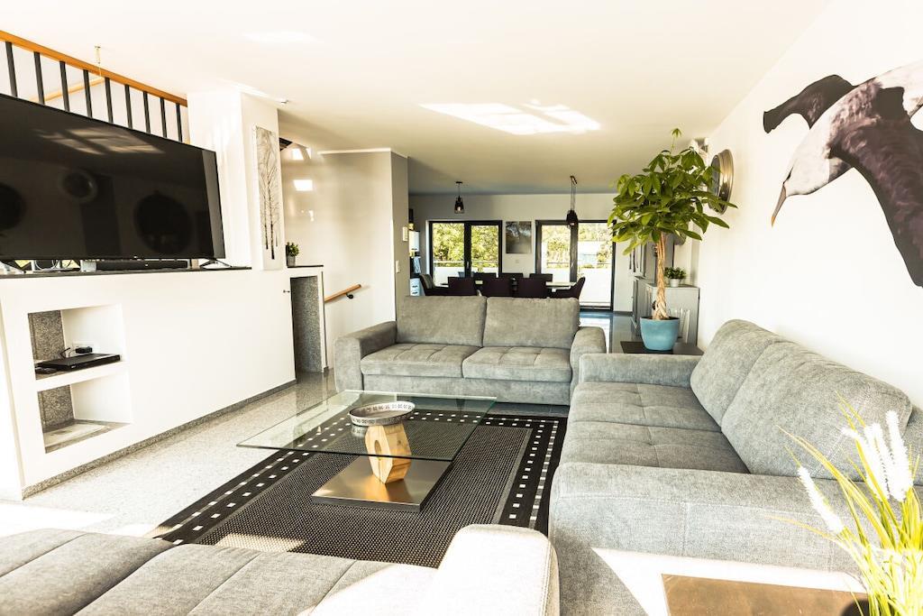 Für 6 Erwachsene plus 2 Zusatzschlafplätzen 160 qm - 3 Etagen 3 Schlafzimmer, 1 Durchgangsschlafzimmer (4 Doppelbetten) 2 Bäder mit Dusche offener Wohnbereich mit Küche und Essbereich Sonnenterasse mit Liegen im EG teils überdachte Terrasse mit großem Esstisch und zusätzlichen Loungemöbeln überdachte, möblierte Terrasse im 2. OG Carport und Stellplatz Seezugang Steg über die Strasse Nutzung inklusive: Geschirrspüler – Waschmaschine – Kajak (3 Pers.) – 4 Standup-Paddeling-Boards