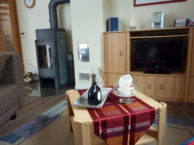 Über den Eingangsbereich gelangen Sie in das kombinierte Wohn- und Esszimmer mit integrierter Küche. Hier verfügen Sie über eine gemütliche Sofaecke mit TV-Gerät, DVD-Player, Radio, einen großzügigen Esstisch mit Stühlen und den Zugang zur möblierten Terrasse, auf der für Sie Sitzmöglichkeiten, zwei Liegestühle, ein Grill und ein Sonnenschirm bereit stehen. An den kälteren Tagen sorgt ein Kamin für die wohlige Wärme und eine gemütliche Atmosphäre.