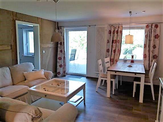 Im geschmackvoll möblierten und kombinierten Wohn- und Essbereich werden Sie sich wohlfühlen: eine gemütliche Sofaecke, ein TV-Gerät zu Ihrer Unterhaltung und der großzügige Esstisch in Verbindung mit den mit Lehm verputzten Wänden und den ursprünglich erhaltenen Fachwerkbalken sorgen für ein angenehmes Raumklima mit Wohlfühlcharakter und runden Ihr Urlaubserlebnis ab. Über eine Terrassentür gelangen Sie auf die möblierte Terrasse mit Garten (Gemeinschaftsnutzung). Hier können Sie bei schönem Wetter den Urlaubstag bei einem leckeren Frühstück beginnen und mit einem Gläschen Wein am Abend entspannt ausklingen lassen