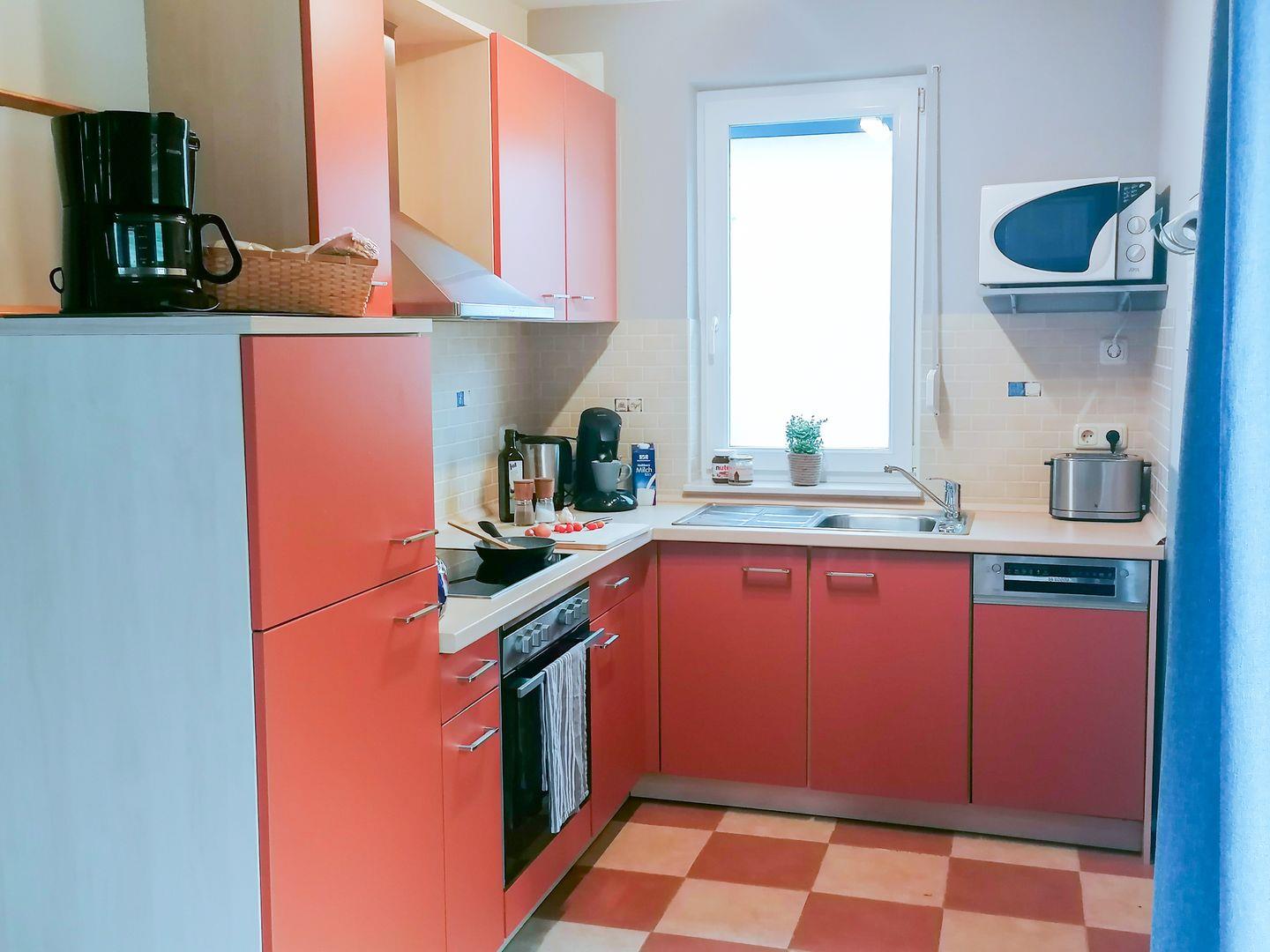 Die Küche ist offen zum Wohnbereich und mit allen technischen Geräten, wie zum Beispiel Kühlschrank mit Gefrierfach, Herd mit Backofen, Mikrowelle, Geschirrspülmaschine, Kaffeemaschine und vielem mehr aus ausgestattet.