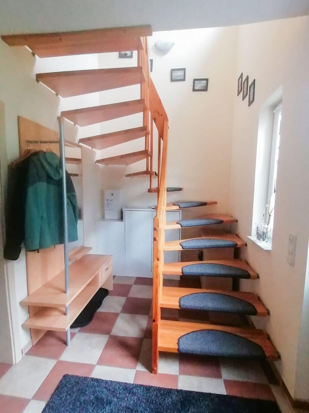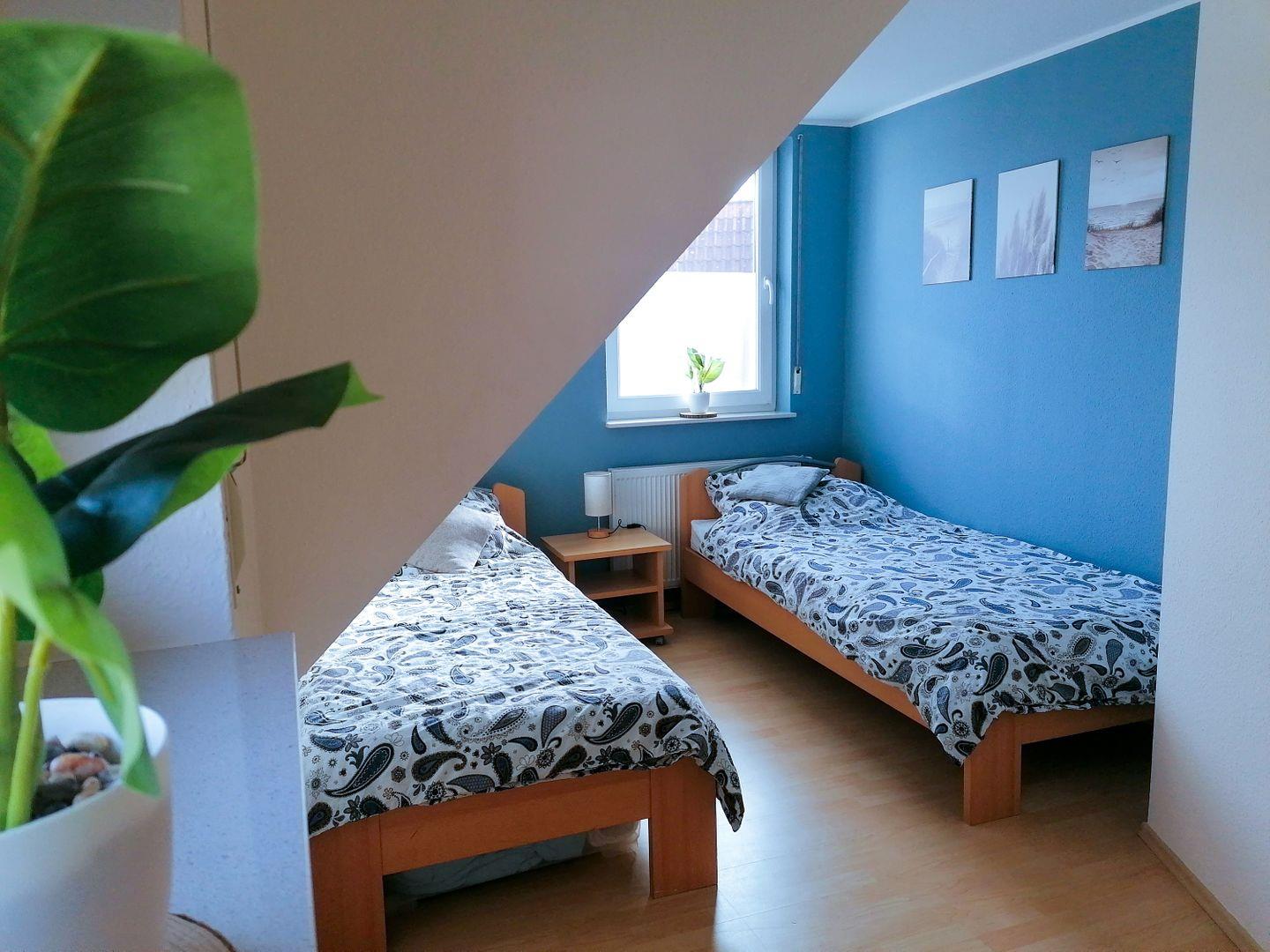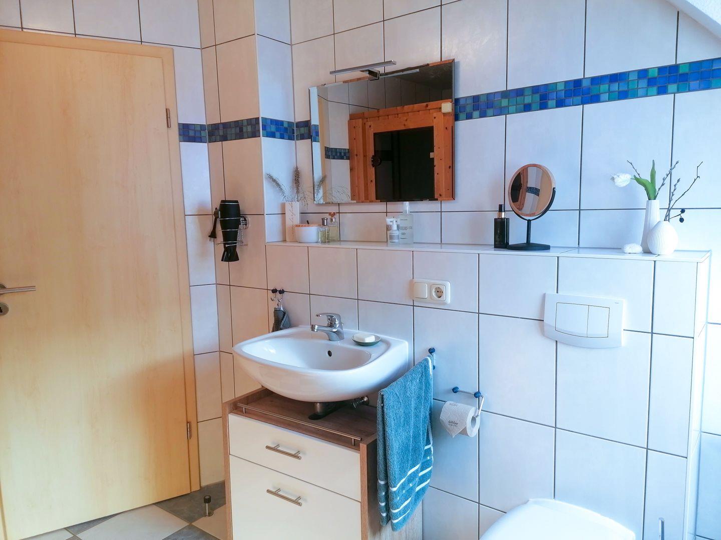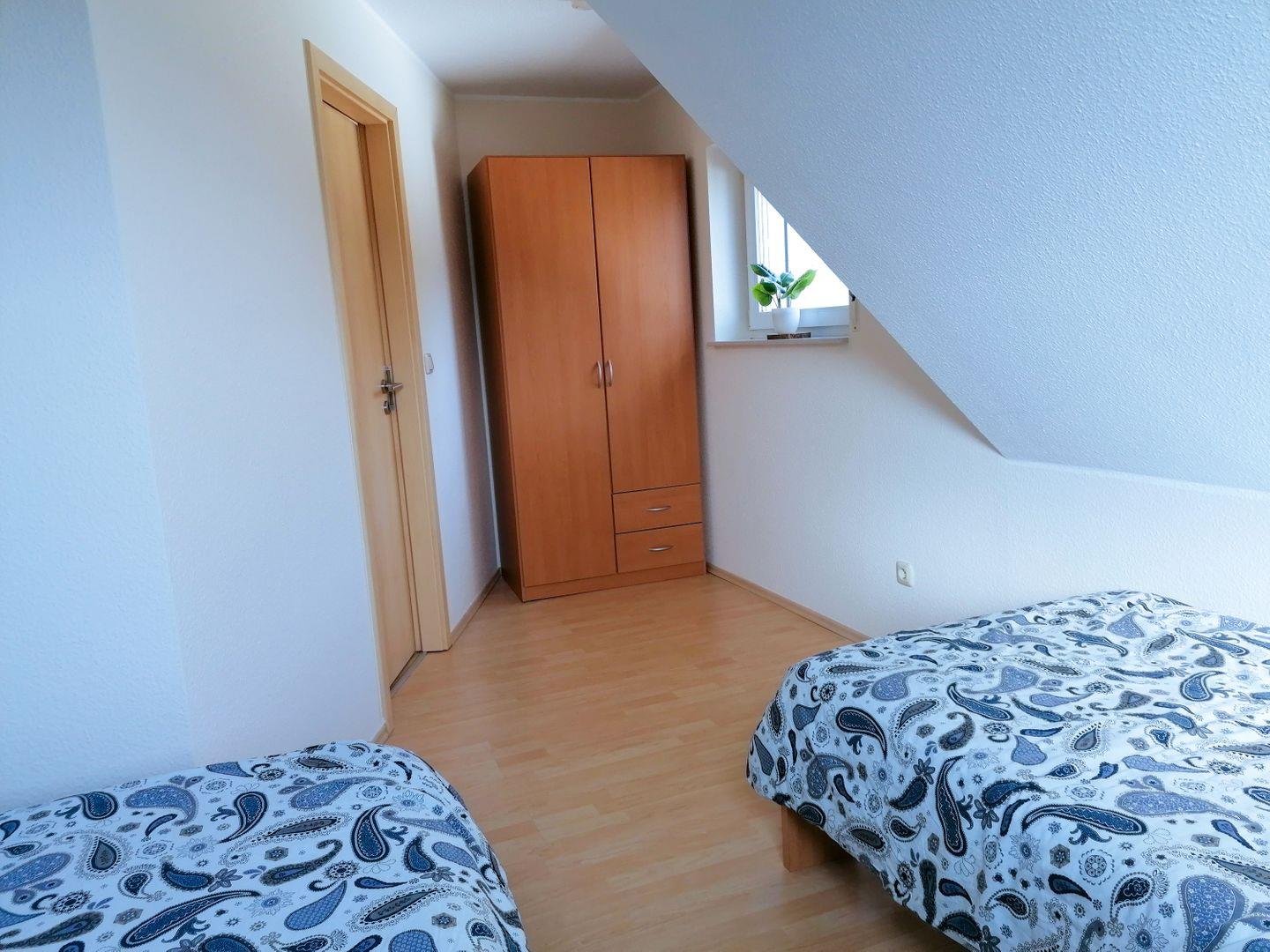 Im Obergeschoss befinden sich die zwei Schlafzimmer und ein weiteres Badezimmer mit Dusche, Waschtisch und WC. Eins der Schlafzimmer mit einem Doppelbett und das Zweite mit zwei Einzelbetten möbliert.