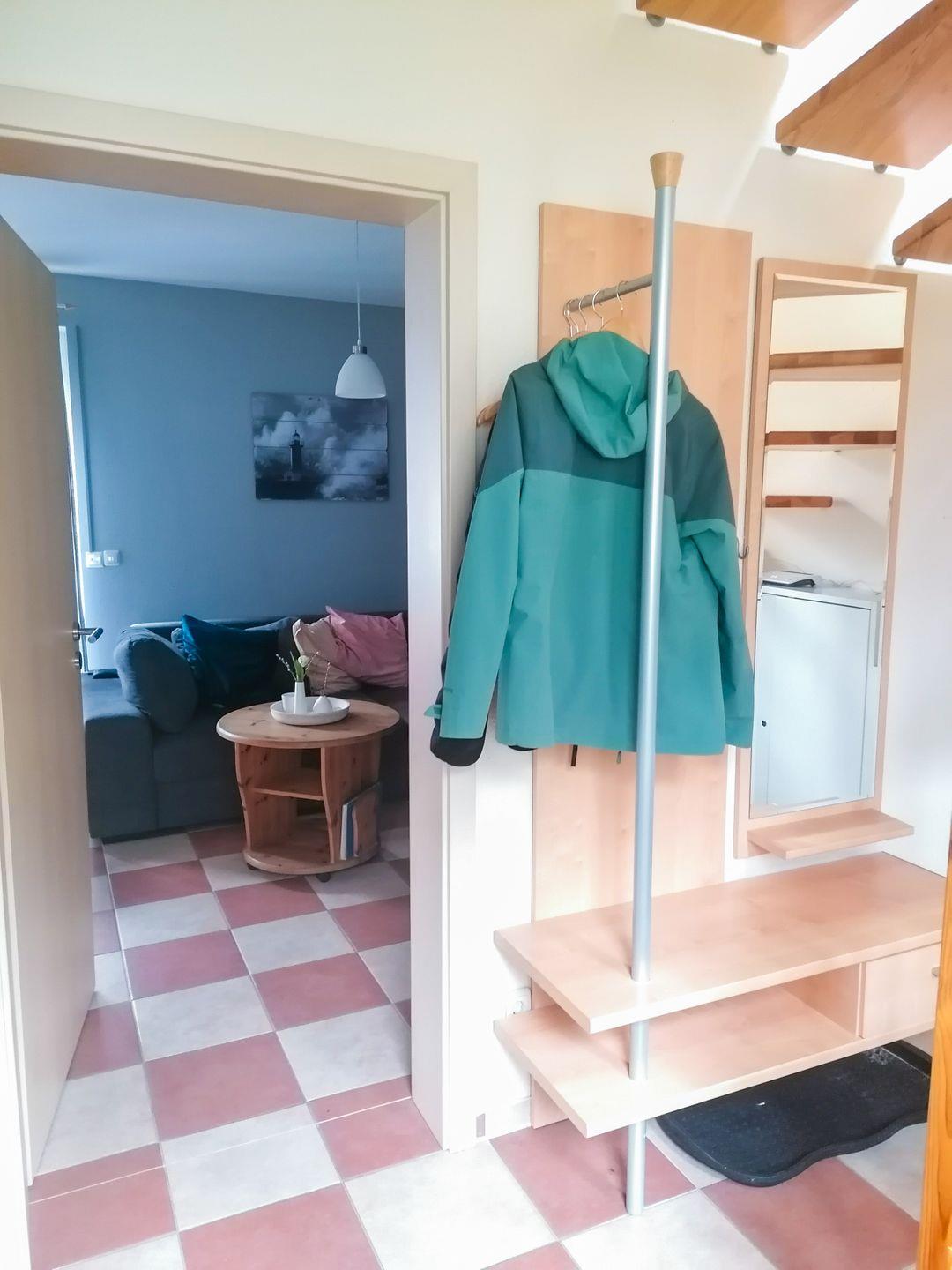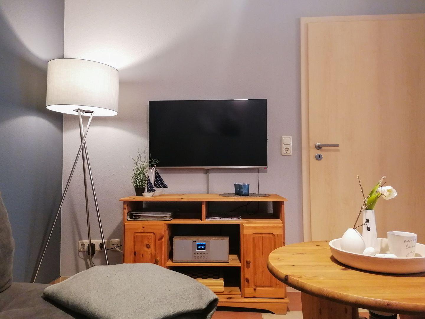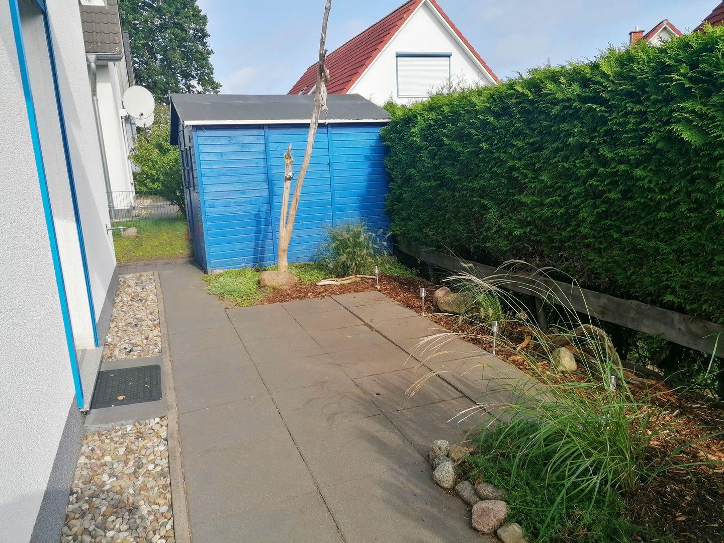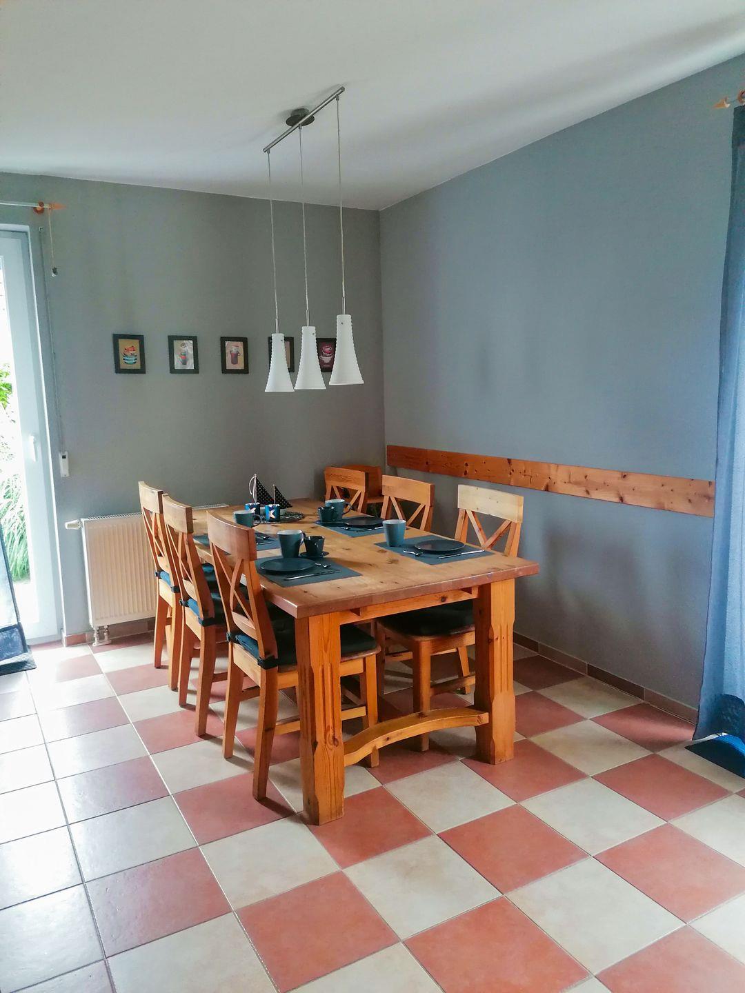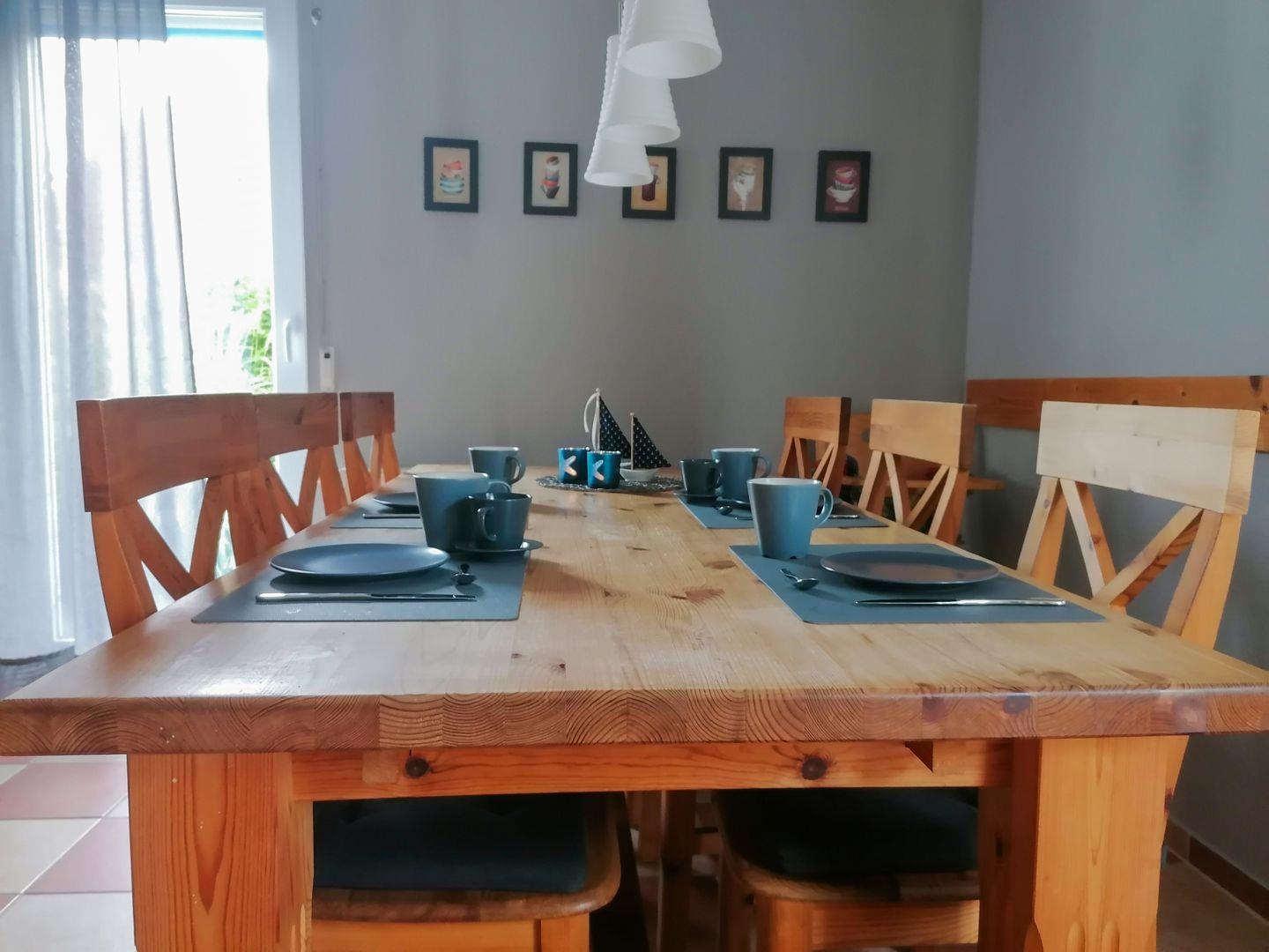 Der kombinierte Wohn- und Essbereich bietet ihnen eine gemütliche Sofaecke mit TV-Gerät, WLAN und großzügigem Esstisch. Außerdem gelangen Sie hier auf die möblierte Terrasse mit kleinem Garten und Grill, wo Sie entspannte Stunden verbringen können.