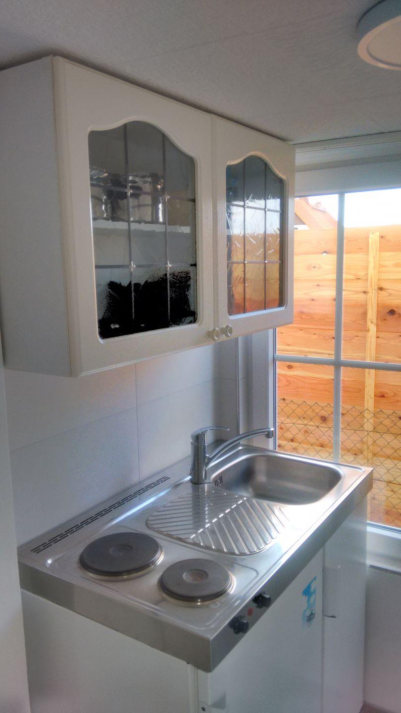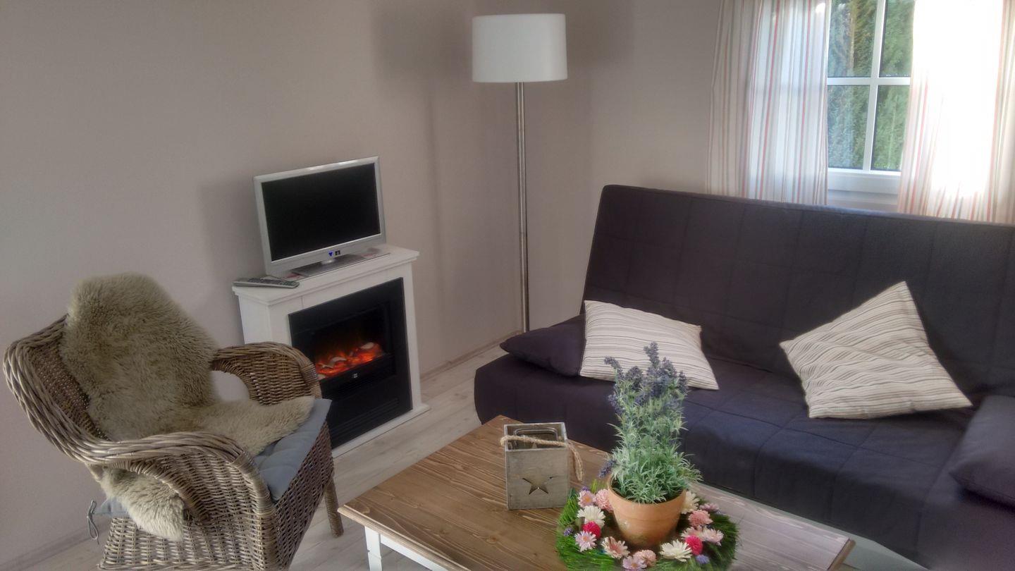 Ein kombinierter Wohn- und Essbereich lädt mit seiner gemütlichen Couch, dem Elektrokamin, TV-Gerät, WLAN und Esstisch zum Wohlfühlen ein. Die kleine Küchenzeile ist in den Raum integriert und bietet z.B. einen 2-Plattenherd, einen kleinen Elektrobackofen, Kühlschrank mit Gefrierfach, Kaffeemaschine, Wasserkocher und Toaster.