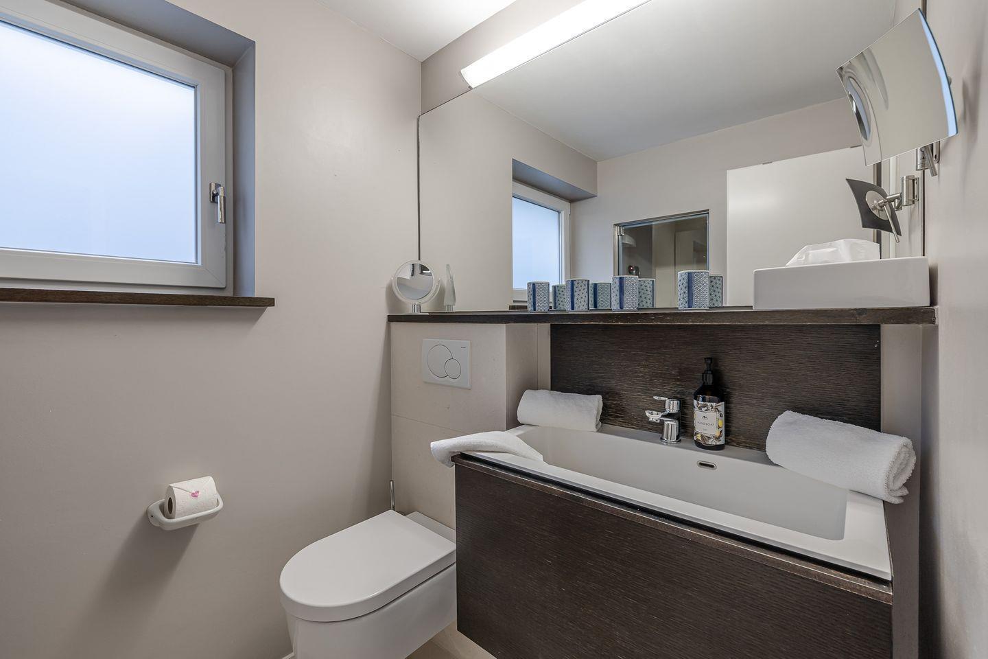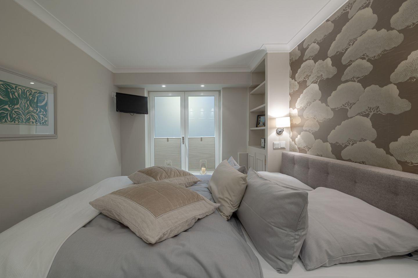 Im Souterrain des Hauses finden Sie zwei komfortable Schlafzimmer mit Boxspringbetten und maßgefertigten Einbauten. Das moderne Badezimmer ist mit einer bodentiefe Dusche ausgestattet und sorgt für höchsten