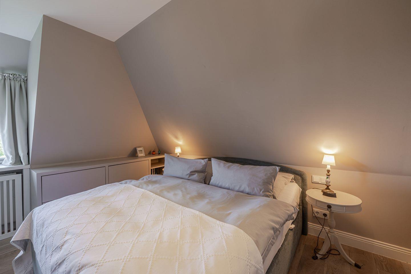 Im Obergeschoss erwartet Sie ein weiteres gemütliches Schlafzimmer mit Boxspringbett. Zusätzlich gibt es ein kleines, im Vintagestil gehaltenes Wohn-/Arbeitszimmer und ein großes Badezimmer mit Badewanne – ideal für entspannte Momente nach einem langen Tag.