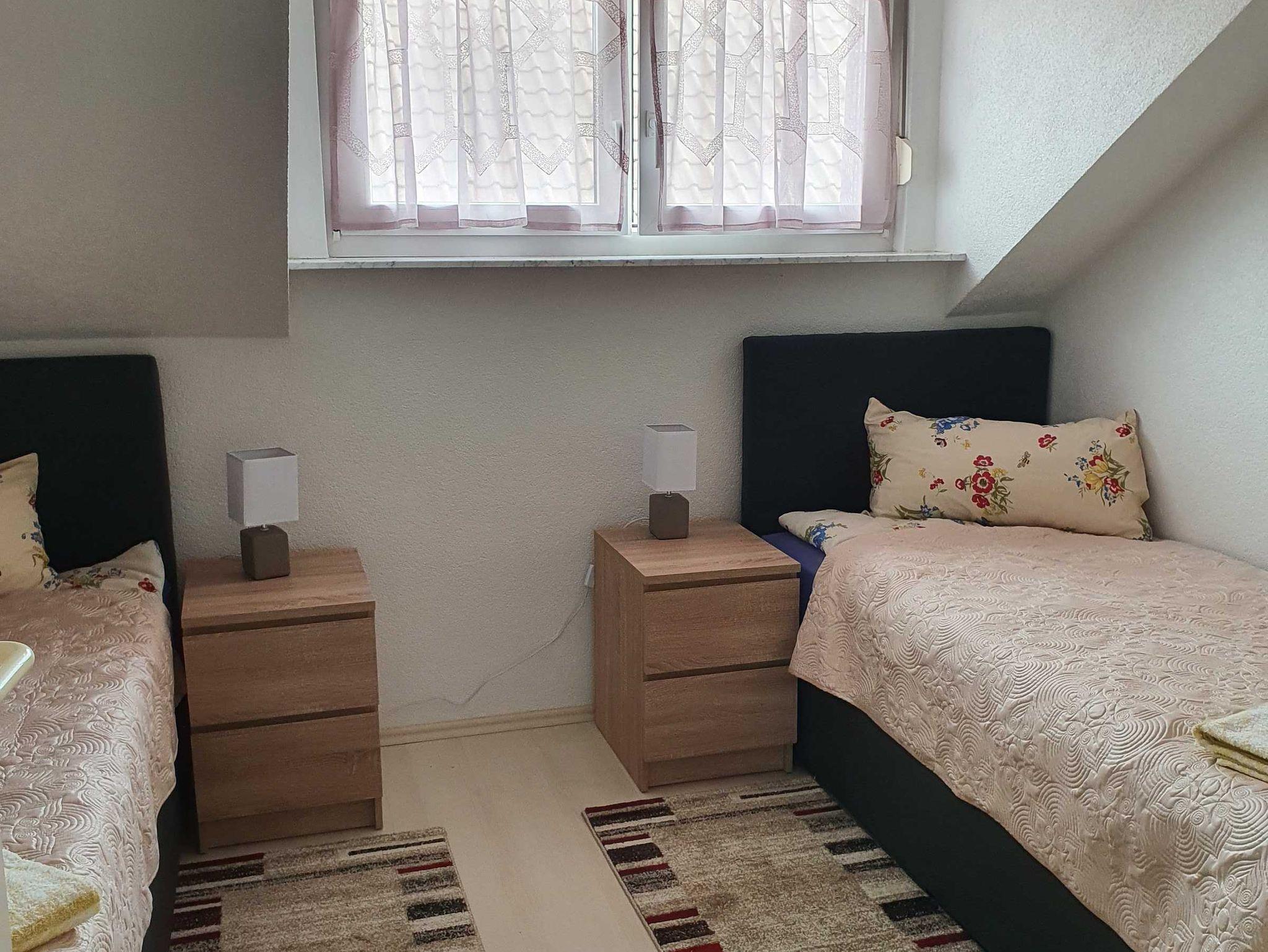 Diese 4-Zimmer-Wohnung im Dachgeschoss mit 80qm bietet ein Schlafzimmer mit Doppelbett und zwei Schlafzimmer mit je zwei Einzelbetten. Die Schlafräume sind mit Kleiderschrank und Nachttischchen ausgestattet. Das 2022 vollständig sanierte Badezimmer verfügt über ein WC, Waschbecken mit Spiegelschrank, eine Dusche und eine Waschmaschine.
