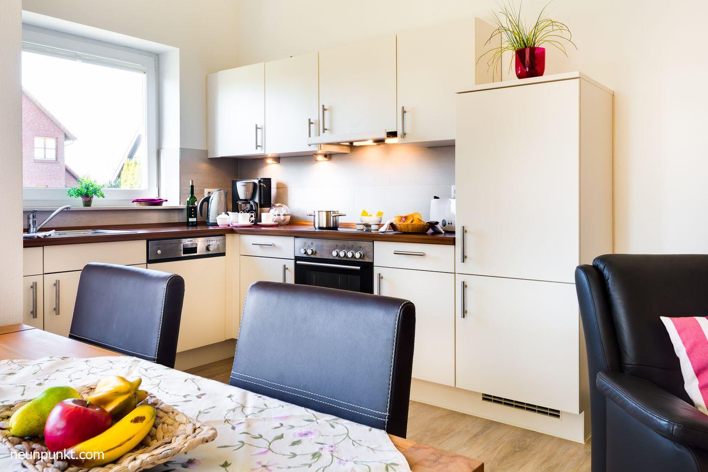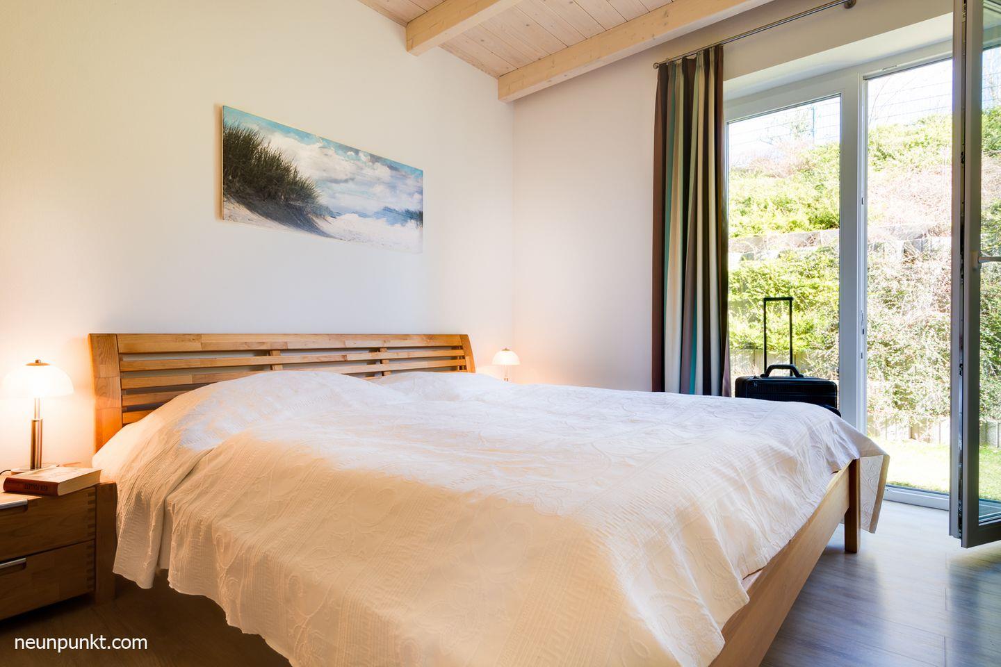 Die Doppelhaushälfte teilt sich auf in 1 Doppelschlafzimmer, 1 Schlafzimmer mit 2 Einzelbetten, 1 Duschbad mit Schwallbrause, Kosmetikspiegel und Infrarot-Sauna, ein Gäste-WC, Abstellraum, einen großen Wohn- und Essraum mit Elektrokamin, offener Küche und eine Galerie mit Sitzplatz.