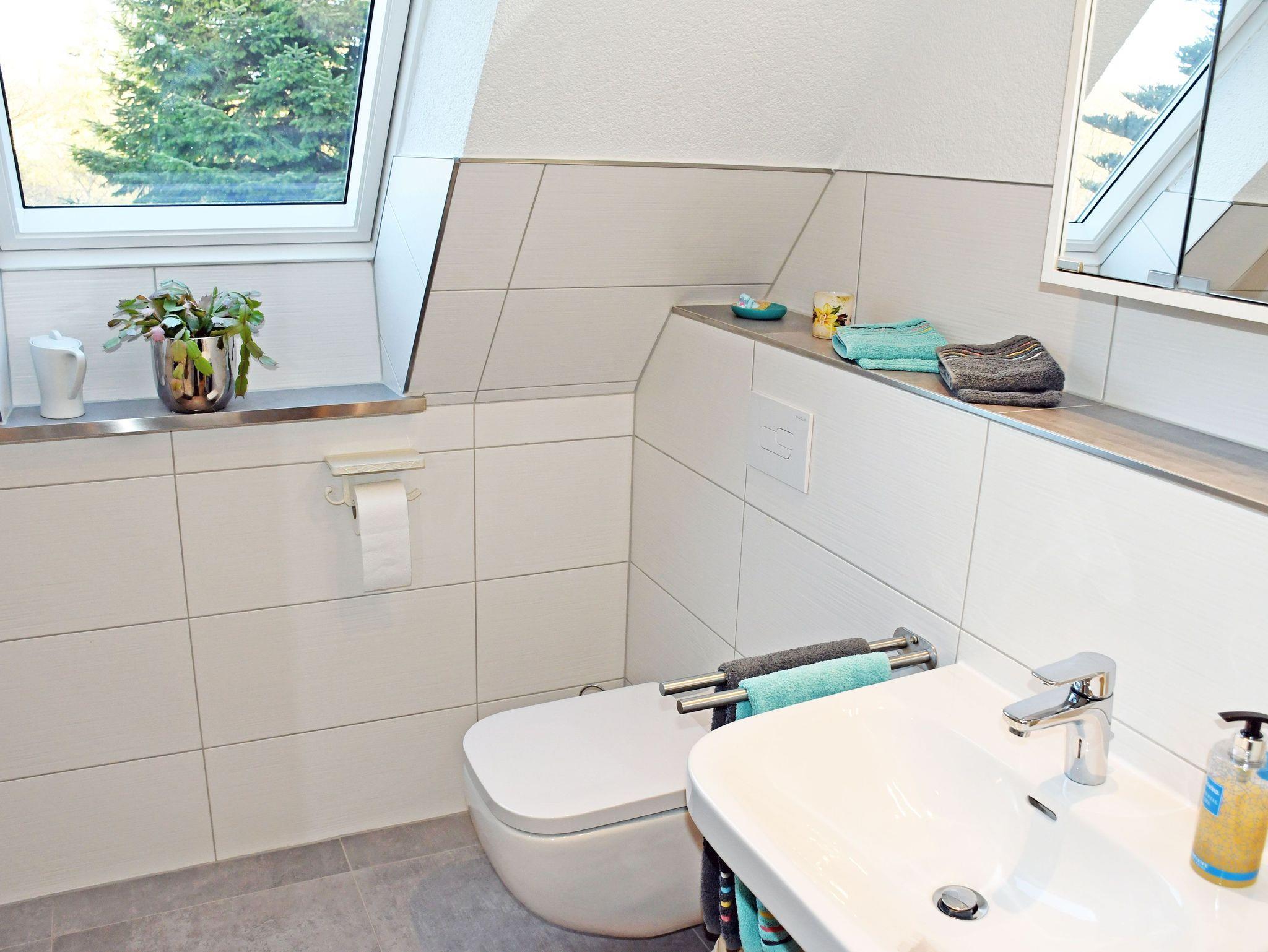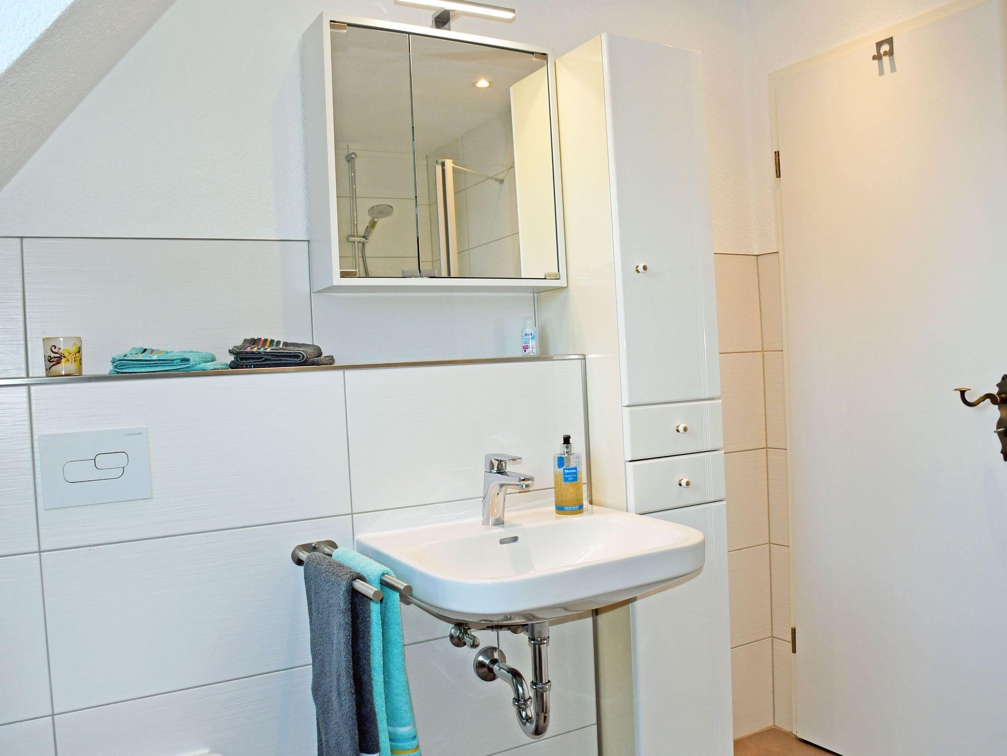 Das Bad ist mit Dusche, WC und Waschtisch ausgestattet und verfügt über Tageslicht.