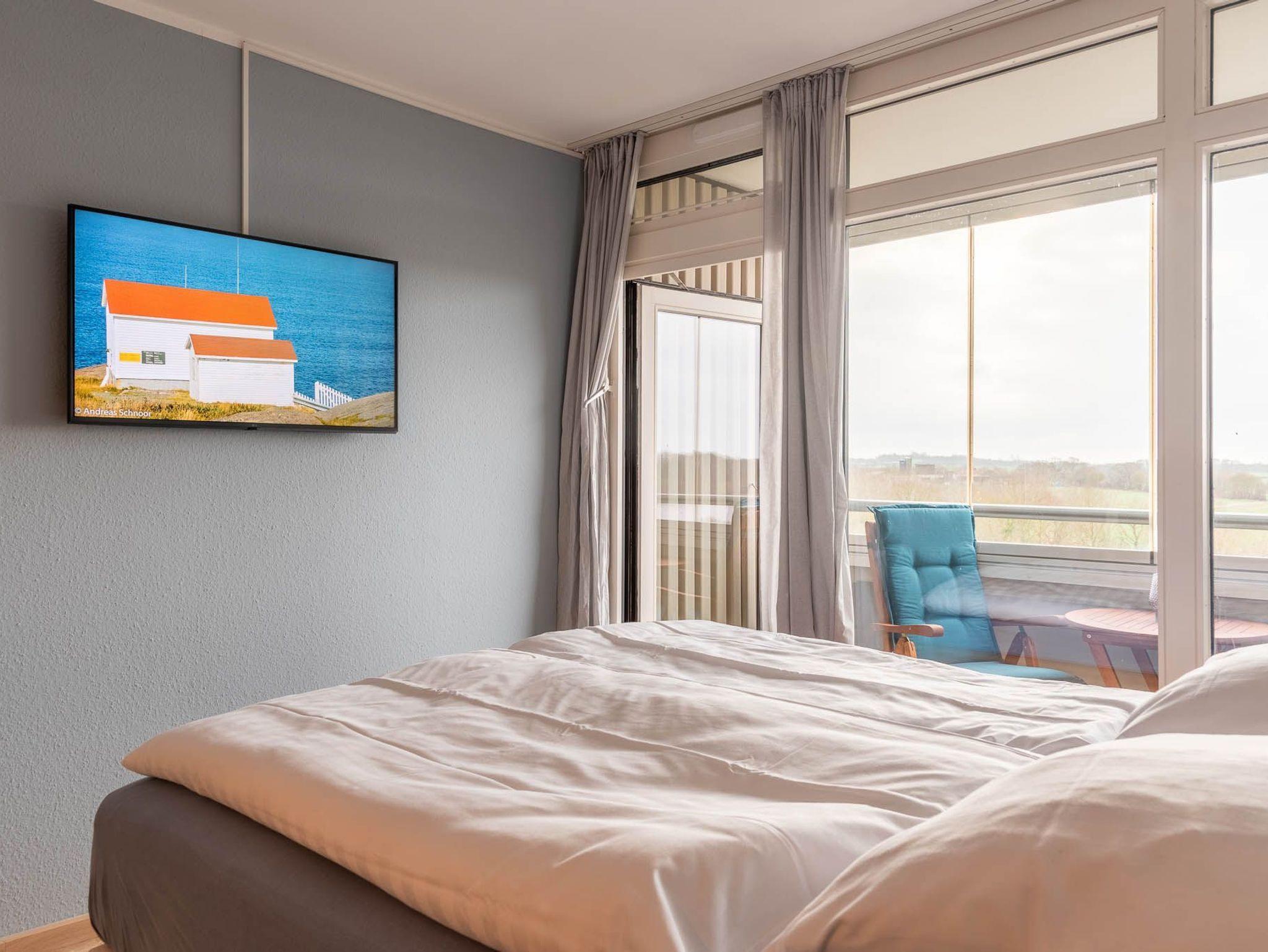 Im freundlichen Appartment befindet sich ein bequemes Boxspringbett (Liegefläche von 160x200 cm). An der Wand gegenüber ist ein LCD- Fernseher angebracht.