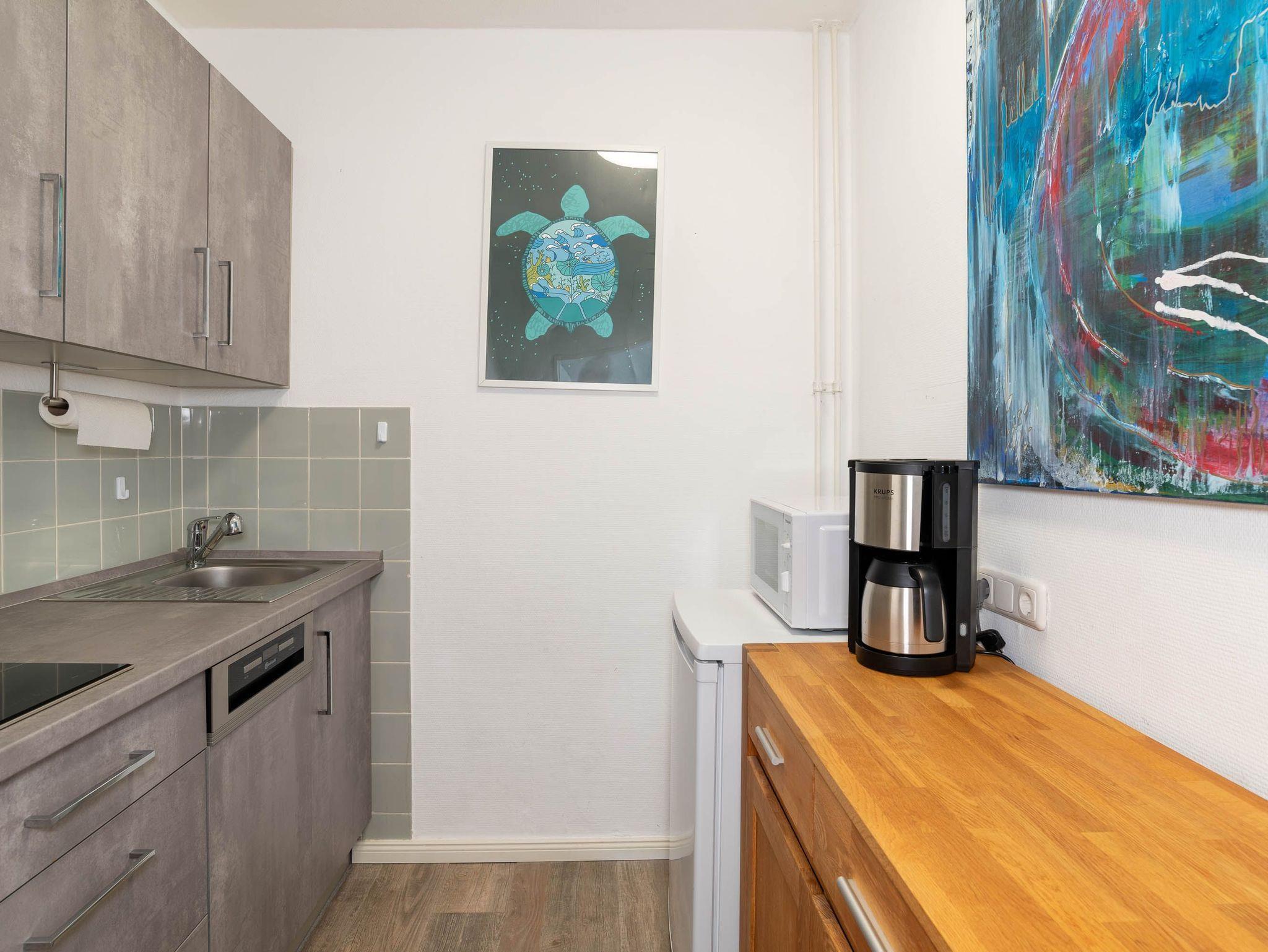 Im Eingangsbereich bietet ein Einbauschrank genügend Staumöglichkeiten für den Aufenthalt. Vom Flur aus gelangen Sie direkt in die Küche. Die offene Einbauküche besticht mit ihrer guten Ausstattung: Ein Geschirrspüler, ein Kühlschrank, sowie ein Induktionskochfeld mit zwei Kochfeldern findet sich in der modernen Küchenzeile. Auch eine Kaffeemaschine, einen Toaster, einen Wasserkocher und eine Mikrowelle finden Sie hier in der Grundausstattung.