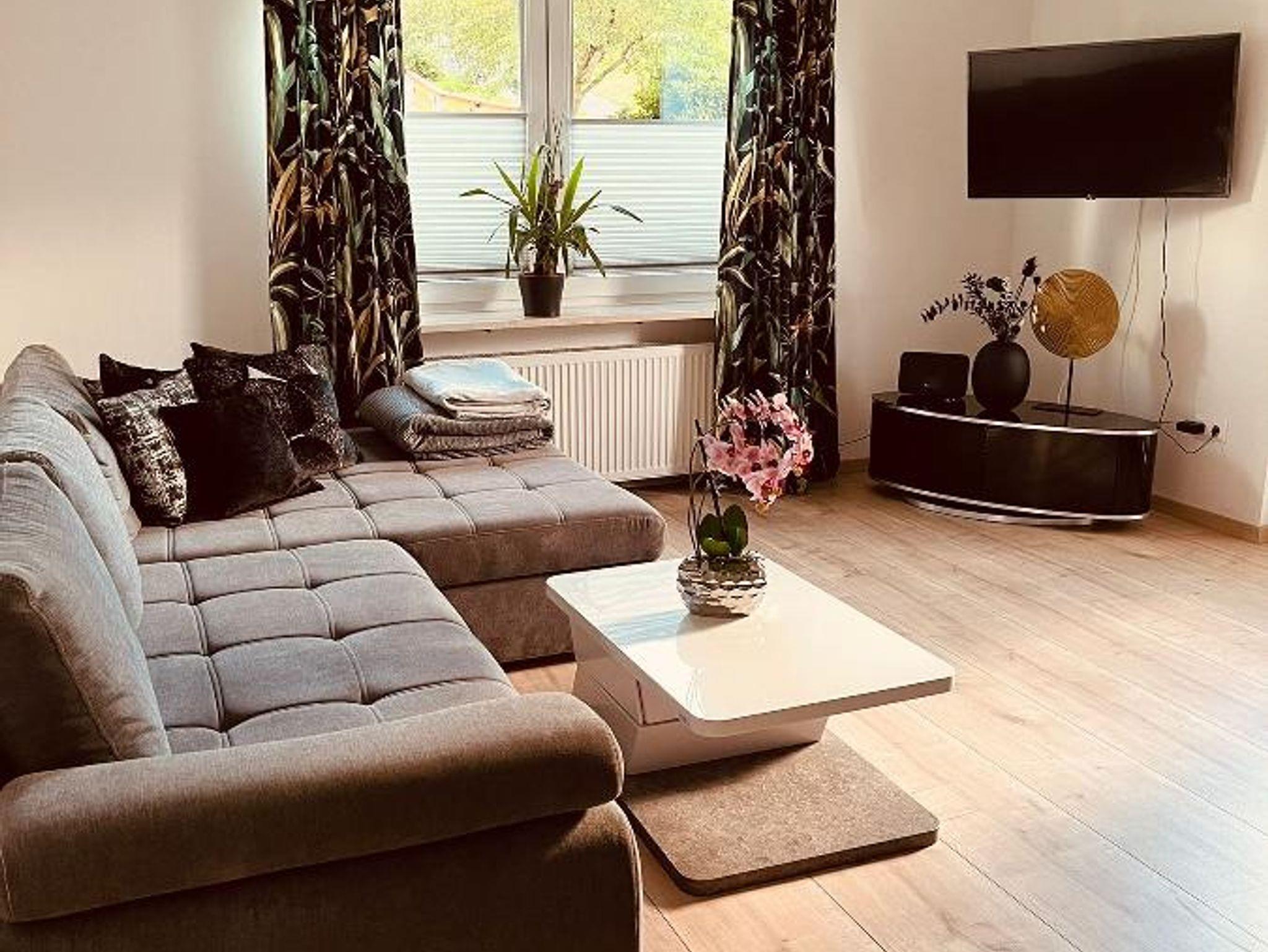 Wohnraum mit bequemer Couchgarnitur (ausziehbar) und Essecke.