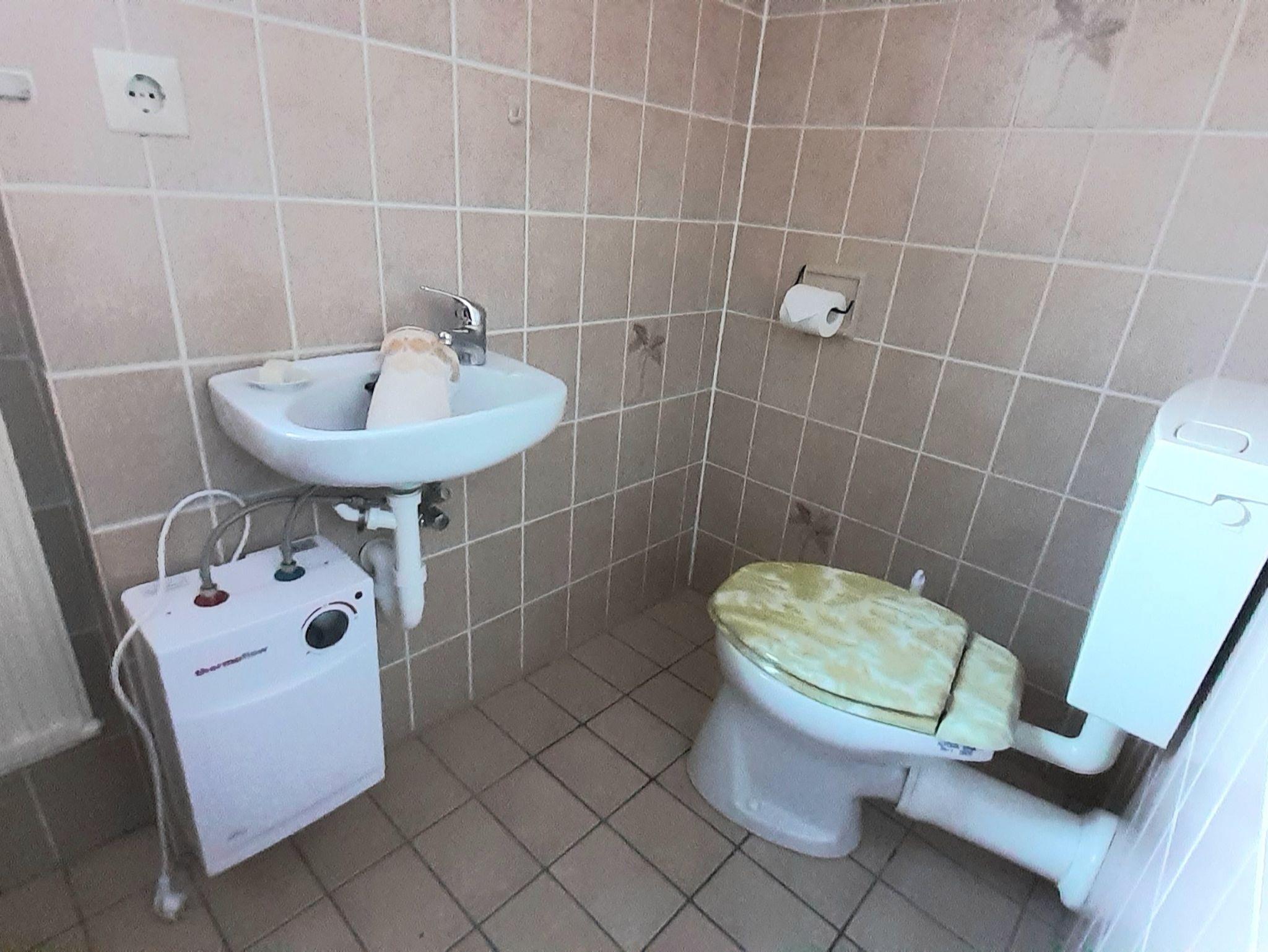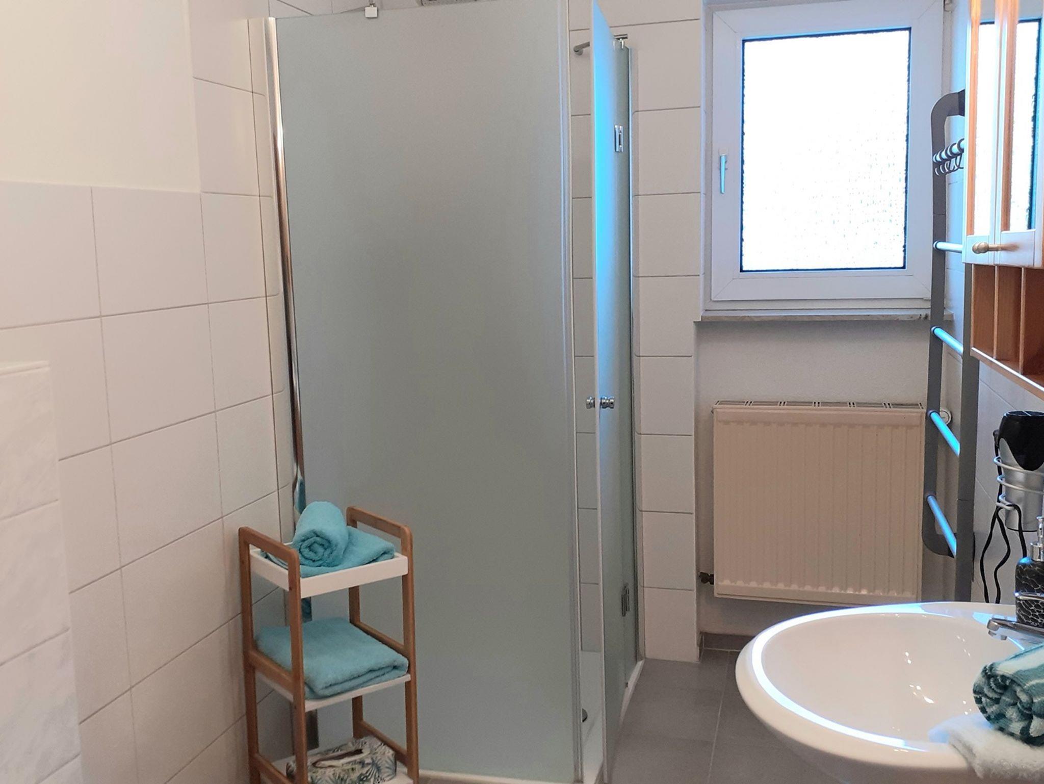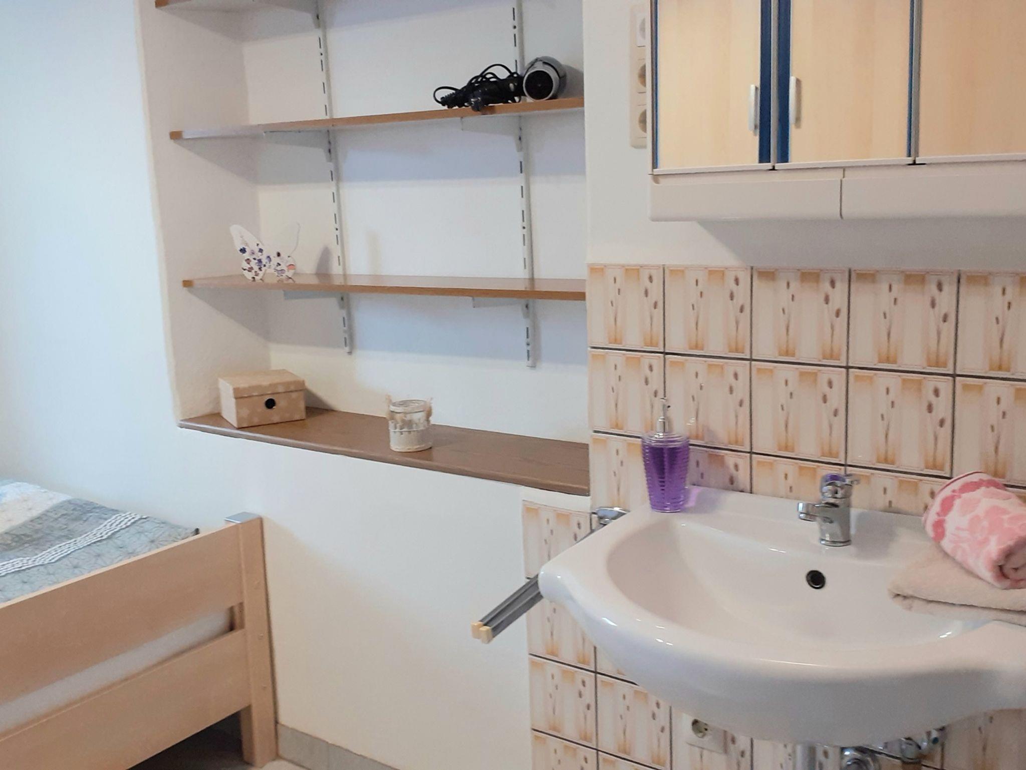Ein Bad mit Dusche, WC, Clopapier, zwei Waschbecken, Waschmaschine und Waschpulver sind vorhanden. Ein weiteres WC befindet sich im Flur außerhalb der Wohnung.