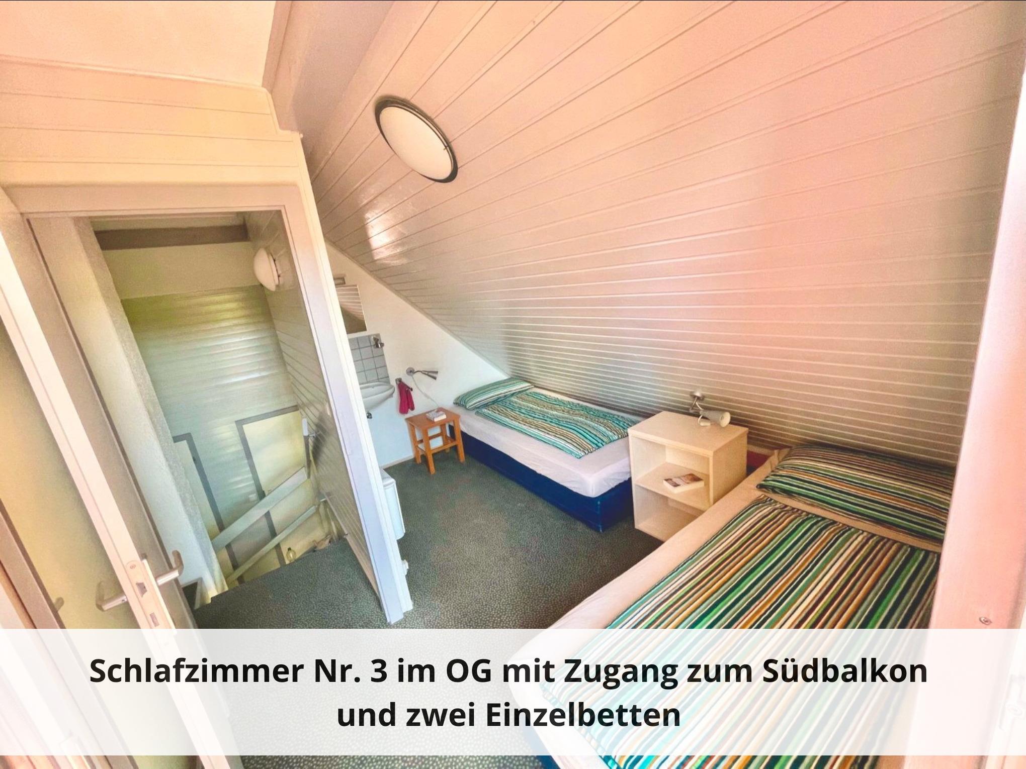 Die drei Schlafzimmer bieten zusammen 6 Betten, davon zwei Schlafzimmer mit Doppelbett und ein Schlafzimmer mit zwei Einzelbetten. Jedes Bett verfügt über eine USB-Steckdose. Die beiden Schlafzimmer im Dachgeschoss haben jeweils ein zusätzliches Waschbecken und direkten Zugang zum Süd-Balkon. Für die ganz Kleinen steht ein Babybett bereit.