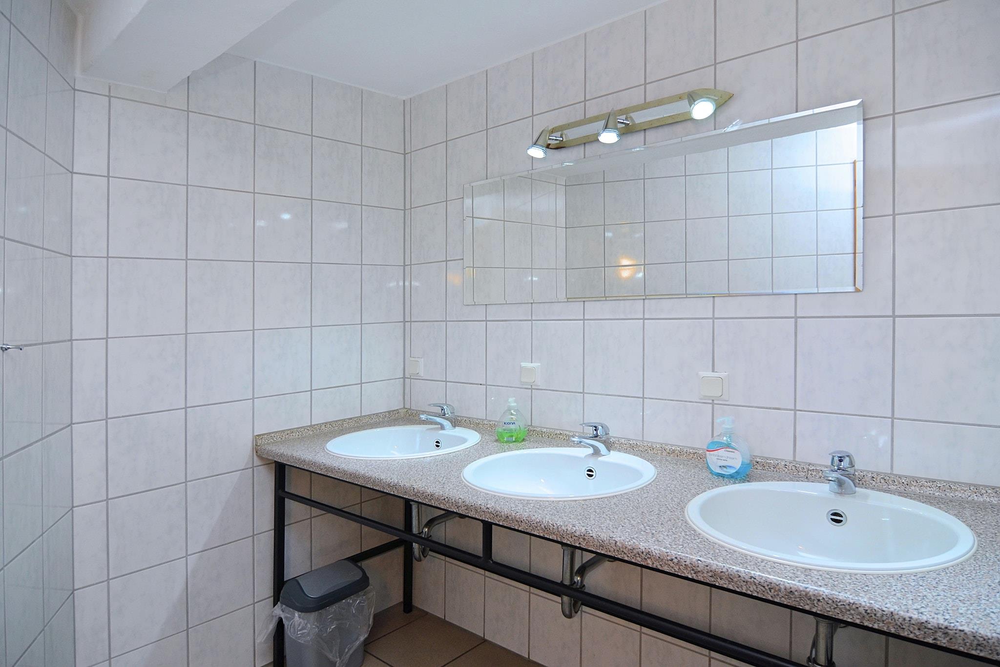 Parterre: (Eingang, Esszimmer(3x Esstisch(30 Personen)), Küche(Radio, Kochherd(5 Kochplatten, Ceranfeld), Kaffeemaschine(Filter), Backofen, Mikrowelle, Spülmaschine, Kühlschrank(+ Gefrierfach)), Toilette(Waschbecken, Toilette, Urinal), Flur(Herd(Holz)), Gemeinschaftsraum(Herd(Holz), Bar), Sauna(gegen Gebühr)(Dusche)) In der 1. Etage: (Schlafzimmer(Etagenbett), Schlafzimmer(Schlafcouch 1 Pers., Etagenbett), Schlafzimmer(3x Etagenbett), Schlafzimmer(3x Etagenbett), Schlafzimmer(4x Etagenbett), Schlafzimmer mit Badezimmer(Doppelbett, Dusche, Toilette), Badezimmer(2x Dusche, 3x Waschbecken), Badezimmer(2x Dusche, 2x Waschbecken), Toilette(Waschbecken, Toilette, Urinal), Toilette(Waschbecken, Toilette, Urinal)) In der 2. Etage: (Freizeitraum(Tischfußball), Gemeinschaftsraum) Kaminofen, Bar, Spülmaschine, Sauna, Waschmaschine, Heizung, Terrasse(alleinige Nutzung, 30 m2), Garten(alleinige Nutzung, teilweise umzäunt, 600 m2), Fahrradabstellraum, Gartenmöbel, Grill(Holzkohle), Parkplatz, Sonnenschirm, Hochstuhl, Gesellschaftsspiele