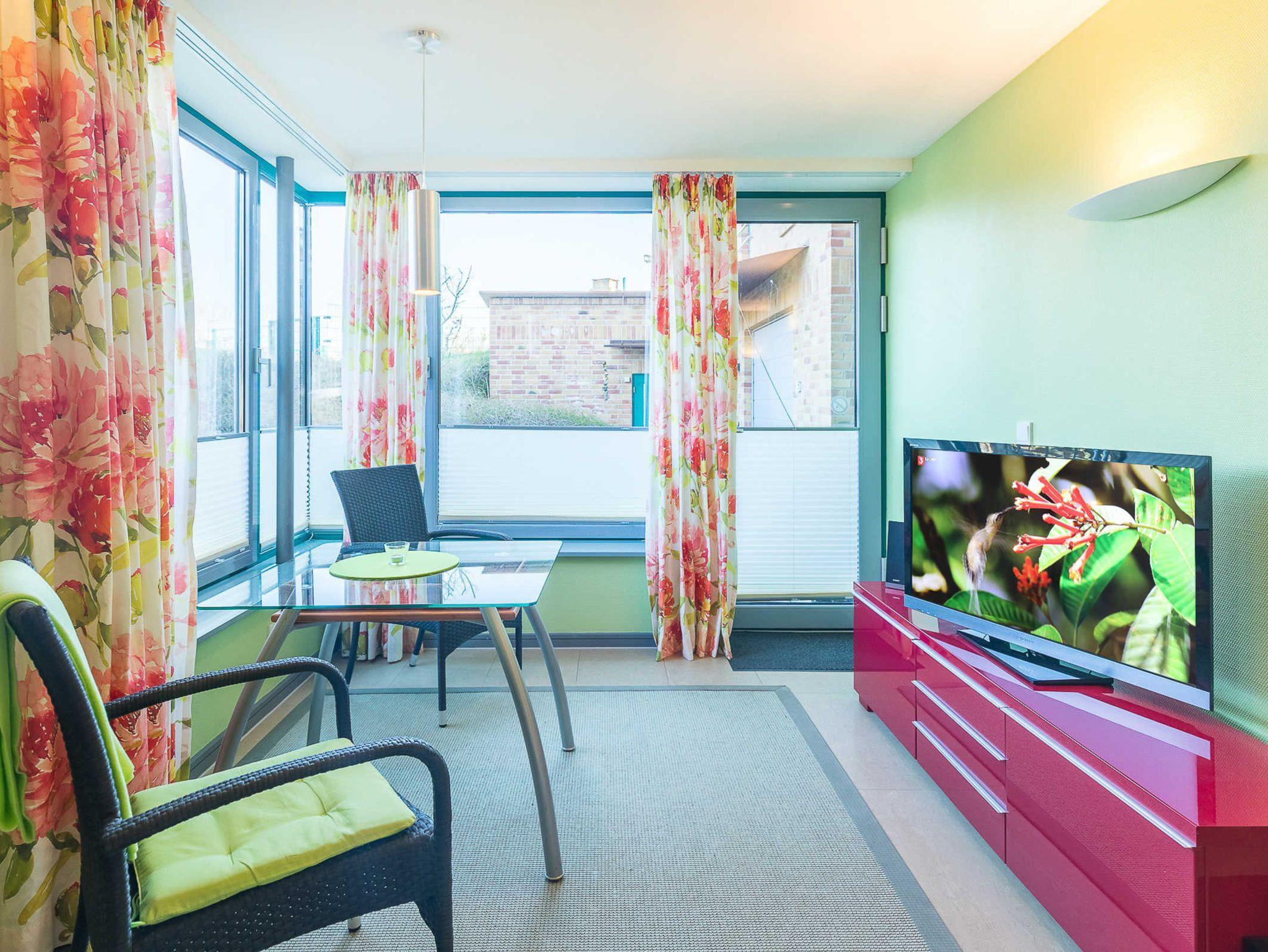 Wenn Sie das Appartement betreten, werden Sie von einer Sitzecke mit TV-Bereich (Sat-LCD-TV) empfangen. Hier können Sie gern auch Ihre Mahlzeiten einnehmen.