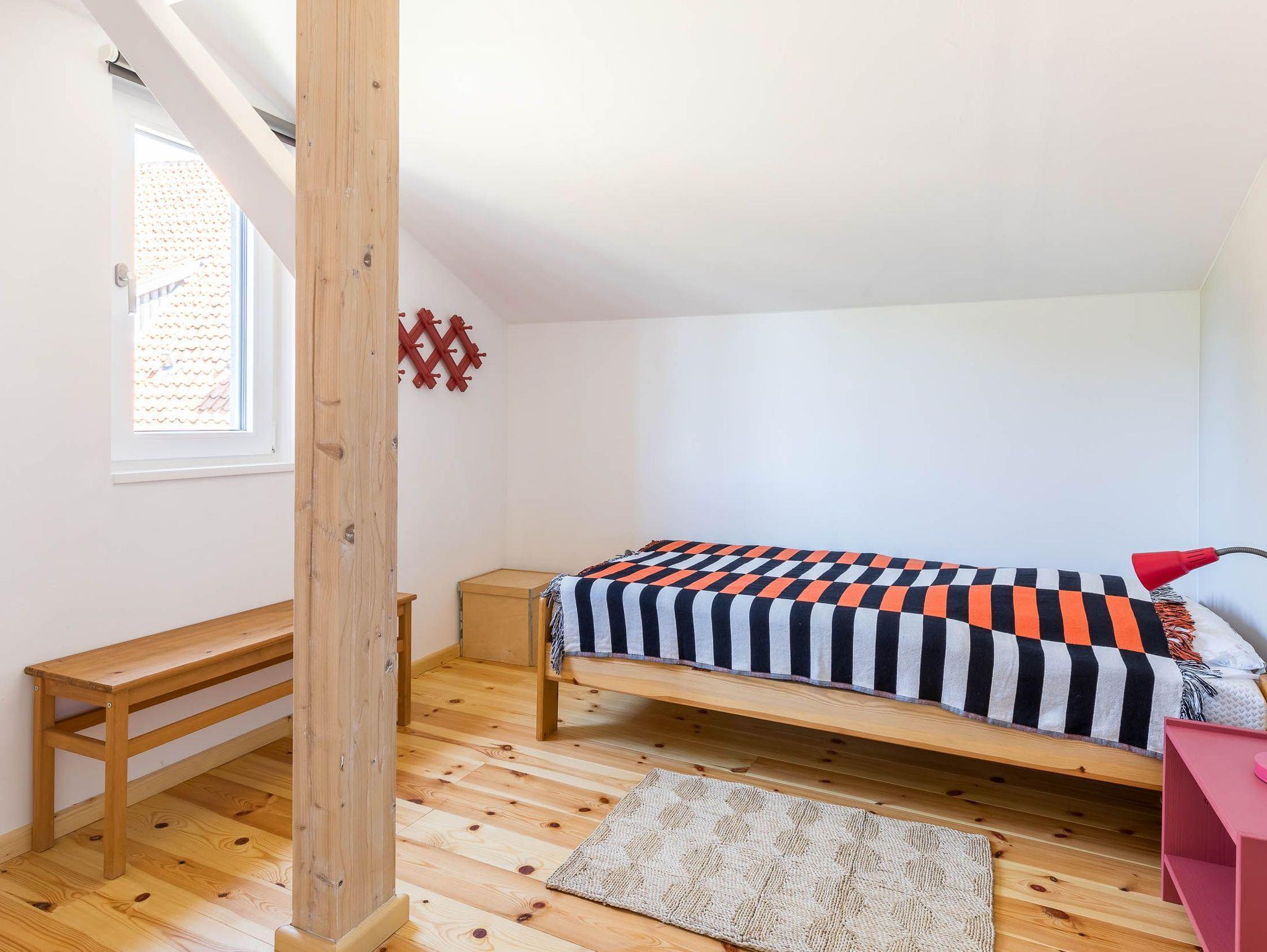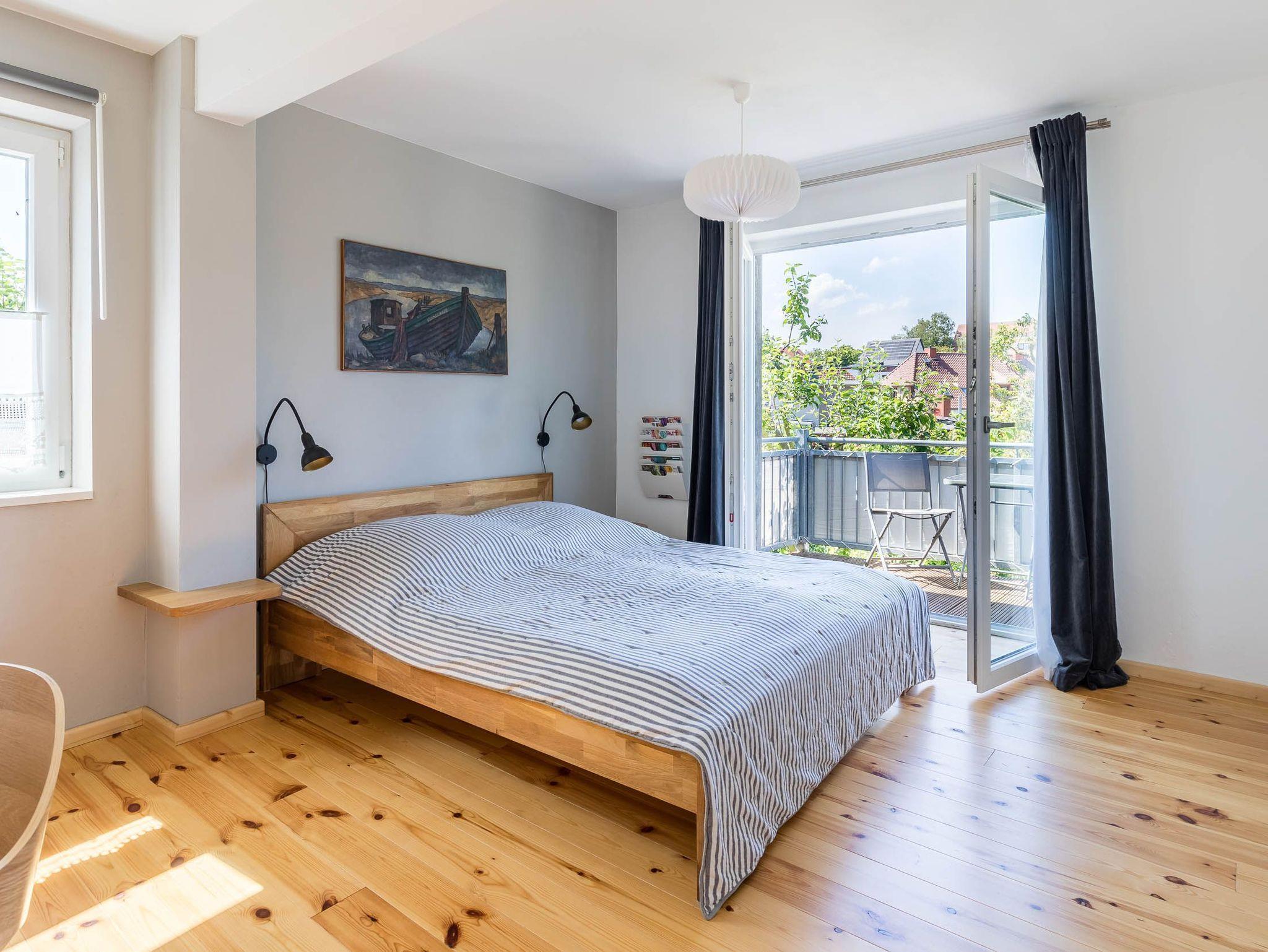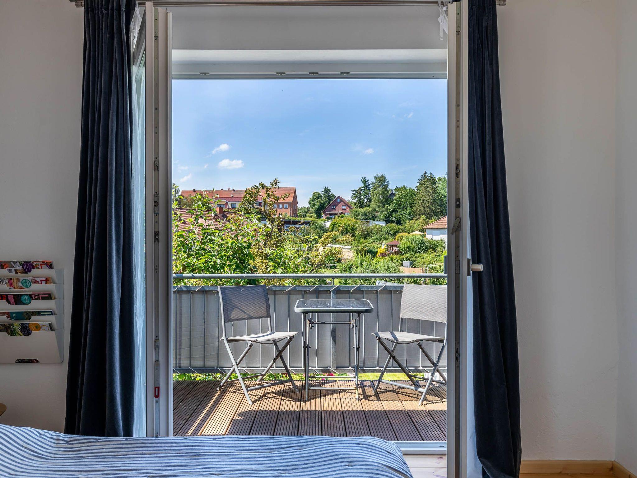 Das Hauptschlafzimmer (160 x 200 cm) bietet ein großes Einbauregal, einen kleinen Schreibtisch und einen Zugang zum großen Balkon (Südseite) mit weitem Blick ins Grüne.