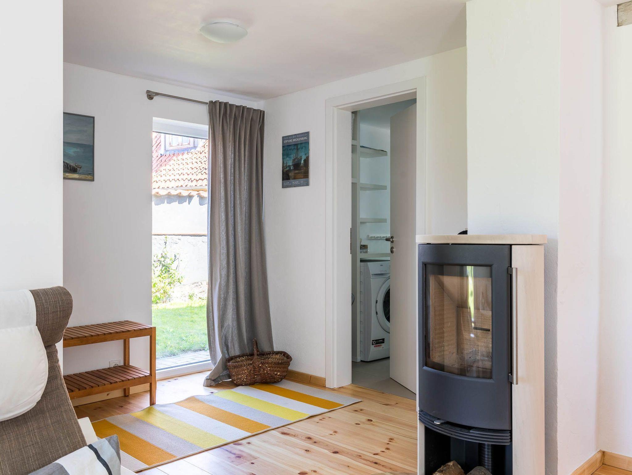 Ein Kamin sorgt für Gemütlichkeit, ein direkter Zugang führt auf eine kleine, überdachte Terrasse und in den großen Garten zur alleinigen Nutzung. Früchte, Kräuter und Blumen für den Eigenbedarf inklusive.