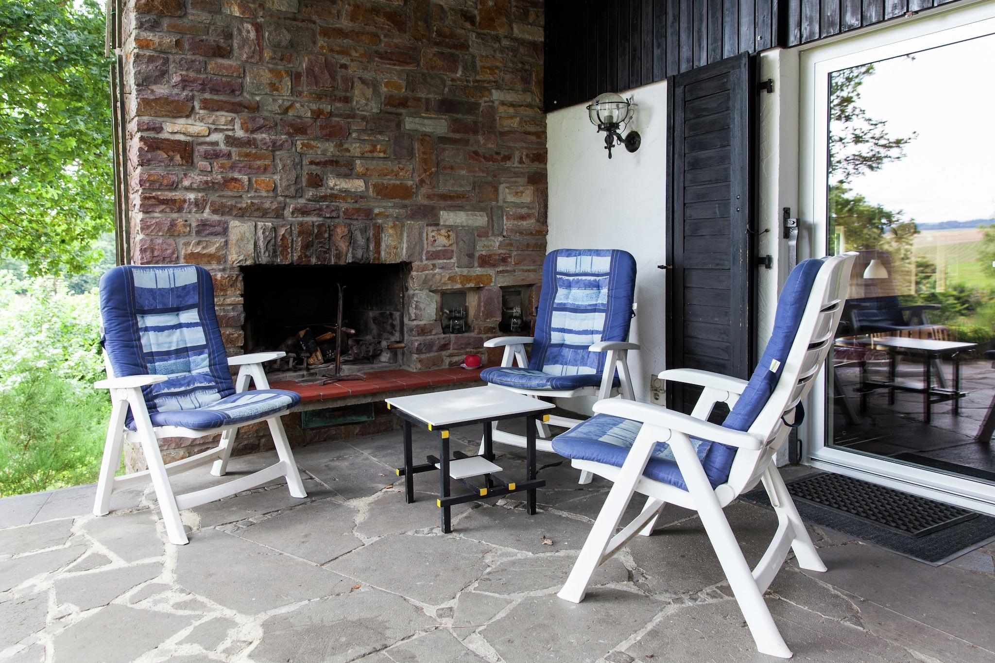 Parterre: (Aufenthaltsraum(Kaminofen, Radio, CD-Spieler, Stereoanlage), Fernsehzimmer(Doppelschlafcouch, TV(Satellit)), offene Küche(Esstisch, Bar(Esstheke), Wasserkocher, Kochherd(4 Kochplatten, elektrisch), Kaffeemaschine(Filter), Backofen, Mikrowelle, Spülmaschine, Kühl-/Gefrierkombination), Schlafzimmer(2x Einzelbett, Etagenbett), Schlafzimmer(2x Einzelbett), Badezimmer(Dusche(ebenerdige Dusche), Waschbecken, Toilette), Toilette) Souterrain: (Schlafzimmer(Doppelbett oder 2 Einzelbetten), Schlafzimmer(2x Einzelbett), Badezimmer(Dusche, Waschbecken, Toilette)) Kaminofen, Gartentüren, Balkon, Heizung(Holz), Terrasse(überdacht), Garten, Gartenmöbel, Grill, 4x Parkplatz, 2x Fahrräder verfügbar, Kinderbett, Hochstuhl