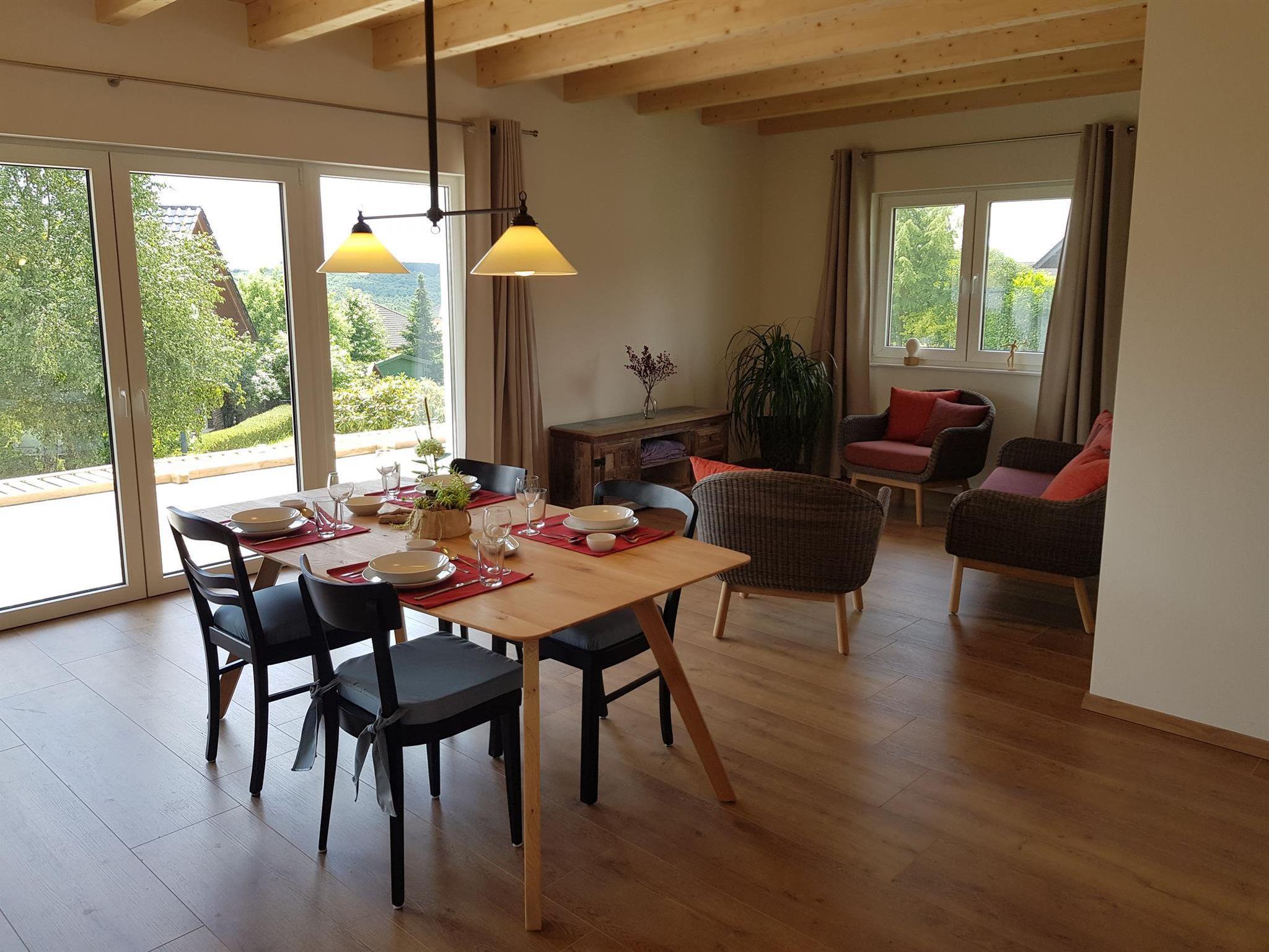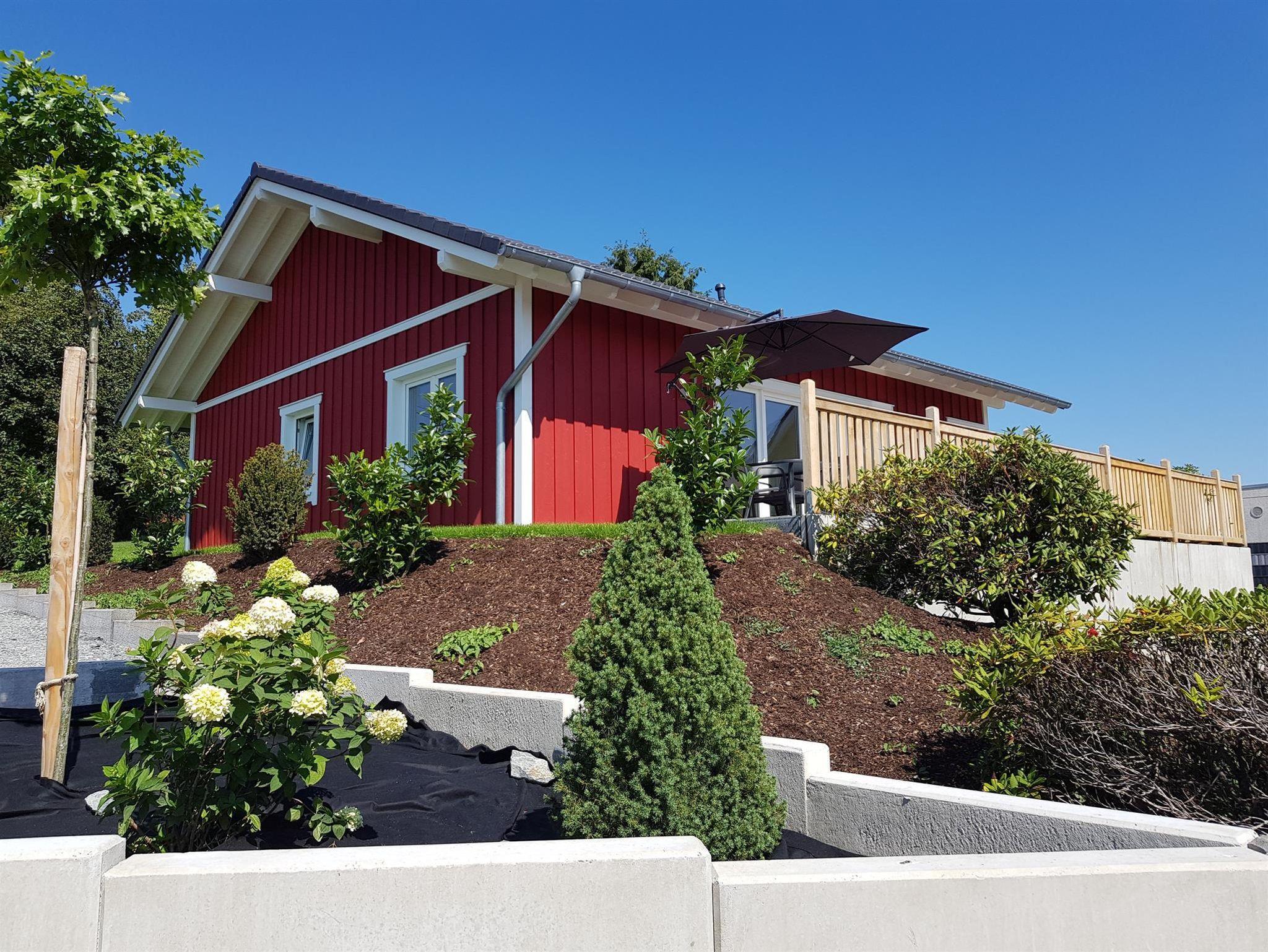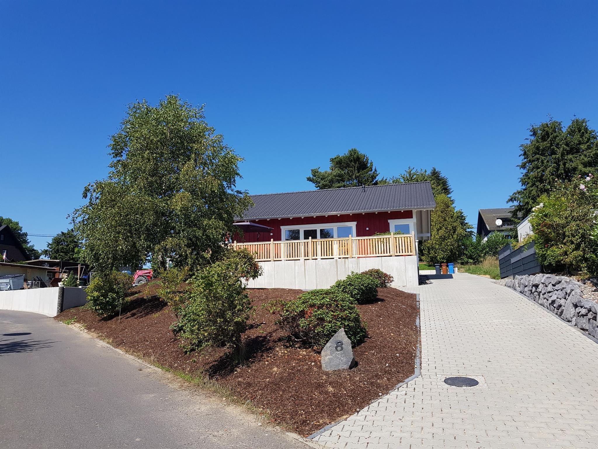 Das barrierefreie, ebenerdige, freistehende, 87 qm große Ferienhaus im skandinavischen Stil mit einer 40 qm großen Terrasse, ist umgeben von einem Garten. Die vier Meter lange Fensterfront zur Terrasse bietet Ihnen einen schönen Ausblick über das Wohngebiet und auf Felder und Wälder. Alle Räume haben eine separat regelbare Fußbodenheizung. 2019 wurde das Haus fertiggestellt. Lichtdurchflutete Räume voller Genuss und Leichtigkeit ermöglicht Ihnen Abstand zu nehmen von der Hektik und dem Stress des Alltags. Rollstuhl, Rollator.... sind ebenfalls willkommen. Die Türrahmen im Haus sind extra breit (1 Meter) und sehr hoch (2,10 Meter). Die Betten sind 2 Meter lang, haben kein Fussende und bieten damit auch für große Menschen bequem Platz. Auch die 40 qm große Terrasse ist barrierefrei zugänglich. Ein schnelles WLAN ist selbstverständlich im Haus und auch auf der Terrasse verfügbar. Via Internet-TV mit exzellenter Bildauflösung haben Sie Zugang zu allen gängigen Fernseh- sowie Radioprogrammen. Küche mit Vollausstattung und ein Hauswirtschaftsraum mit Waschmaschine, Wäschetrockner stehen Ihnen selbstverständlich kostenfrei zur Verfügung. Eine Ladestation für E-Autos und für E-Bikes stehen ab 2020 ebenfalls bereit. Das Bad bietet eine barrierefreie Dusche. Das Waschbecken ist ebenfalls barrierefrei, da ohne Unterschrank. Der Wandspiegel ist auch im Sitzen einsehbar.